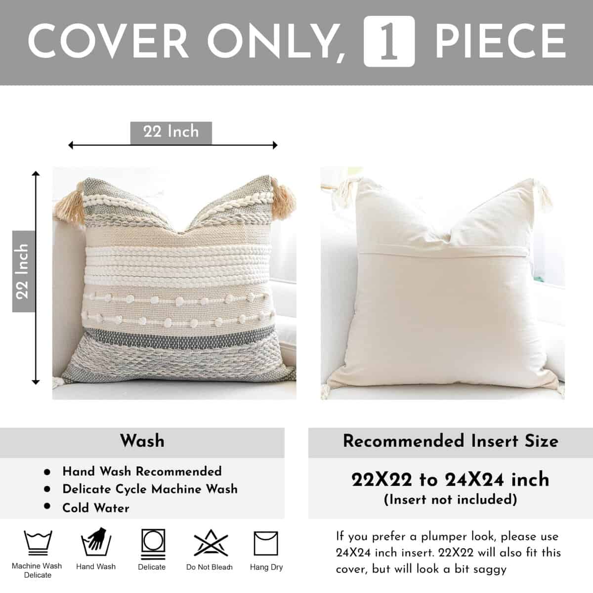 Funda de Almohada Gris Boho BlissBlush 22×22, Almohada