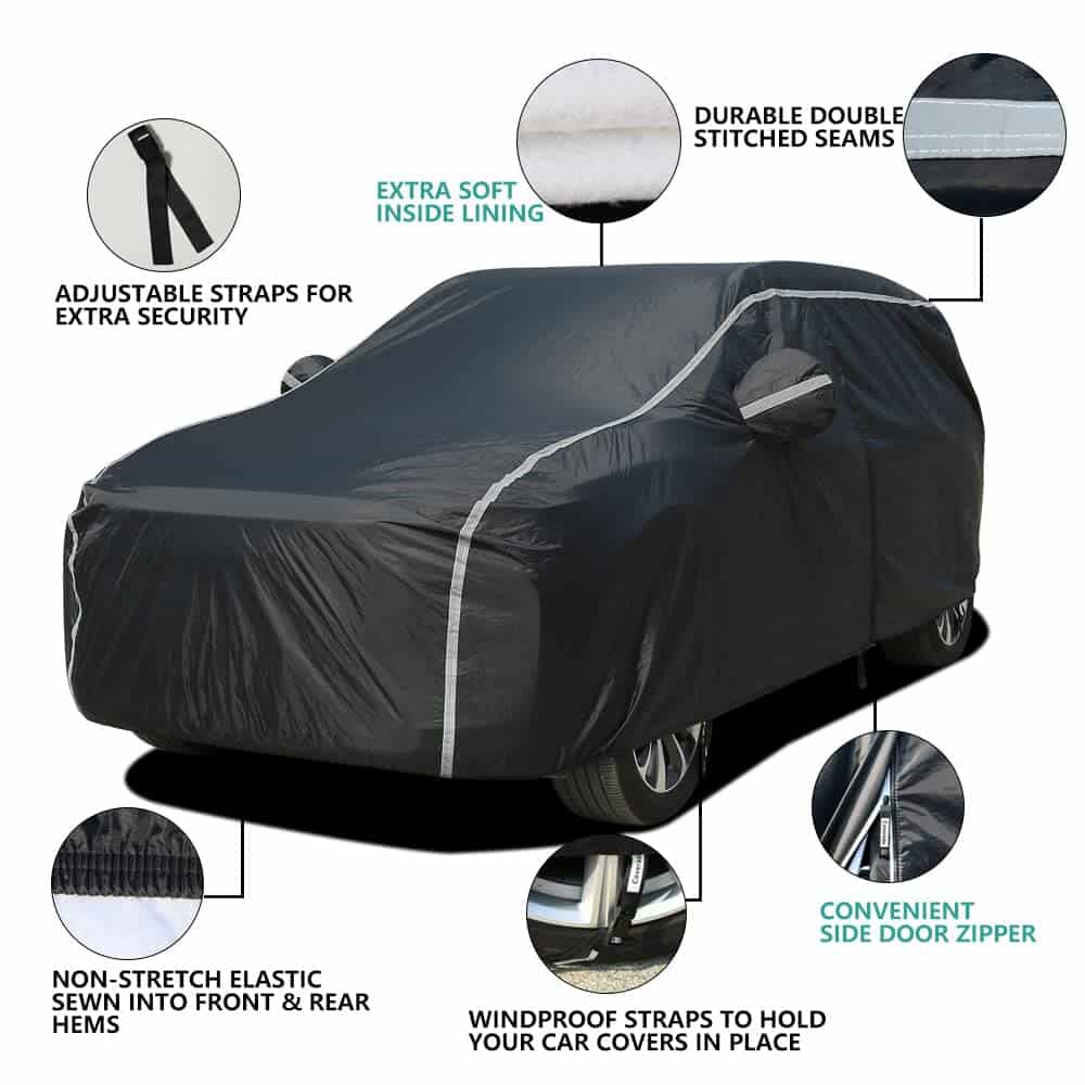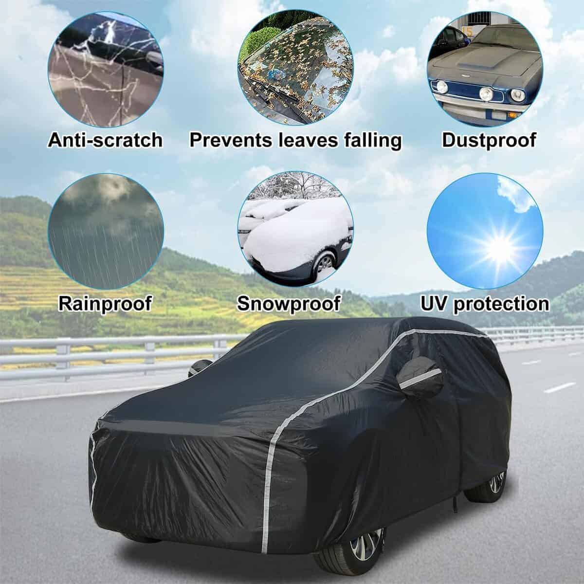 Funda de Coche Impermeable Coverado para Todo Clima está hecha de material 190T. 1. La capa exterior de la funda negra para coche es de poliéster altamente reflectante, que es bueno para la protección solar, bloquea eficazmente los rayos UV y evita que el interior envejezca. Mantiene tu coche fresco incluso en los días calurosos de verano. 2. La capa interior de la funda para coche es de algodón suave para proteger la pintura. 3. Recubrimiento impermeable de poliuretano en la superficie, resistente y resistente a las rasgaduras, a prueba de lluvia y nieve. La funda de coche Full Car Cover es perfecta tanto para uso en interiores como en exteriores. El material resistente mantiene su coche seguro de los rayos UV, la nieve, la escarcha, la lluvia, la arena, el polvo y las hojas. Esta funda de coche para la nieve es fácil de instalar, se pliega y se guarda en la bolsa de almacenamiento incluida después de quitarla, ahorrando espacio y facilitando su transporte.