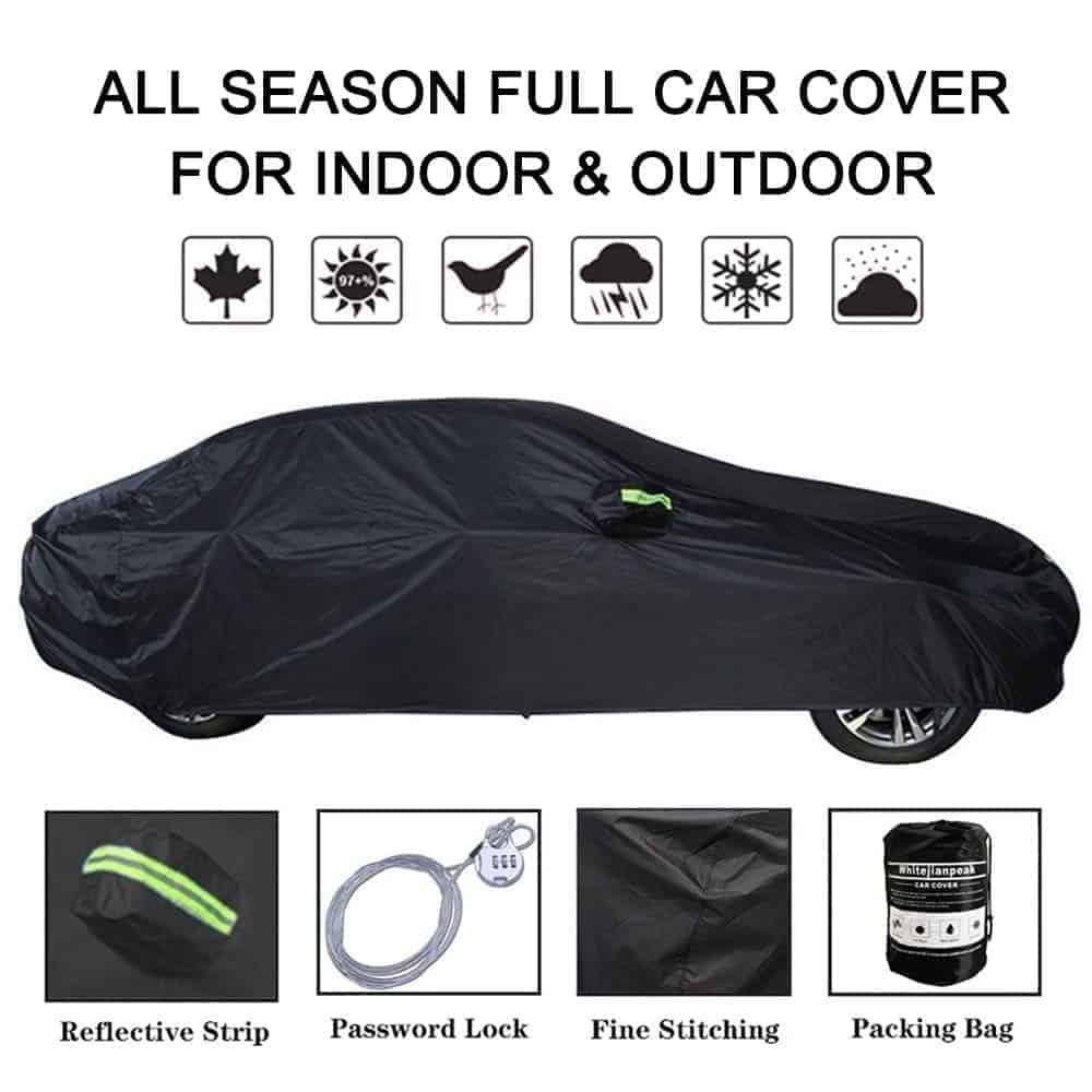 La cubierta Whitejianpeak ofrece una protección completa para su automóvil durante todas las estaciones y todos los tipos de clima, protegiendo la pintura, la carrocería y el acabado del vehículo de contaminantes, excrementos de pájaros, polvo, arañazos, daños solares, lluvia, nieve, viento y tormentas. Es ideal tanto para automóviles guardados en almacenamiento como para vehículos estacionados en exteriores. Además, ofrecemos servicios personalizados para adaptar la cubierta a sus necesidades. Contáctenos para más información
