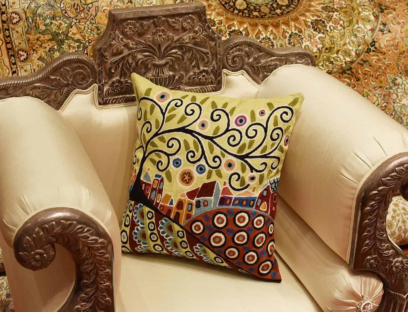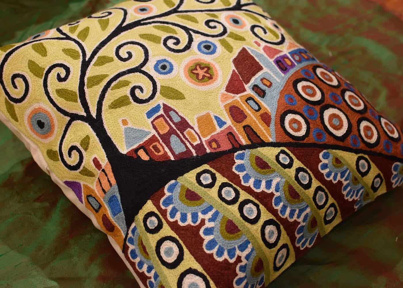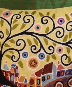Lleva la belleza y la energía de la naturaleza a tu hogar con esta maravillosa funda de cojín amarilla con diseño de Árbol de la Vida de Kashmir Designs. Esta funda de almohada está decorada con un hermoso diseño floral de Karla Gerard en tonos dorados. Hecho a mano con bordado de lana, este cojín es perfecto para añadir un toque de color y vida a tu sala de estar o dormitorio. ¡Renueva la decoración de tu hogar con esta increíble funda de cojín!