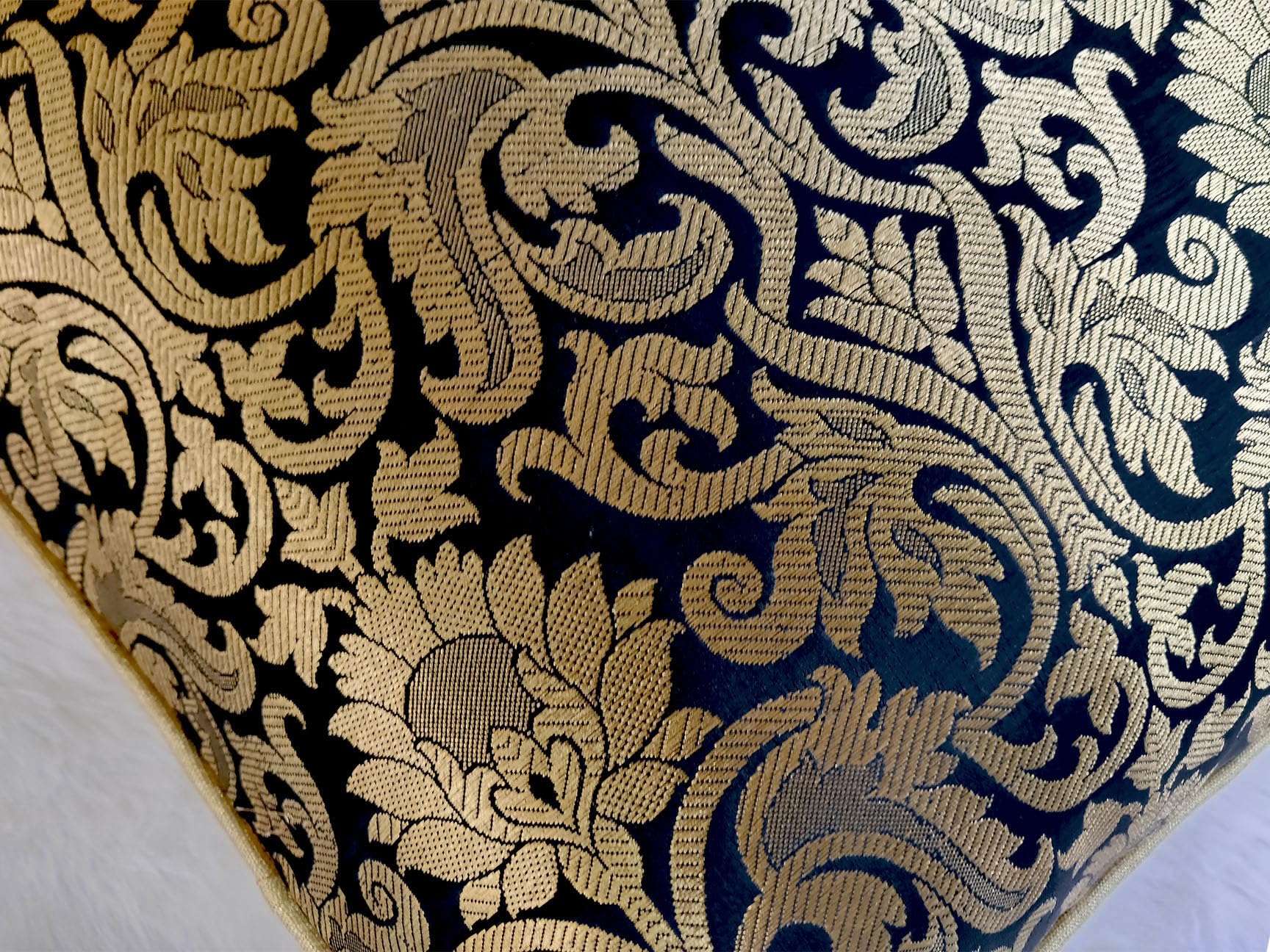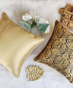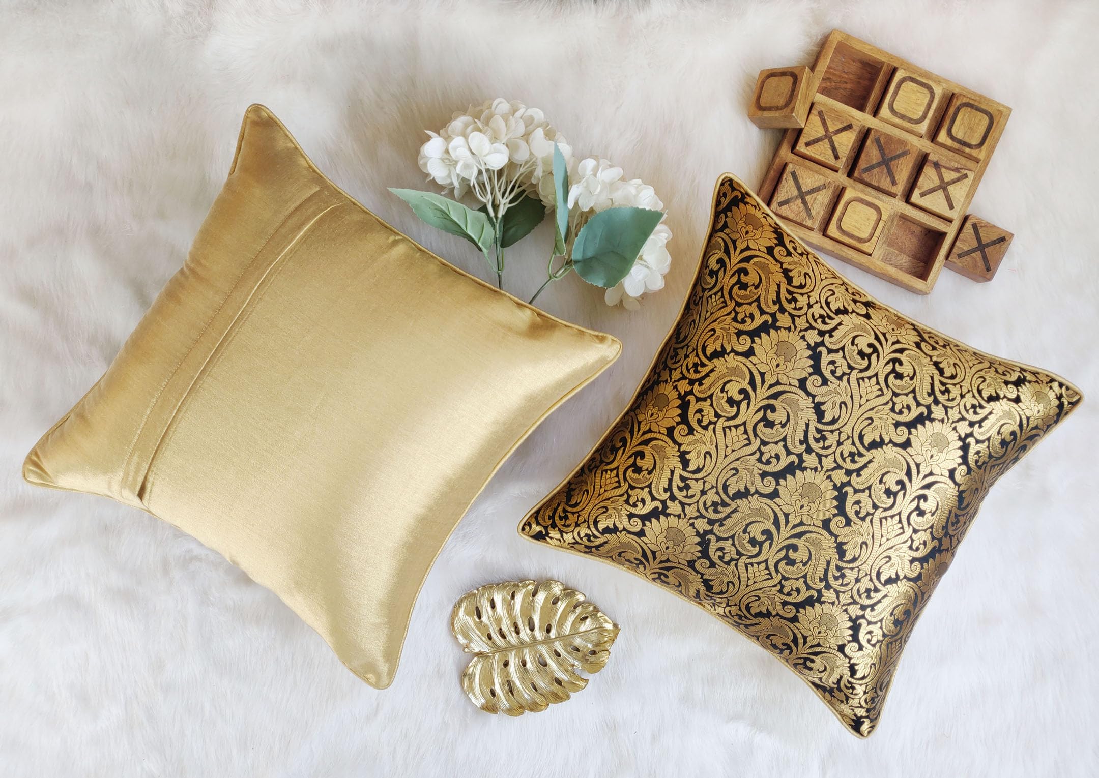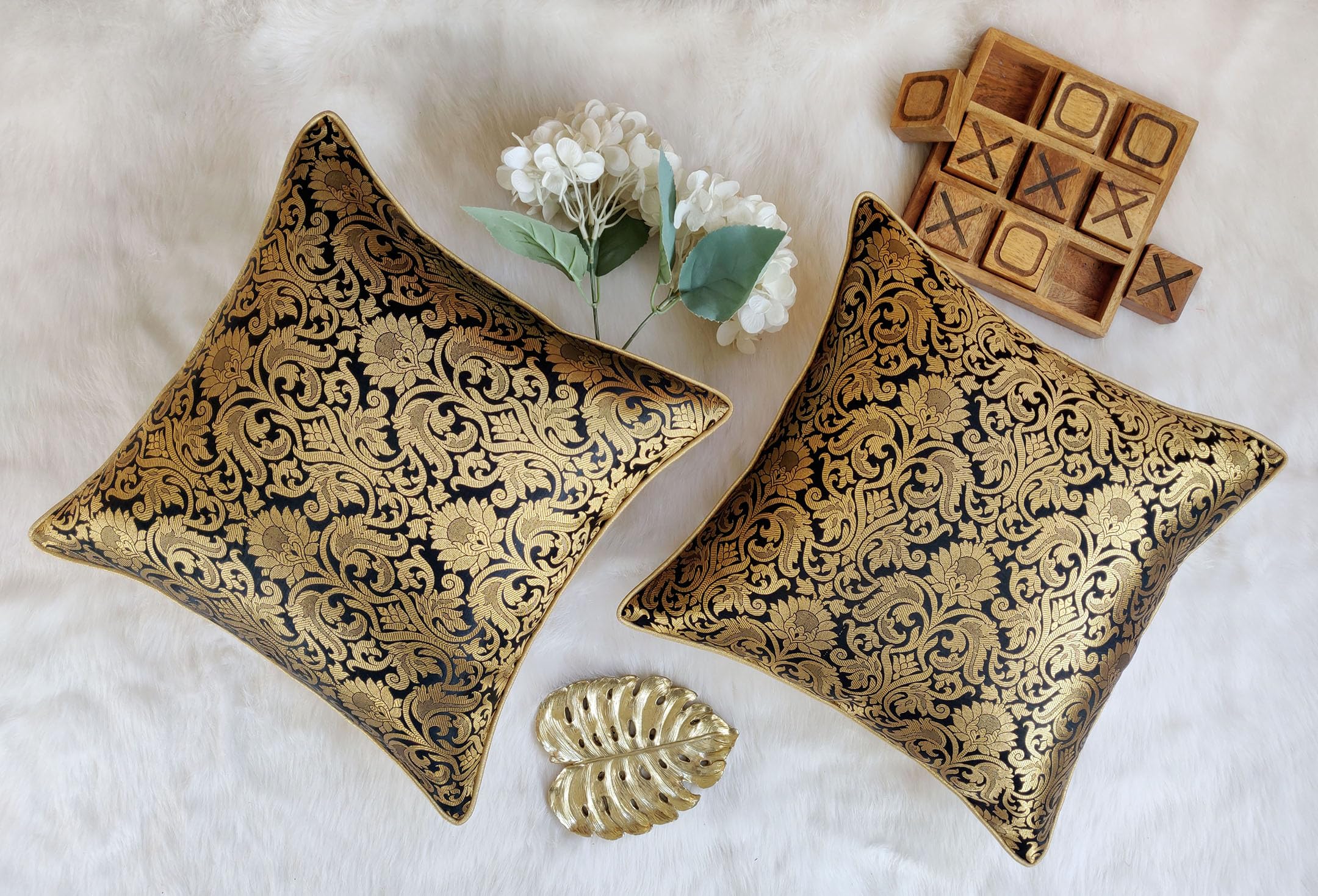 Estas lujosas fundas de cojín están hechas de tela de brocado de seda banarasi de alta calidad. Obtienes 2 fundas de cojín. Lava a mano estas fundas de cojín en agua fría con un detergente suave / Limpieza en seco. Esta es una tela de brocado de seda poliéster. El frente de la funda de cojín es de brocado mientras que la parte trasera es una tela dorada sólida coordinada. Hay un ribete dado en los cojines de la tela trasera. El forro está en toda la funda de cojín de brocado asegurando una larga vida. El relleno no está incluido. Se pueden utilizar como fundas de cojín decorativas para el dormitorio, sala de estar, habitación de invitados u cualquier otra habitación. Perfecto para la cama, sofá, sillón, silla o banco. Acentúa cualquier habitación con estas fundas de cojín de decoración del hogar indio. ¿Tienes una fiesta de henna o una boda india o es Diwali o Holi? Decora tu casa con un toque indio. ¡Genial regalo para mamá, hermana, inauguración de la casa, Navidad, cumpleaños, etc.}