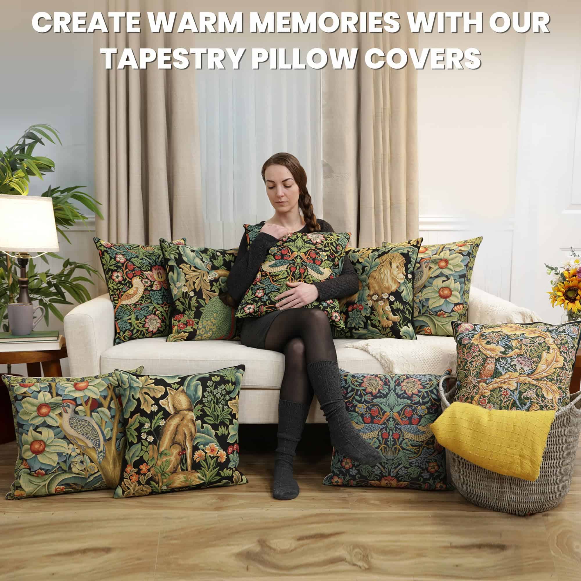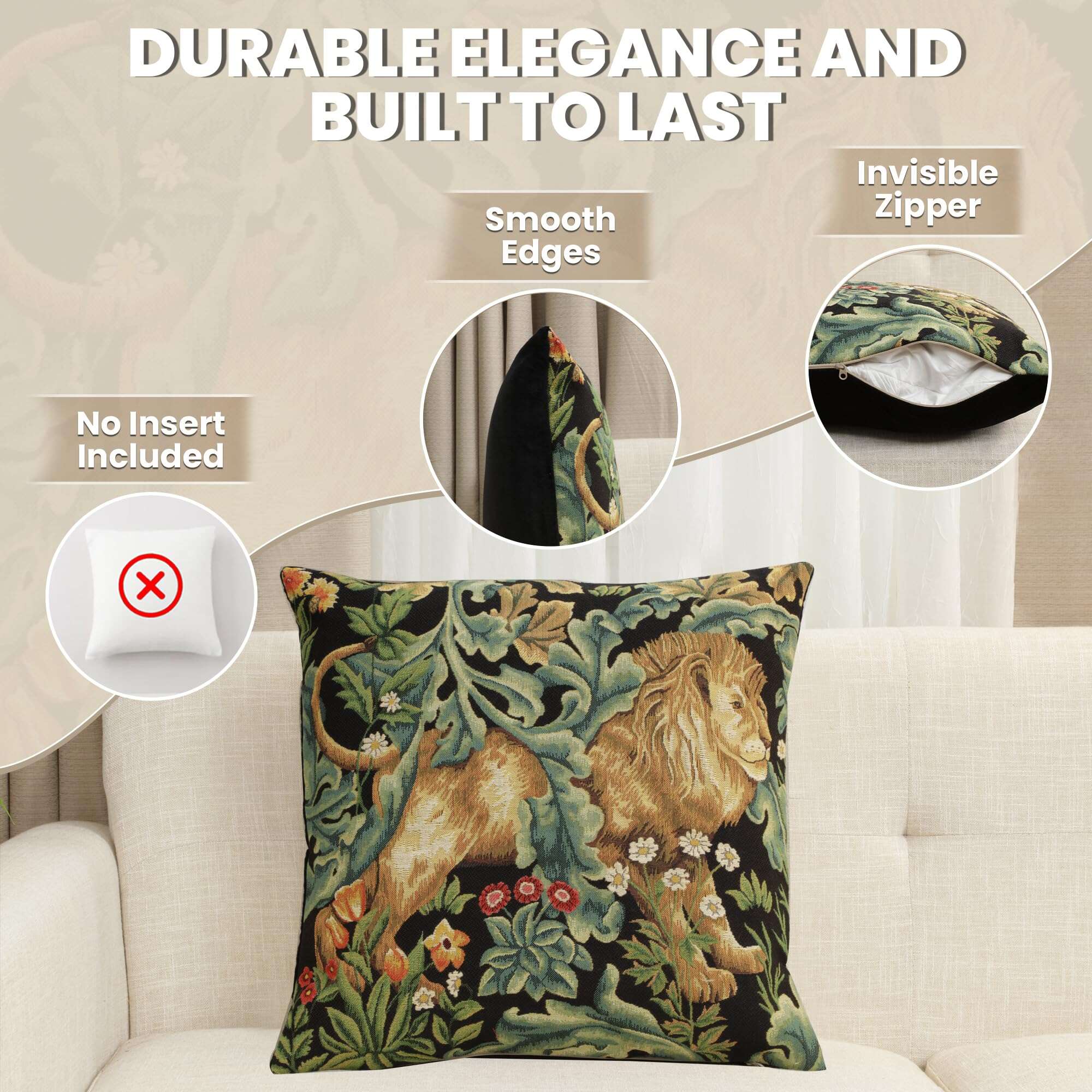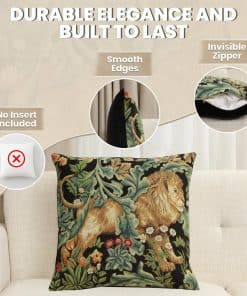 Funda de cojín decorativa de Charlotte Home Furnishings, fundas de almohada boho para sofá, sala de estar, fundas de cojín cuadradas con diseño de león negro de 18×18 pulgadas, tejido jacquard europeo de algodón para decoración acogedora en dormitorio. Cada funda de cojín es una obra de arte, con diseños inspirados en el icónico diseñador textil William Morris. Inspirados en la belleza de la naturaleza y la rica herencia de las artes y los oficios, los motivos presentan patrones intrincados que aportan una sensación de calma y serenidad a tu hogar, creando un santuario de comodidad y estilo. Combinando tradiciones históricas del diseño textil con sofisticación contemporánea, estas fundas de cojín para sofá ofrecen una elegante decoración del hogar. Las fundas de almohada están hechas de tela jacquard tejida de alta calidad, 100% algodón para una comodidad extrema y durabilidad. Los diseños están tejidos con precisión utilizando los colores más vibrantes. Las cremalleras están ocultas y las costuras de sobrehilado crean una apariencia de sofisticación mientras proporcionan durabilidad para cualquier decoración del hogar. Nuestra funda de cojín de tapiz es perfecta para la siesta, acurrucarse o como respaldo al leer. La funda de cojín de lanza agrega atractivo y encanto a cualquier espacio, ya sea colocado en una cama, un columpio acogedor, un sofá, un asiento junto a la ventana o en un entorno de oficina. Nuestras almohadas para sofá de sala de estar combinan sin esfuerzo tanto con interiores contemporáneos como tradicionales. Se recomienda utilizar un inserto de almohada de 18″ x 18″ para una funda de almohada de 18 x 18, sin embargo, se puede utilizar un tamaño de hasta 20″ x 20″ dependiendo de la calidad del inserto. Debido a que las fundas de almohada se cortan y cosen a mano, puede haber una variación de 0.4″ a 0.8″ en los tamaños de las fundas de almohada del sofá. Recomendamos la limpieza en seco profesional para nuestras almohadas decorativas. Para garantizar el mejor mantenimiento, mantener alejado del sol y usar un planchado medio en la parte delantera. Tenga en cuenta que debido a variaciones en las resoluciones de pantalla, pueden haber pequeñas variaciones de color en las fundas de cojín boho.