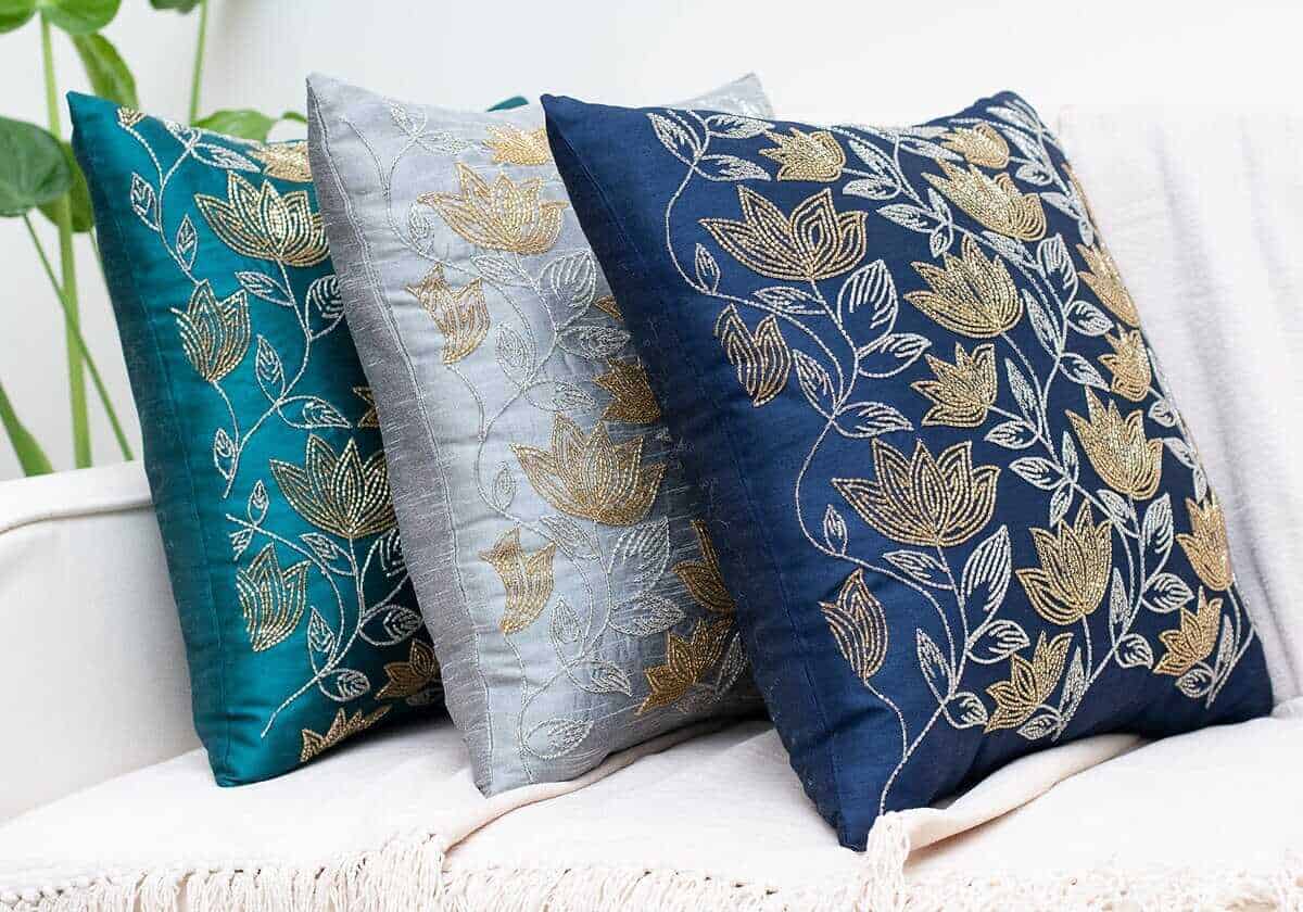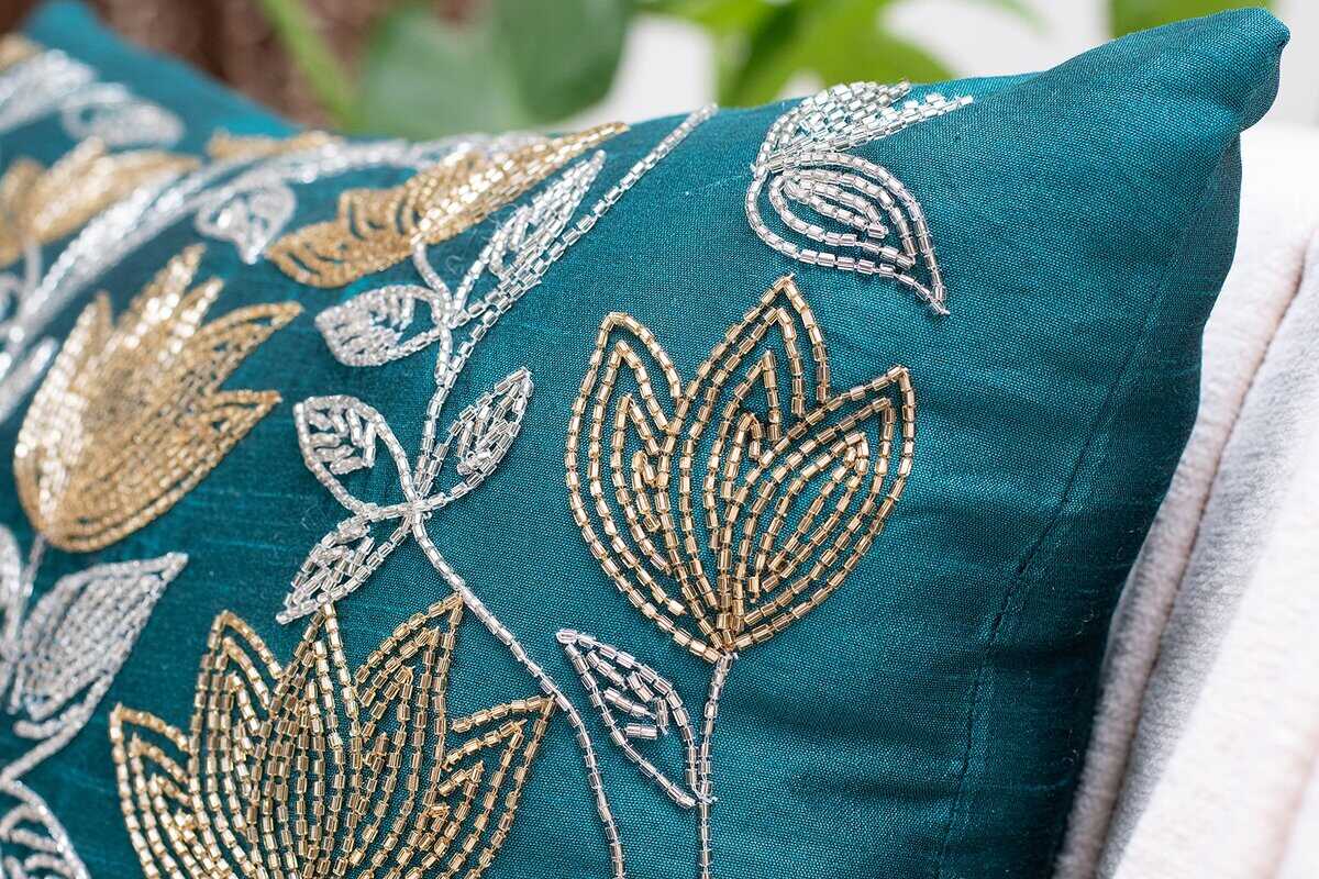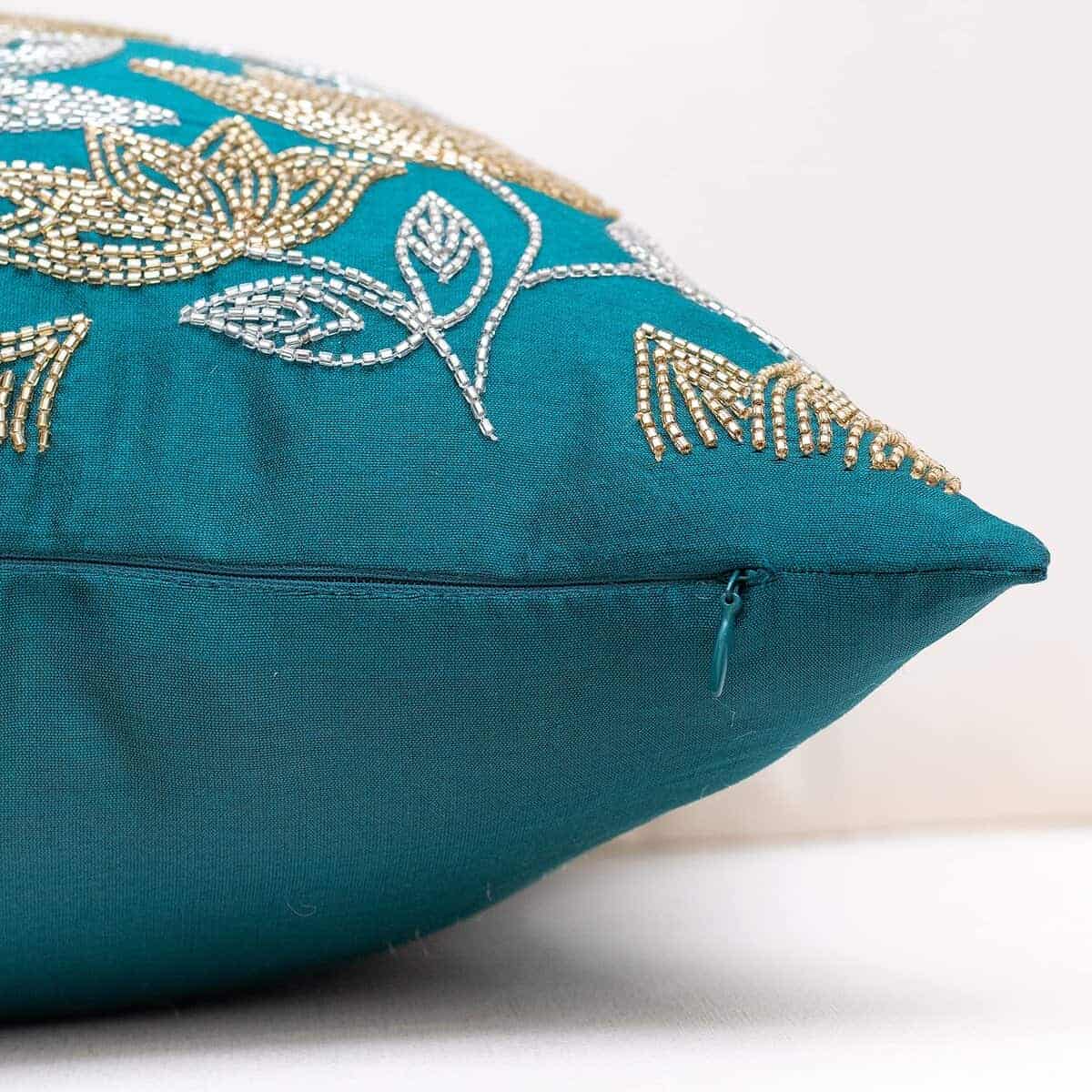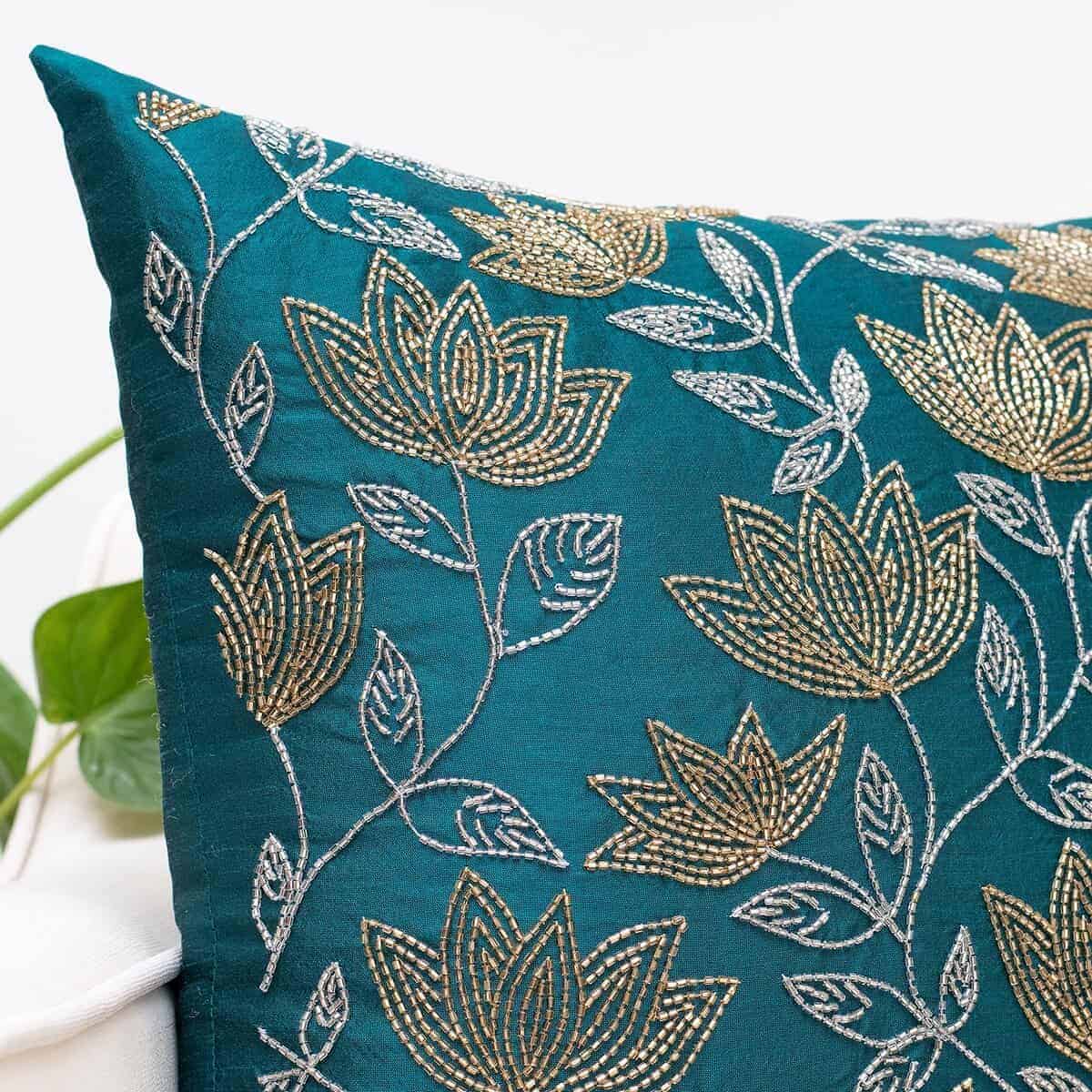 Nuestras Fundas de Cojín Decorativas Dark Teal bordadas con cuentas de vidrio doradas y plateadas en un patrón de flor de loto, de calidad premium y fabricadas de manera responsable, seguramente te darán el aspecto que has imaginado con tanta pasión. Estas elegantes Fundas de Cojín Decorativas harán que tu espacio se vea elegante y hermoso sin que tengas que preocuparte por su mantenimiento.