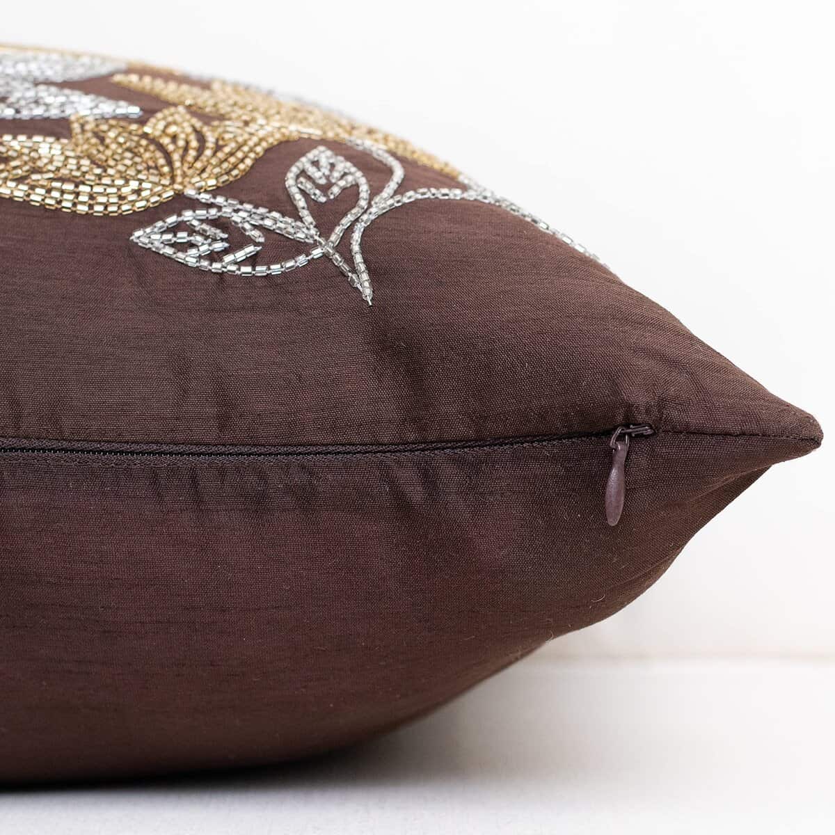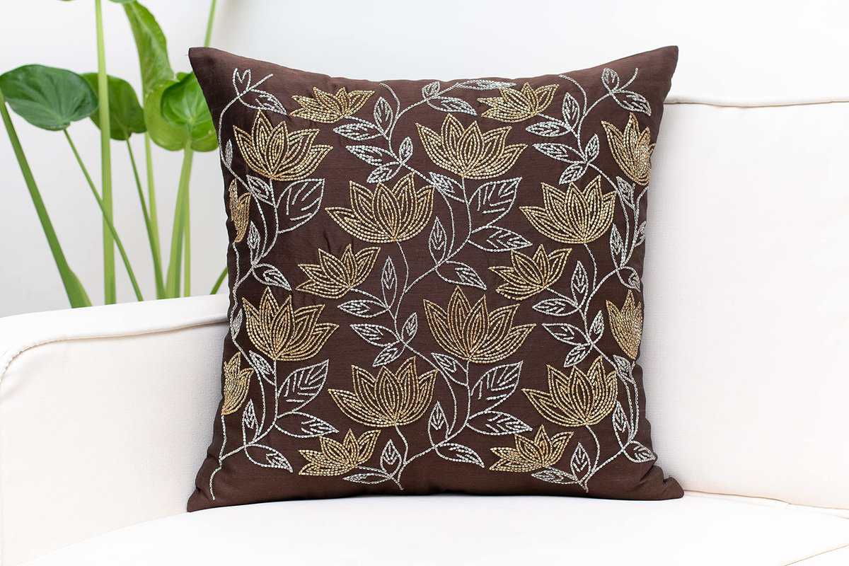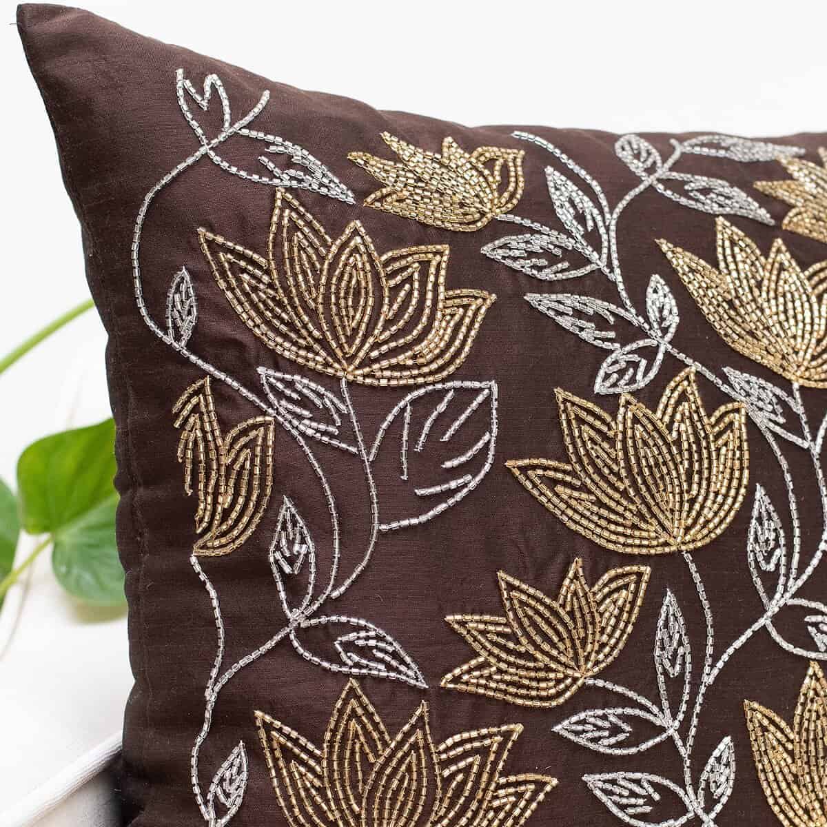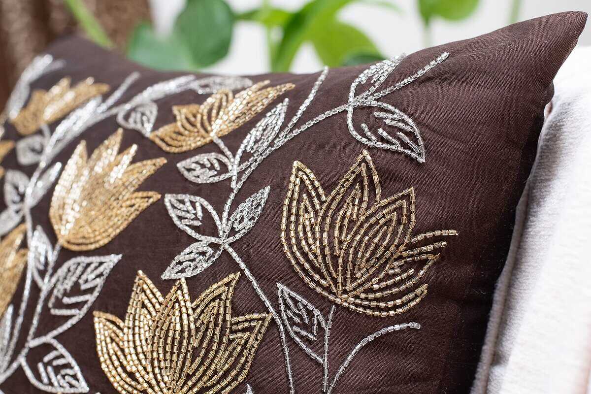 Nuestra funda de cojín marrón oscuro de calidad premium y fabricada de forma responsable, bordada con cuentas de vidrio doradas y plateadas en un patrón de flor de loto, seguramente te dará el aspecto que has imaginado con tanta pasión. Estas elegantes fundas de cojín harán que tu espacio luzca elegante y hermoso sin que tengas que preocuparte por su mantenimiento.