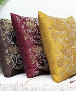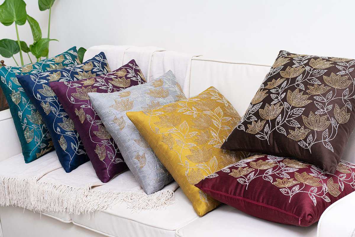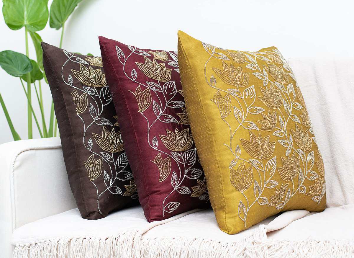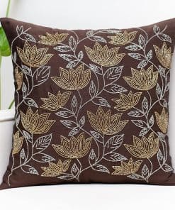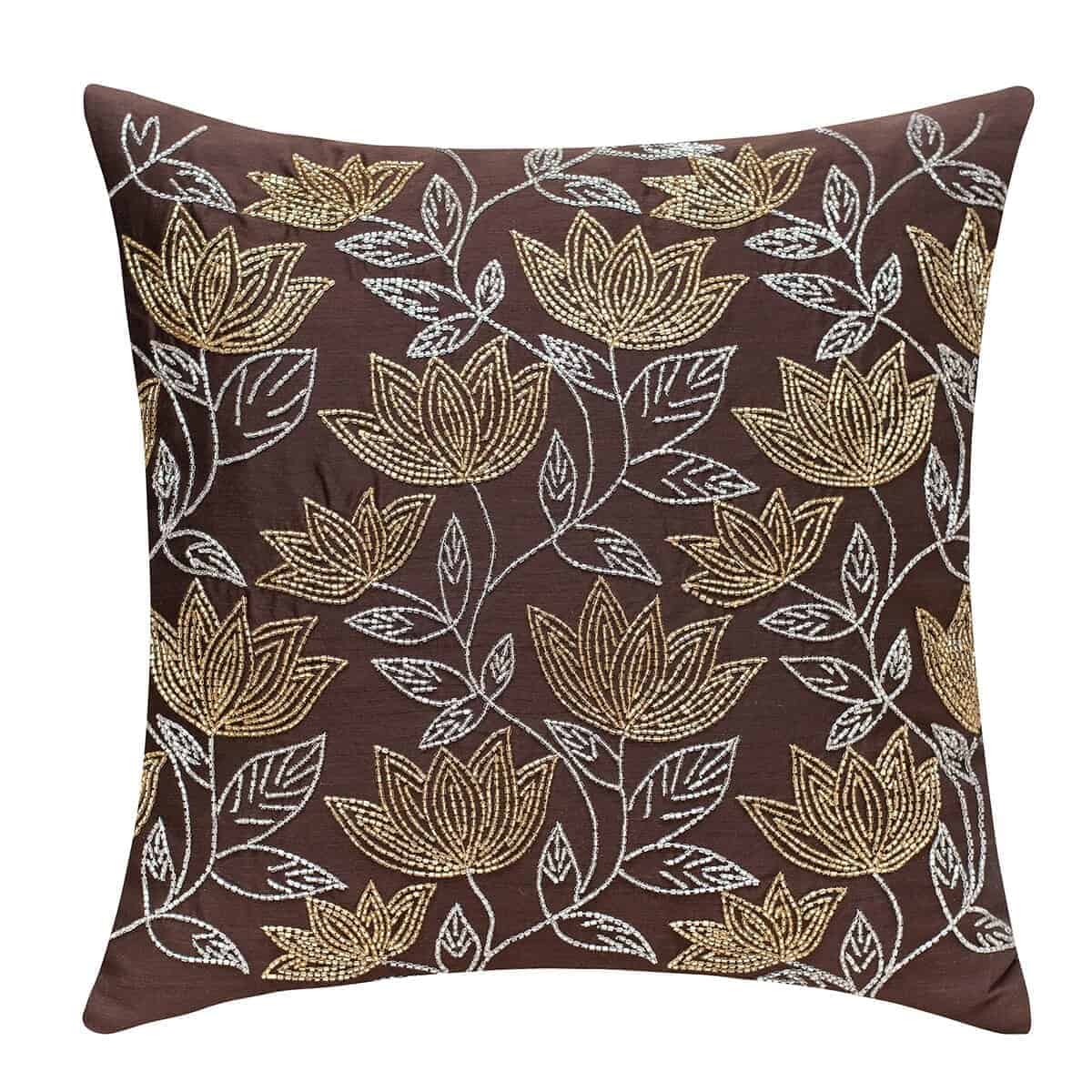 Nuestra funda de cojín marrón oscuro de calidad premium y fabricada de forma responsable, bordada con cuentas de vidrio doradas y plateadas en un patrón de flor de loto, seguramente te dará el aspecto que has imaginado con tanta pasión. Estas elegantes fundas de cojín harán que tu espacio luzca elegante y hermoso sin que tengas que preocuparte por su mantenimiento.