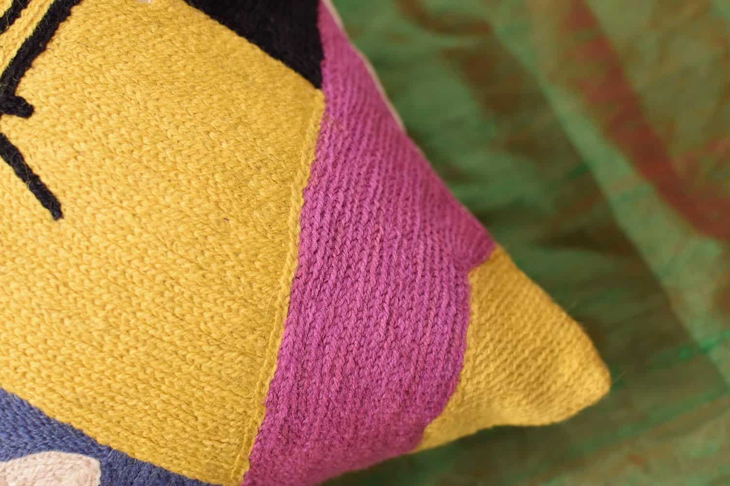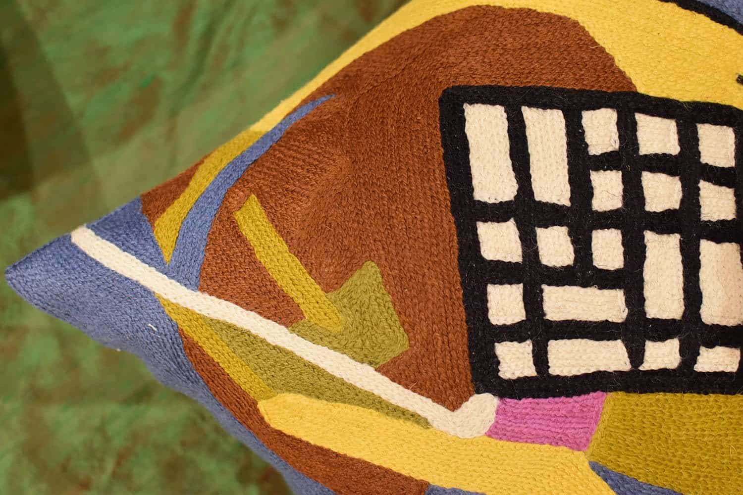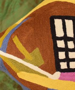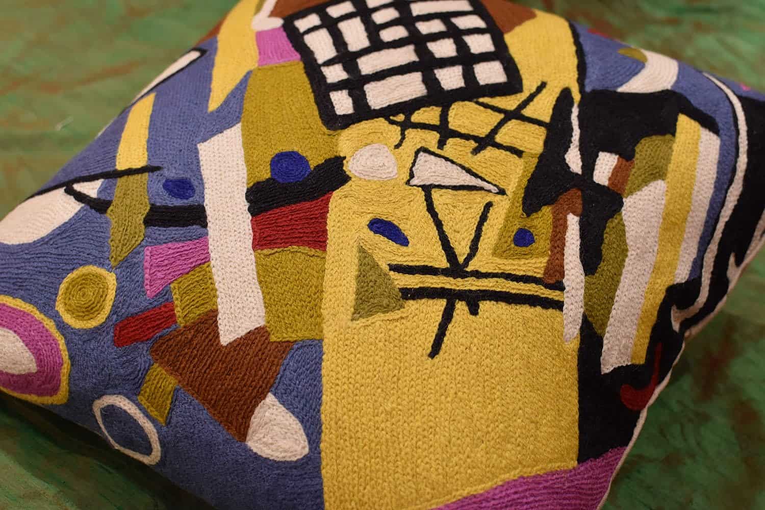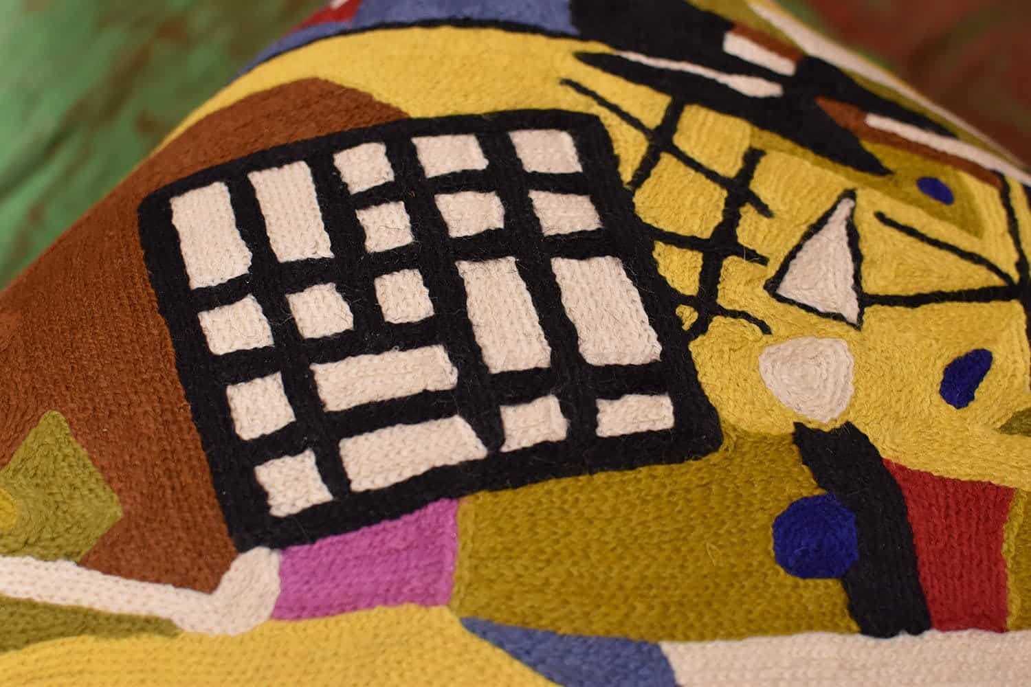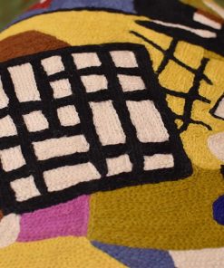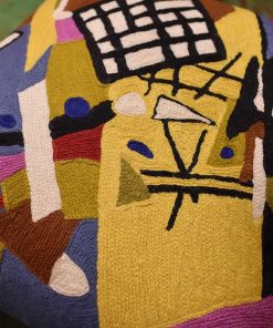 Esta funda de cojín moderno y colorido está inspirada en el arte de Kandinsky y es bordada a mano en lana suave por los mejores artesanos. Su diseño abstracto la convierte en una pieza extraordinaria para la decoración del hogar. Hecha con materiales naturales de alta calidad como lana suave y tela de algodón para la parte trasera. Perfecta para decorar sofás, camas, sillas, y más.