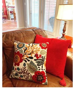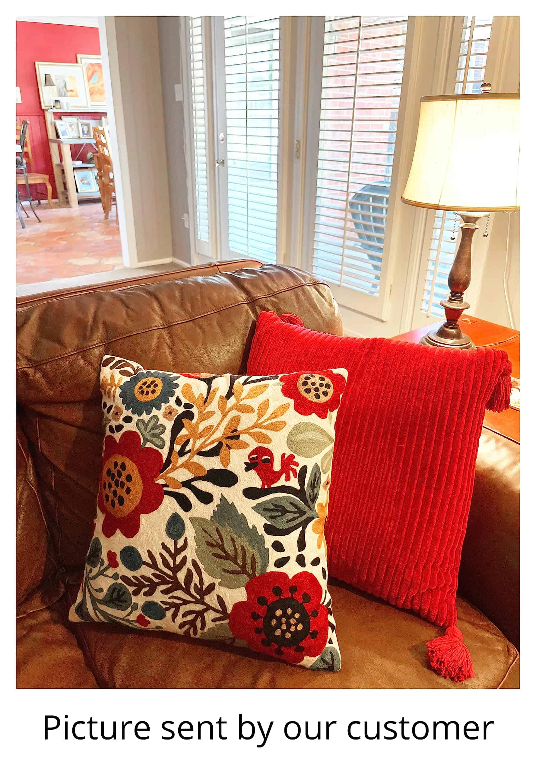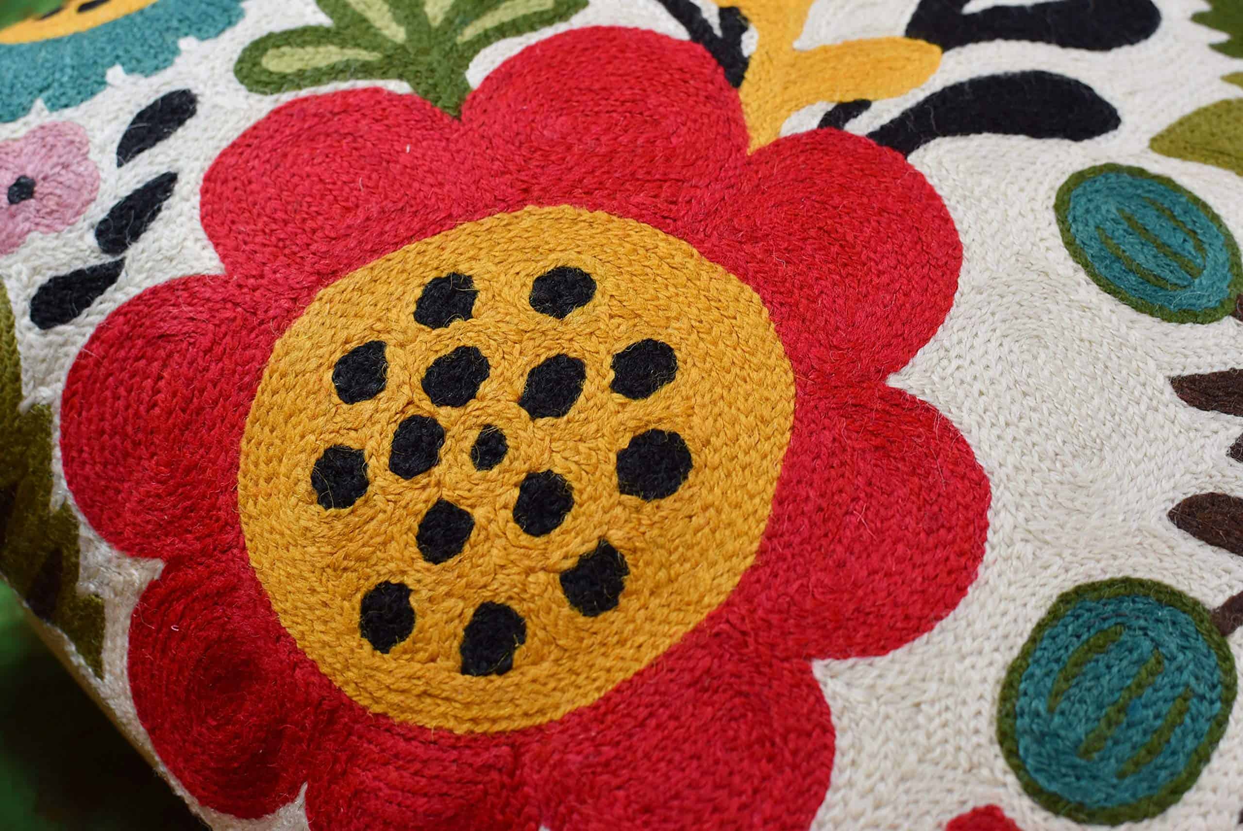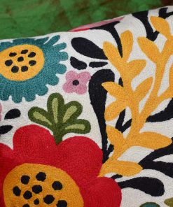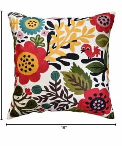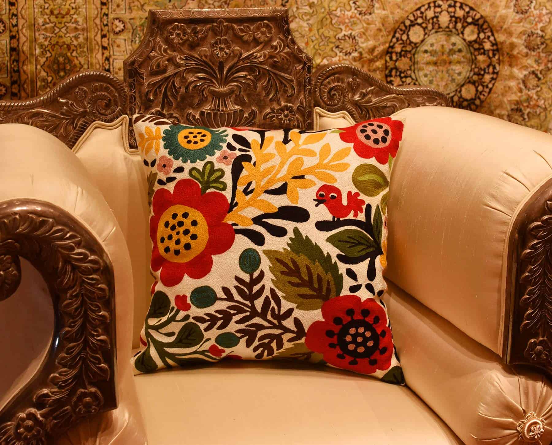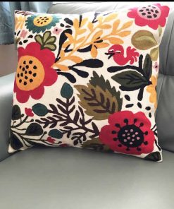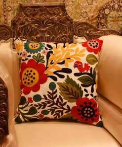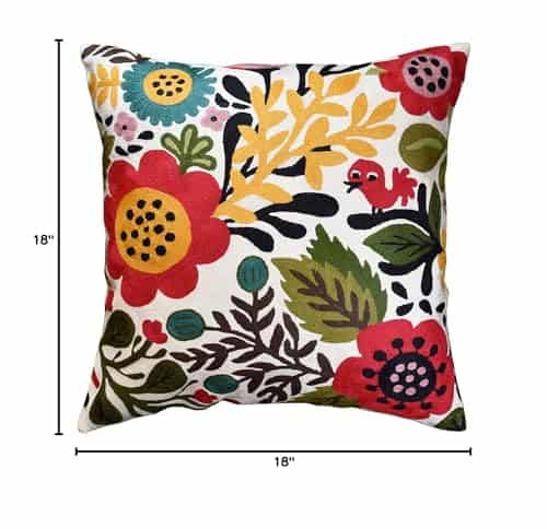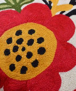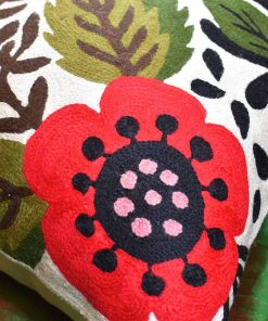 Funda de cojín roja con diseño de aves y flores de Kashmira