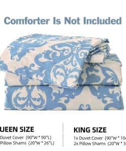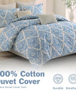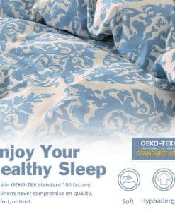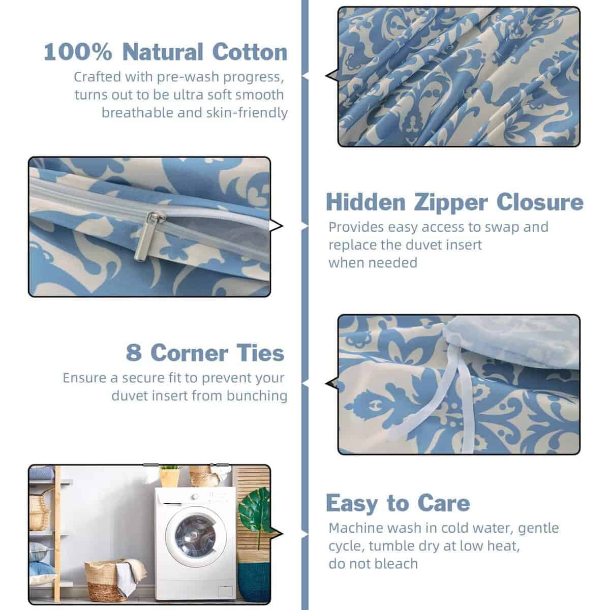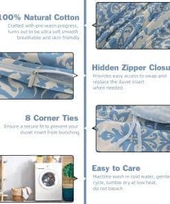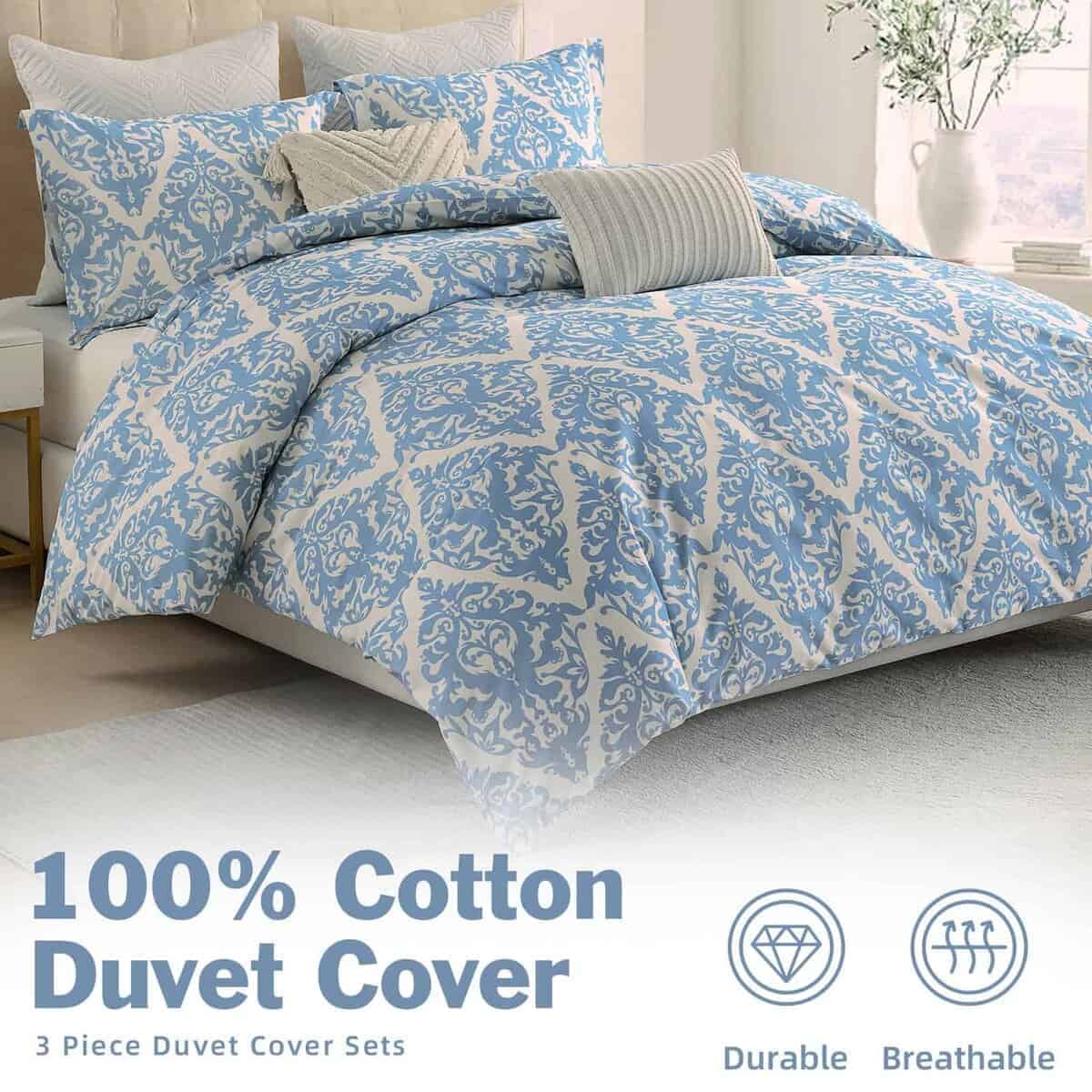 Funda de Edredón Azul EWlinens Tamaño King – 100% Algodón Súper Suave y Cómodo Juego de 3 Piezas de Funda de Edredón Damasco con Cierre de Cremallera, 104″x90″ es la elección perfecta para aquellos que buscan una experiencia de sueño de lujo. Hecha con algodón puro de primera calidad, esta funda de edredón ofrece una elasticidad excepcional, fuerte absorción de agua, excelente calidez y capacidad de teñido. La tela de algodón también cuenta con propiedades de regulación de la temperatura y habilidades de absorción de humedad, permitiendo que tu piel respire y asegurando una noche de sueño confortable. Además, la ropa de cama de algodón naturalmente suave y lisa exhibe una frescura y transpirabilidad evidente, volviéndose aún más suave después de cada lavado.