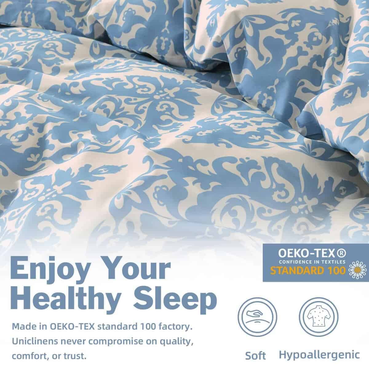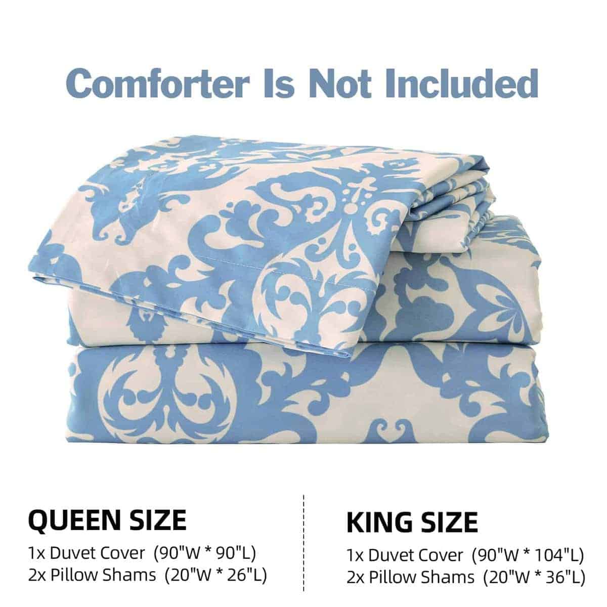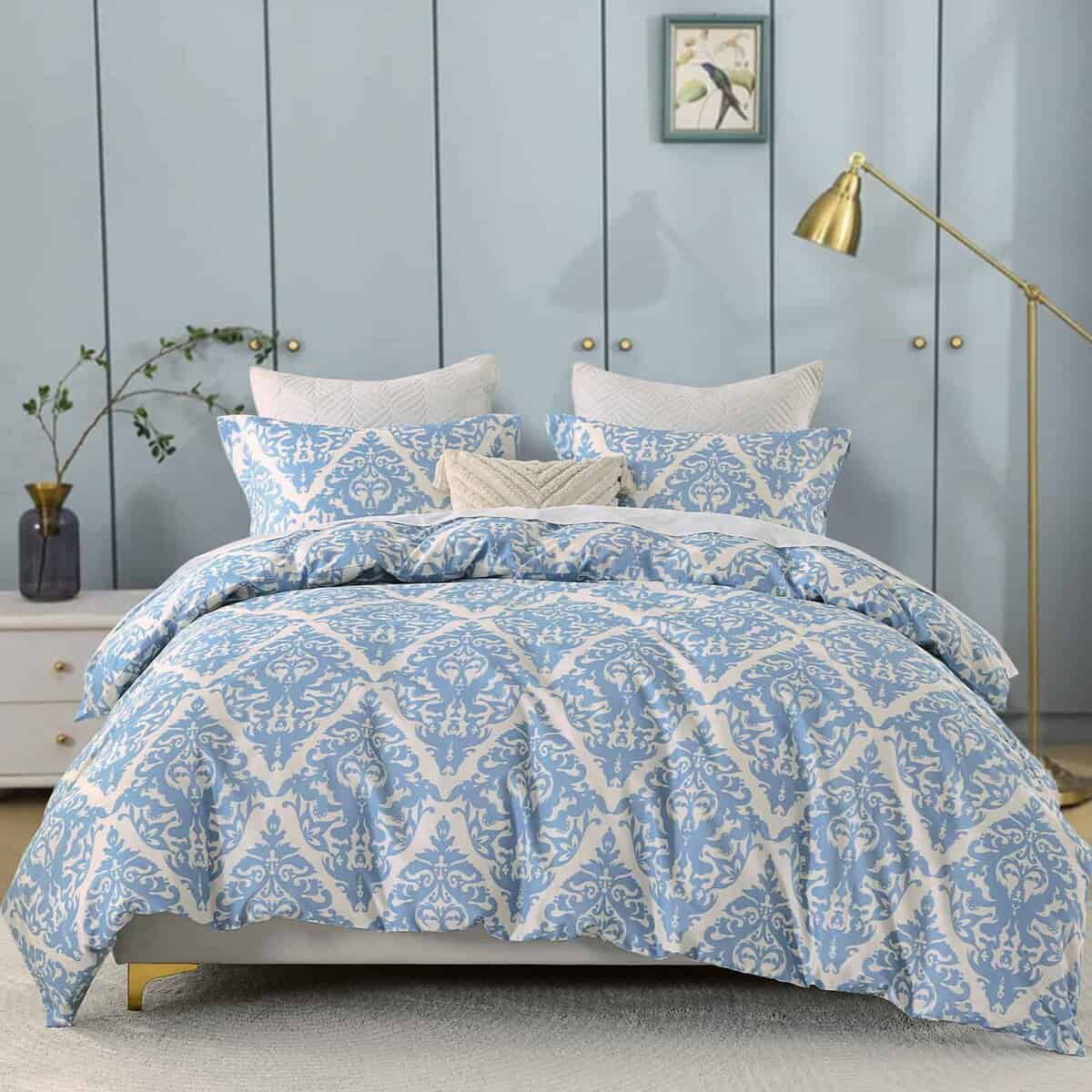 Funda de Edredón Azul EWlinens Tamaño King – 100% Algodón Súper Suave y Cómodo Juego de 3 Piezas de Funda de Edredón Damasco con Cierre de Cremallera, 104″x90″ es la elección perfecta para aquellos que buscan una experiencia de sueño de lujo. Hecha con algodón puro de primera calidad, esta funda de edredón ofrece una elasticidad excepcional, fuerte absorción de agua, excelente calidez y capacidad de teñido. La tela de algodón también cuenta con propiedades de regulación de la temperatura y habilidades de absorción de humedad, permitiendo que tu piel respire y asegurando una noche de sueño confortable. Además, la ropa de cama de algodón naturalmente suave y lisa exhibe una frescura y transpirabilidad evidente, volviéndose aún más suave después de cada lavado.