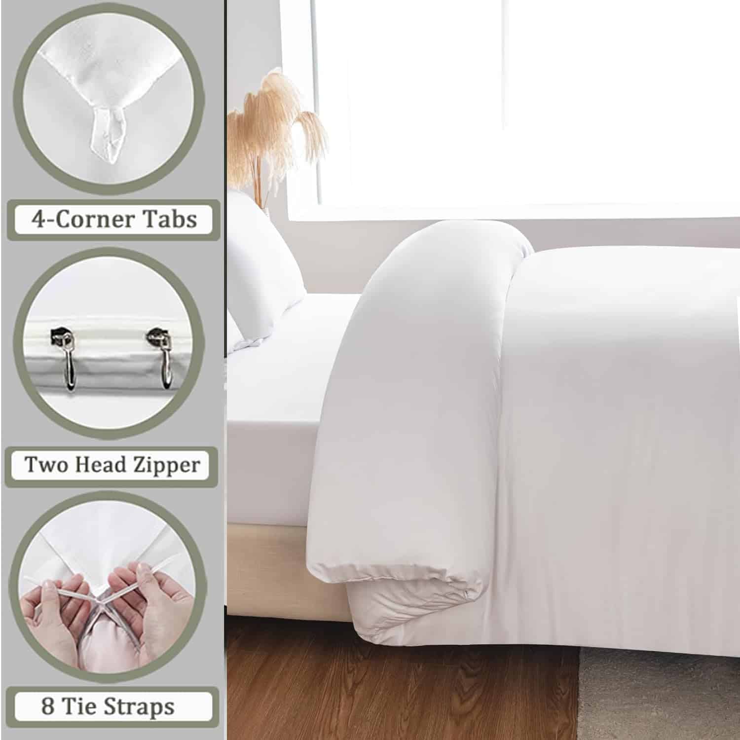 3. Protección de Cremallera: Nuestro protector de edredón impermeable cuenta con una doble cremallera, diseñada para envolver y proteger completamente su edredón. No se preocupe por el desplazamiento. La funda de edredón blanca tiene 8 correas internas que sujetarán firmemente su edredón, incluso cuando se somete a movimientos durante la noche.