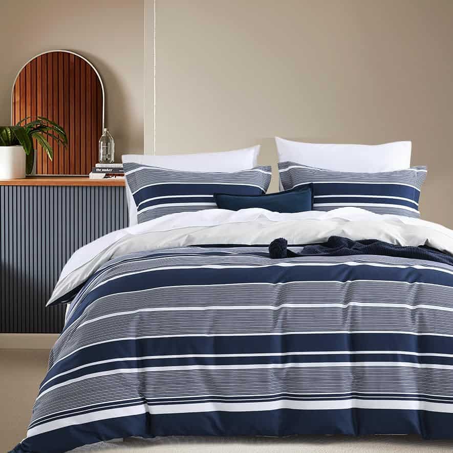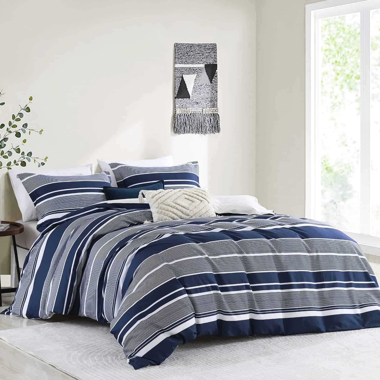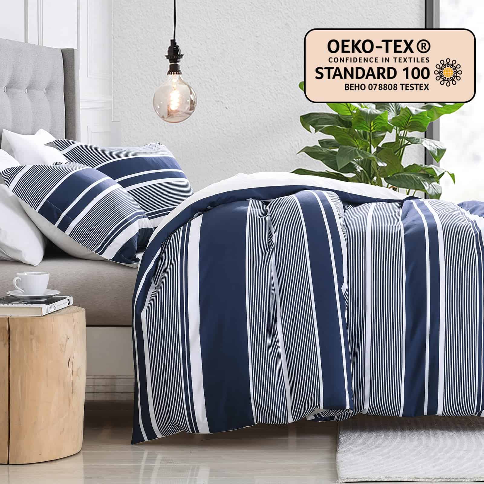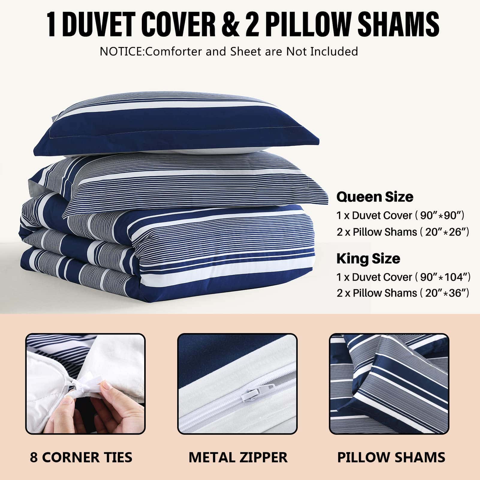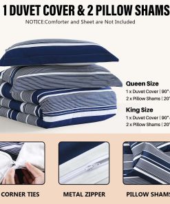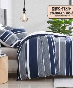 CUENTA CON UN DISEÑO ÚNICO Nuestra funda de edredón king size utiliza un diseño a rayas azul marino, una combinación de colores clásica y atemporal que ayuda a crear una atmósfera de paz y tranquilidad, promueve un sueño reparador y combina bien con una variedad de estilos decorativos y combinaciones de colores para ser el toque final perfecto para tu dormitorio. CIERRE DE CREMALLERA Y 8 LAZOS Los cierres de cremallera de metal y los 8 lazos en las esquinas del juego de funda de edredón reversible king de algodón aseguran que el edredón y la funda de edredón no se deslicen con un ajuste ultra preciso. La cremallera oculta facilita la colocación y extracción del edredón de manera más rápida y estéticamente agradable. ESTÁNDAR 100 por OEKO-TEX Nuestras fundas de edredón de algodón king azul a rayas se someten a pruebas exhaustivas según el estándar Oko-Tex 100 para garantizar que nuestros productos se produzcan de manera respetuosa con el medio ambiente y socialmente responsables, y se demuestre que están libres de sustancias nocivas y seguras para las personas con un excelente sentido de seguridad. LO QUE OBTIENES La funda de edredón de algodón king size incluye 1 juego de funda de edredón king (90″ x 104″) y 2 fundas de almohada (20″ x 36″).(El edredón y el relleno de almohada no están incluidos)