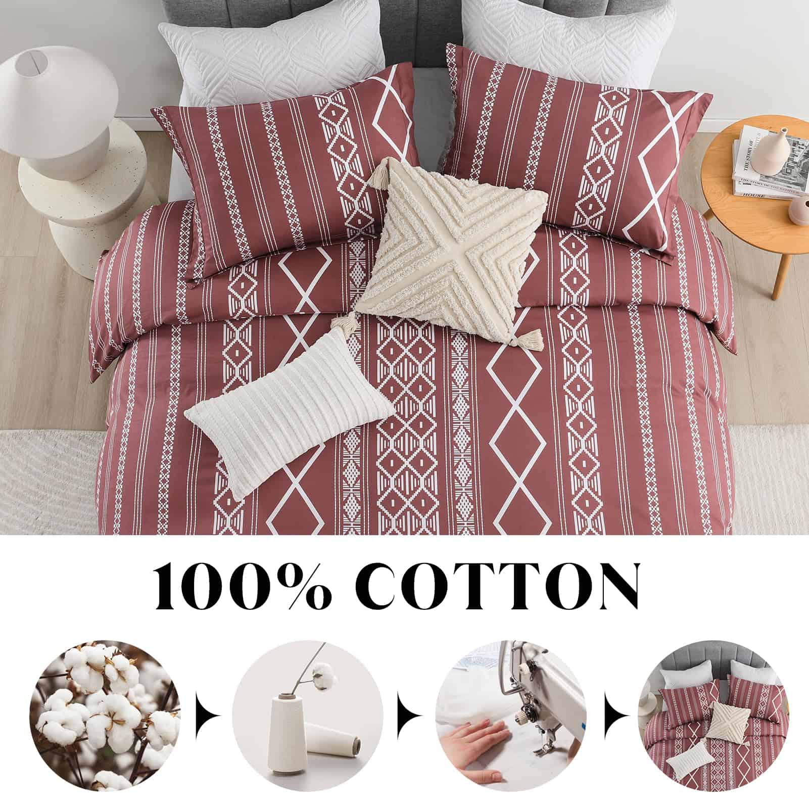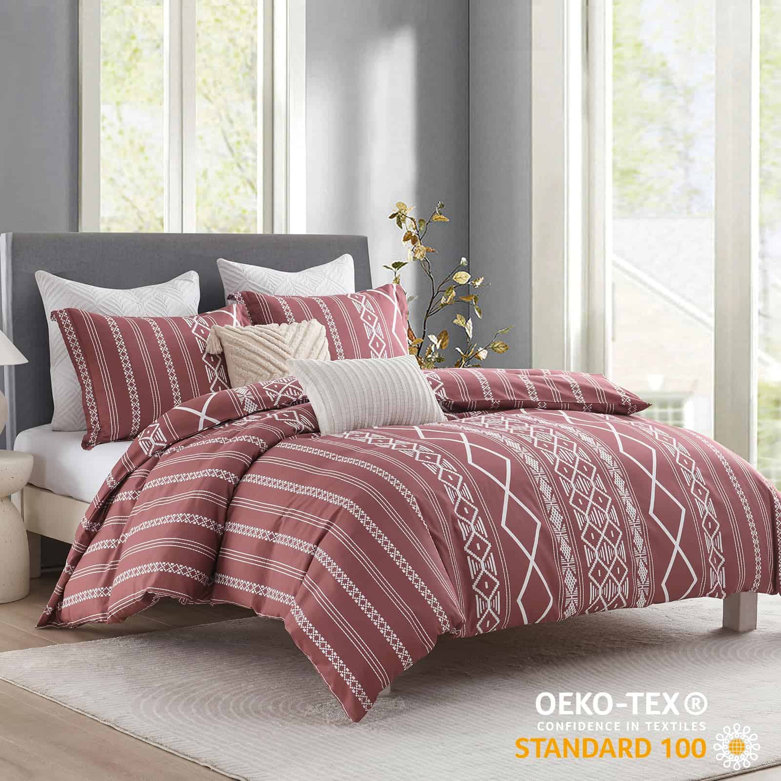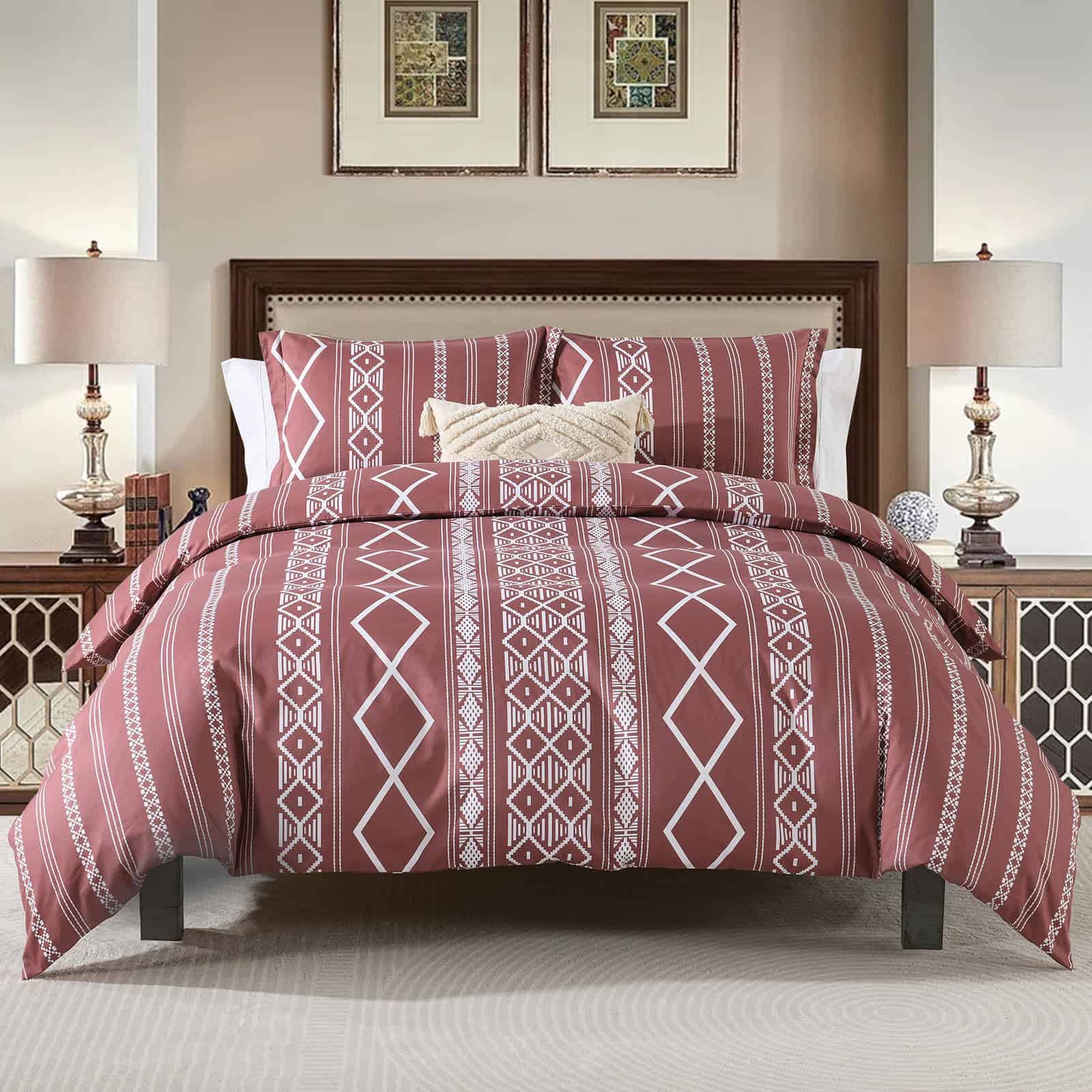Funda de Edredón Queen Size CozyDH – 100% Algodón 400 Hilos Rojo Funda de Edredón Queen Boho Set, Suave Ligero Juego de Ropa de Cama 3 piezas (Rojo, 90″x90″, Sin Relleno) – Calidad: La funda de edredón queen size CozyDH está hecha de algodón 100% de 400 hilos, que es suave, transpirable, seguro para la piel y apto para lavadora. Certificado por OEKO-TEX Standard 100, nuestra funda de edredón ha sido cuidadosamente probada y garantizada libre de sustancias nocivas, para brindarle a usted y su familia un ambiente de descanso seguro y saludable. Diseño: La funda de edredón rojo queen de CozyDH presenta un llamativo patrón geométrico bohemio, con colores vibrantes y elegantes que añaden un toque de estilo y sofisticación a su dormitorio. Ideal para diversos eventos y días festivos, esta funda de edredón es una excelente elección para bodas, cumpleaños, Navidad y más. Funcionalidad: Equipada con 8 lazos en las esquinas de la funda de edredón, además de una cremallera oculta, esta funda de edredón queen le permite mantener su edredón en su lugar y protegerlo de manchas, de manera sencilla y eficiente. Las fundas de almohada con cierre de sobre facilitan la inserción y extracción de las almohadas. Tallas Disponibles: La funda de edredón queen se encuentra disponible en dos tallas: king y queen, con 1 funda de edredón y 2 fundas de almohada incluidas en cada juego. Nota: El relleno de edredón y almohada no está incluido en el set. Cuidado: Para mantener su funda de edredón en óptimas condiciones, le recomendamos lavarla por separado en agua fría, en ciclo suave, y secar a baja temperatura o de forma natural. No usar lejía para mantener el color y la calidad de la tela. Disfrute de reducir el tiempo de sus tareas domésticas y reserve un momento de relajación con una taza de café.