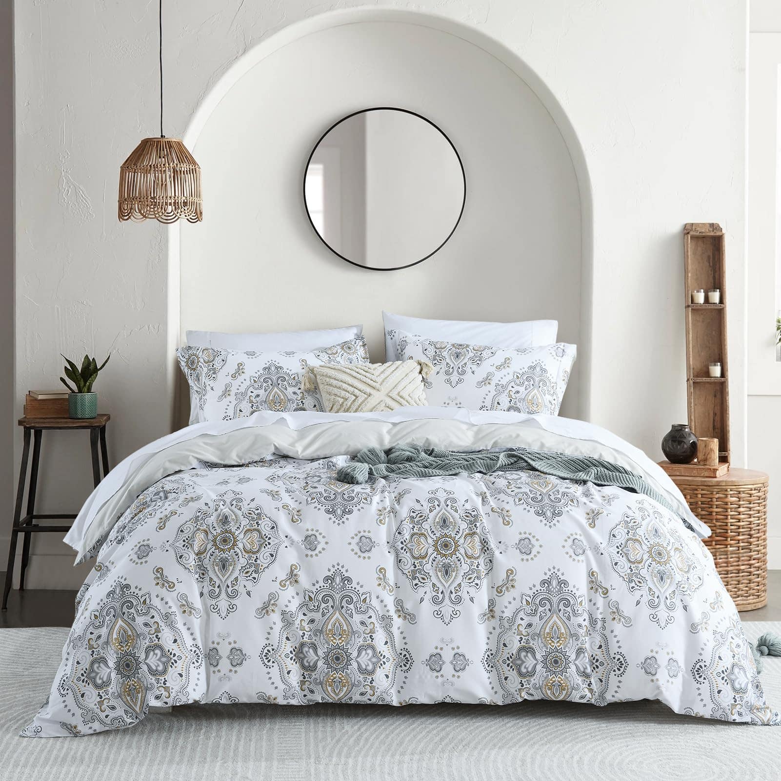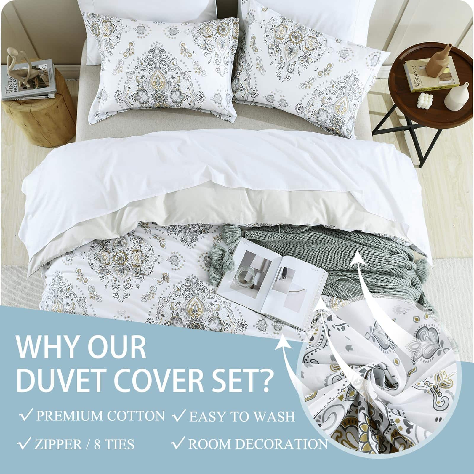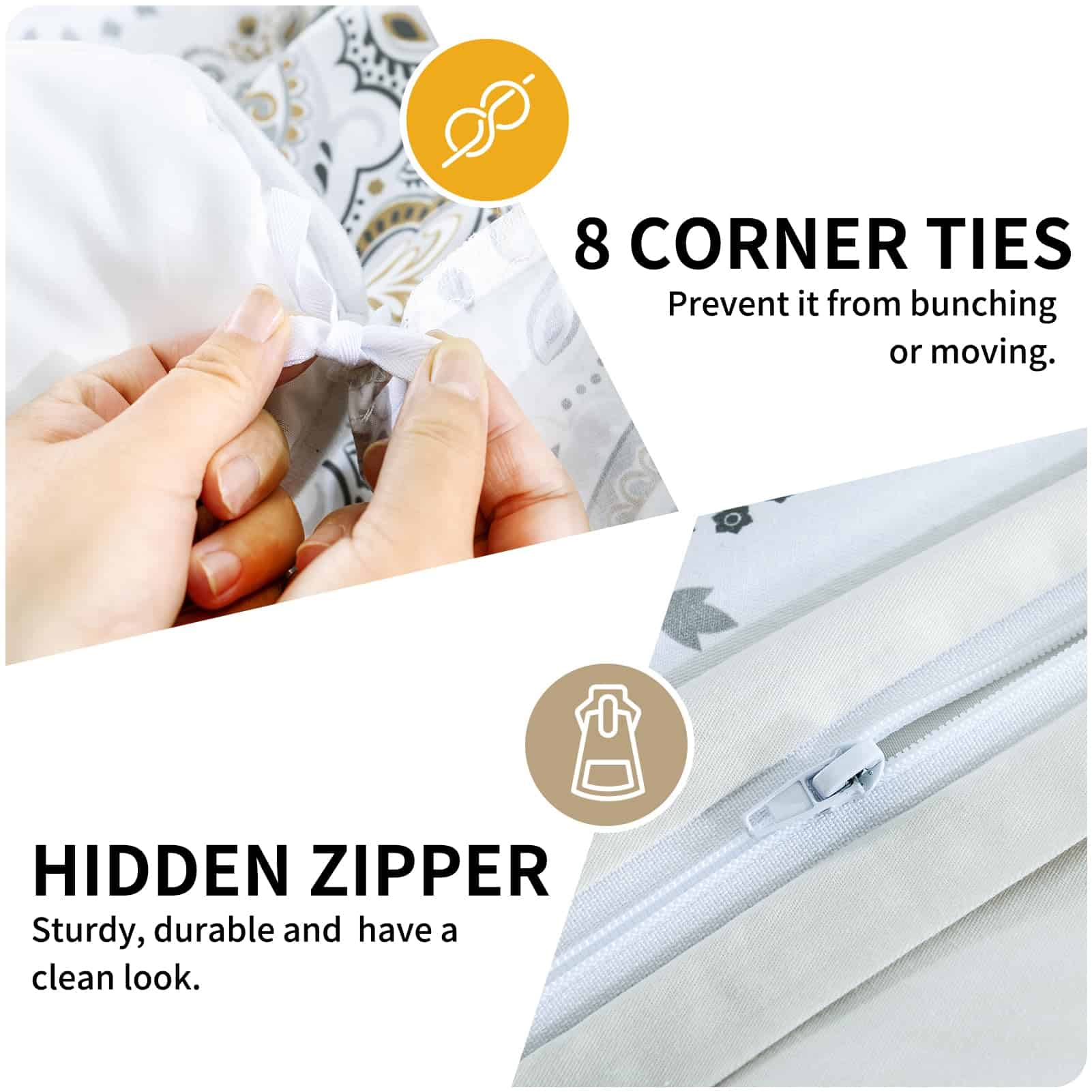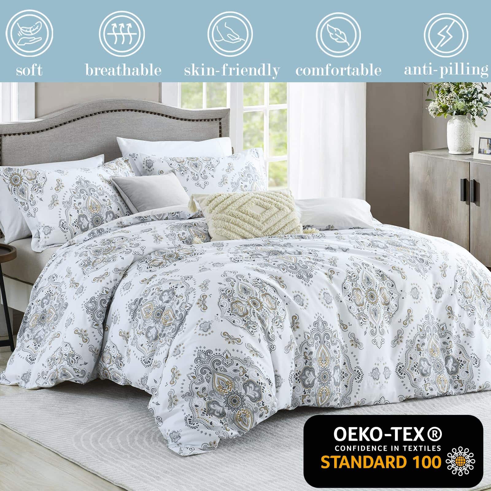 La funda de edredón Quilta de algodón King size es la opción perfecta para aquellos que buscan comodidad y estilo en su dormitorio. Hecha de 100% de algodón de alta densidad, esta funda de edredón es suave, transpirable y duradera. Con un diseño damasco elegante, esta funda de edredón añadirá un toque de lujo a tu habitación. El cierre de cremallera invisible y los ocho lazos en las esquinas garantizan que tu edredón se mantenga en su lugar sin problemas. La certificación OEKO-TEX Standard 100 asegura que este juego de funda de edredón cumple con los estándares más altos de calidad y seguridad. No incluye edredón, lo que permite que personalices tu cama con tu propio edredón favorito. Con instrucciones de cuidado fáciles de seguir, este juego de funda de edredón se mantendrá fresco y como nuevo a lo largo de los años. Haz que tu dormitorio sea un refugio de confort y estilo con la funda de edredón Quilta de algodón King size.