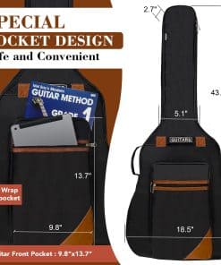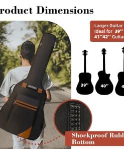 La durabilidad de esta funda es excepcional, con una resistencia al agua y a los arañazos que protege tu guitarra de la lluvia, la arena y otros elementos externos. El fondo acolchado proporciona una mayor protección contra impactos y golpes. Con unas dimensiones de 43.3 x 4.7 x 18.5 pulgadas, esta funda es compatible con guitarras de 39, 40, 41 y 42 pulgadas, garantizando un ajuste perfecto para tu instrumento.