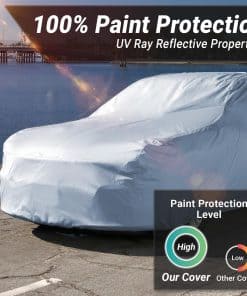 2. PROTECCIÓN IMPERMEABLE Y RESISTENTE A TODO TIPO DE CLIMA AL 100%: La funda para automóvil todo clima de iCarCover está elaborada con materiales 100% impermeables y resistentes a la intemperie, proporcionando una protección superior contra la lluvia, la nieve, el granizo y el sol intenso. Con defensa total contra los rayos UV, ayuda a preservar la pintura y el acabado de su vehículo durante años. El suave forro interior de algodón evita arañazos, mientras que la funda protege su coche de los duros elementos exteriores.