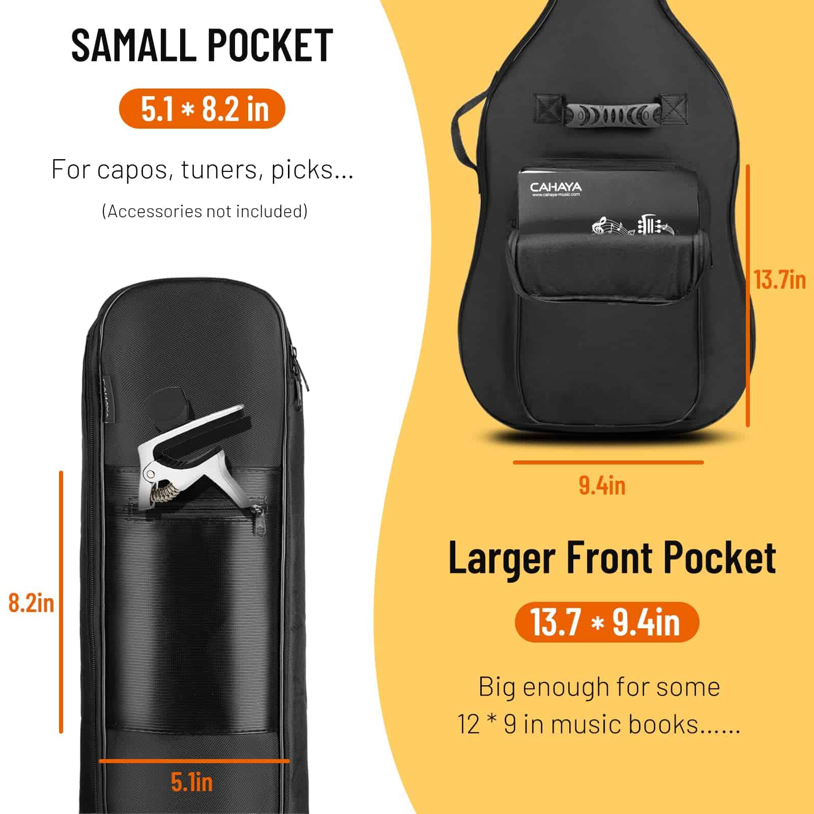 4. Bolsillo delantero grande: Bolsillo externo de 13.7 x9.7 x2.1 lo suficientemente grande para guardar hojas de música en tamaño A4 y de carta, tablet, smartphone. Bolsillo pequeño para accesorios musicales: bolsillo superior pequeño para guardar cosas pequeñas como afinadores, cuerdas, cables, púas, correas de guitarra.