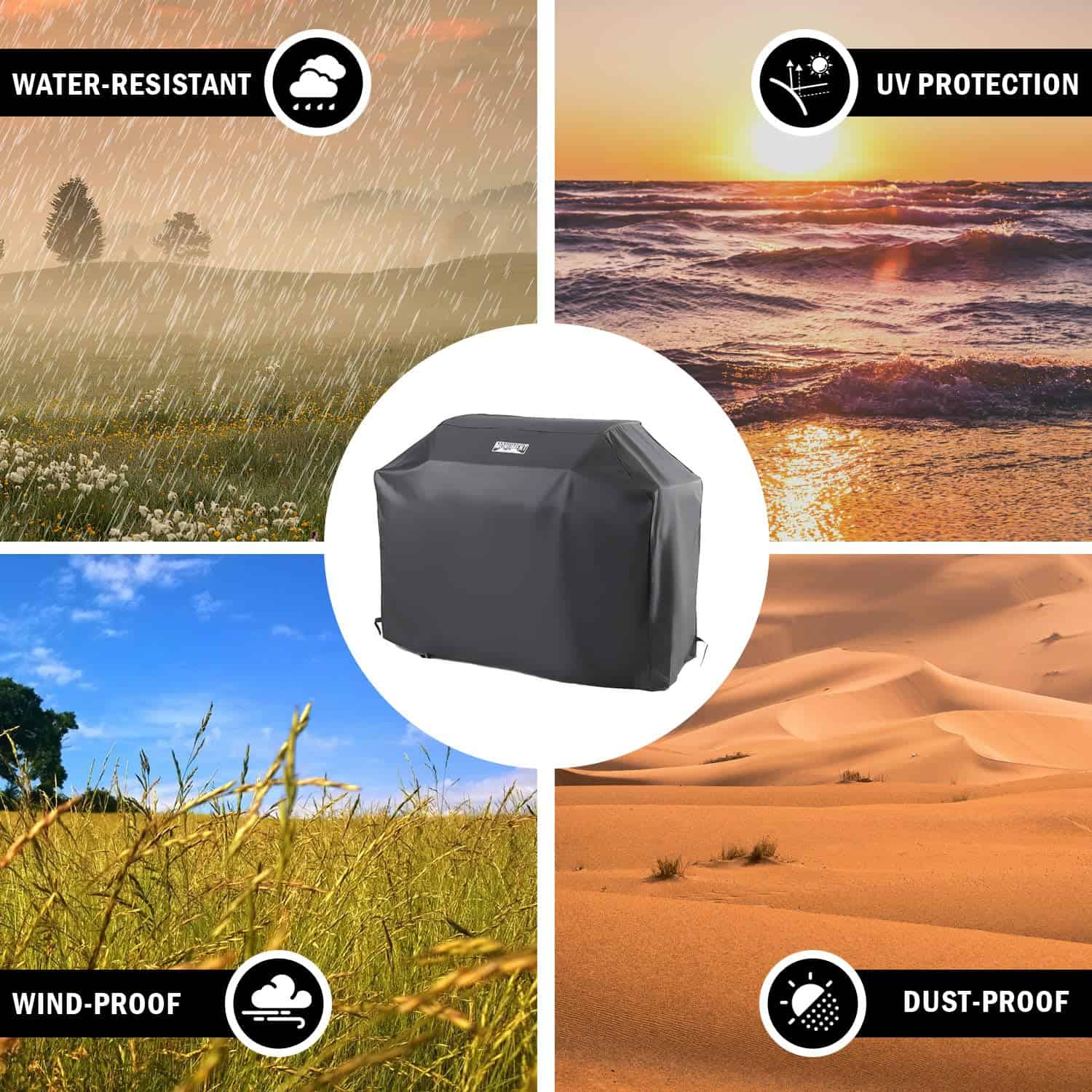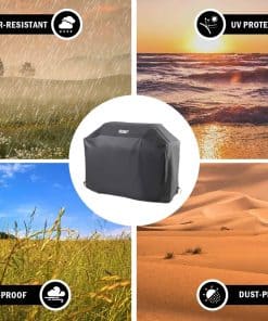 1. RESISTENTE AL AGUA – Esta funda para parrilla de gas cuenta con un exterior de tela Oxford y un forro de PVC en el interior que es resistente al agua, protección UV, a prueba de viento y a prueba de polvo para proteger tu parrilla en todo tipo de clima.