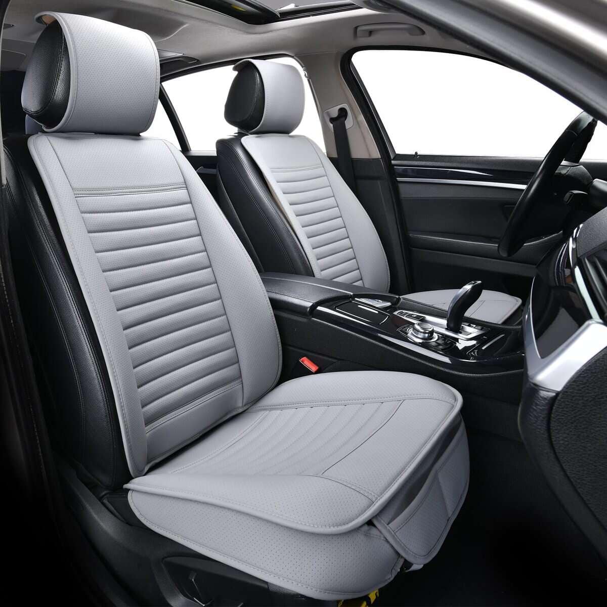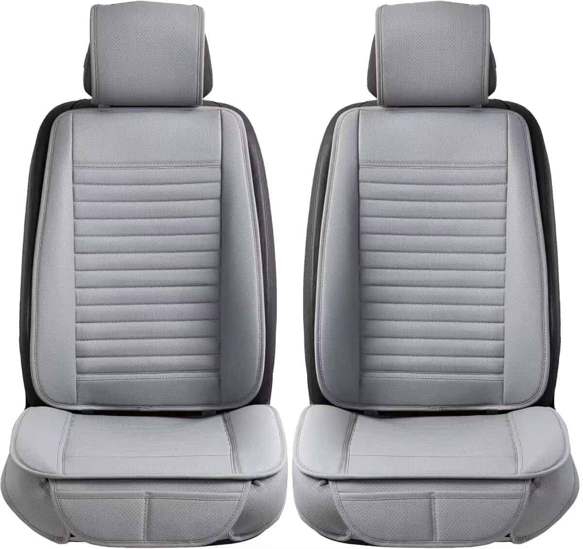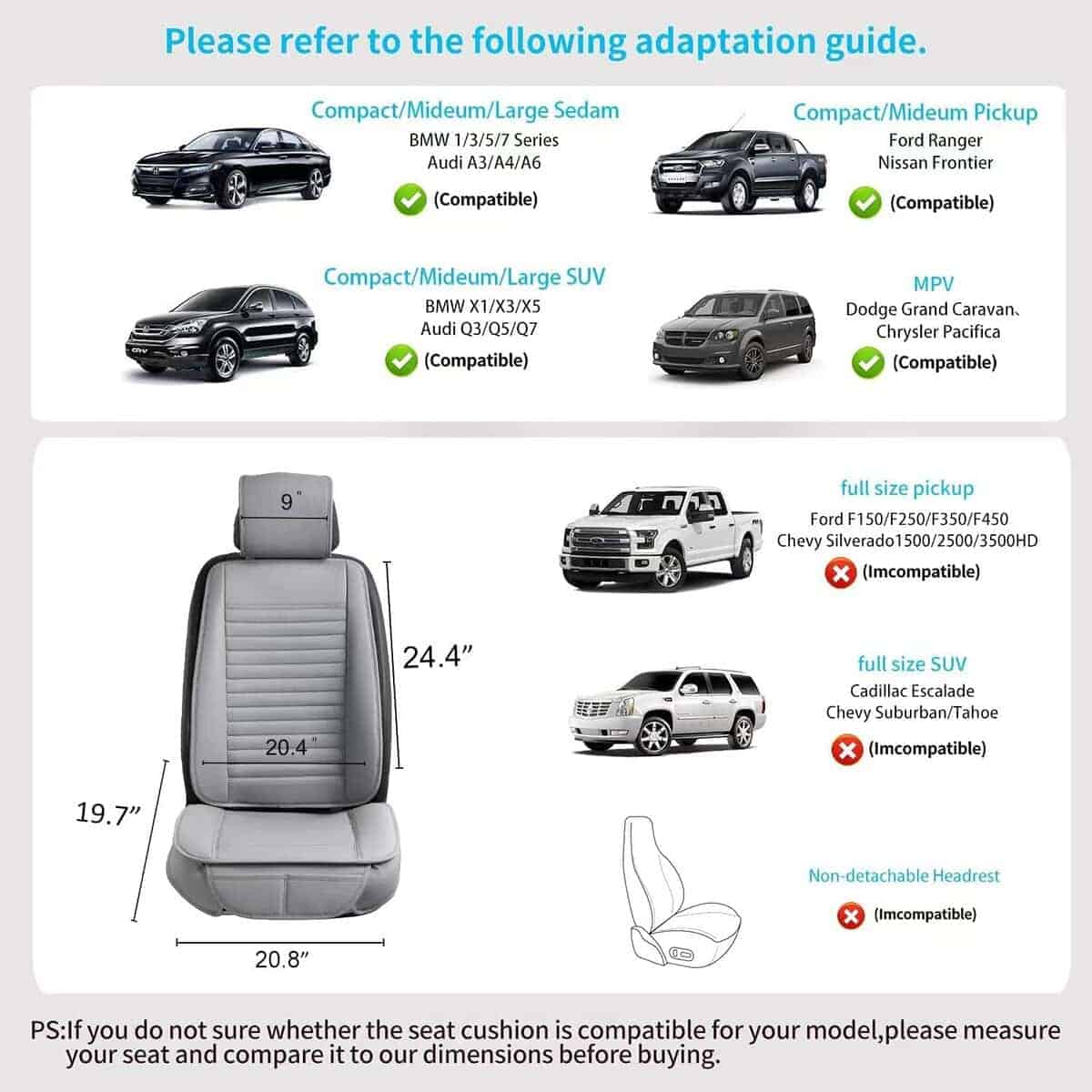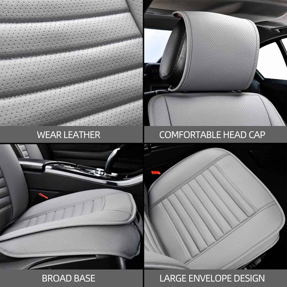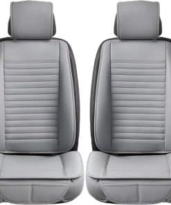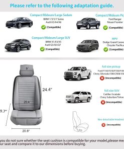 Material Premium de Cuero PU: La funda de asiento para automóvil está hecha de cuero PU suave de alta calidad, resistente al agua, fácil de limpiar, duradero y transpirable. Incorpora una capa de esponja altamente flexible, aplicable durante las cuatro estaciones. Mantiene la comodidad de las nalgas, ayuda a aliviar la presión en caderas y muslos al conducir durante mucho tiempo. En la parte inferior del cojín hay una suela de goma que evita que se caiga del asiento del conductor del automóvil. Protege el Asiento Original: Ideal para cubrir un asiento desgastado o proteger tus asientos originales. Nuestras fundas de asiento delantero protegen tu asiento contra el desgaste diario, a la vez que refrescan el aspecto de tu interior. Las fundas perfectas para combinar con tus asientos. Diseño de Envoltura de Borde: Ambos lados del cojín de asiento de cuero con diseño de envoltura muestra una rica visión estereoscópica. Contribuye a una protección integral para tu asiento y es cómodo de usar. Dos bolsillos pequeños con individualización: Fácil y rápido para sacar tus cosas del bolsillo delantero, como el teléfono móvil, llaves y cartera, etc. Instalación en solo 3 pasos, simplemente cuelga 2 ganchos metálicos debajo del asiento, engancha 2 hebillas en el respaldo del asiento. Ajusta los cierres en las fundas del respaldo y de los reposacabezas. Es posible que no se ajuste a camiones, sedanes de gran tamaño, SUV de gran tamaño y RV. Camioneta de tamaño completo como Silverado, TUNDRA, F-150 y SUV de tamaño completo como Tahoe, Expedition, Acadia. Para garantizar el mejor ajuste, por favor mide tu asiento y compáralo con nuestras dimensiones antes de comprar.