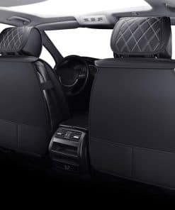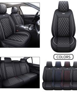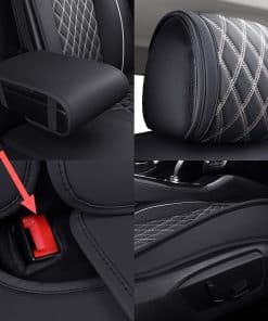 1. Ajuste Universal: Se adapta a más del 99% de los vehículos automotrices, como automóviles, hatchbacks, SUV, crossovers, camionetas pickup, cabinas dobles, furgonetas, etc. 2. Material: Hecho de cuero sintético premium que es suave, duradero e impermeable. Fácil de limpiar con una toalla húmeda, no hay preocupaciones por el cabello de los perros y las huellas. 3. Airbags Compatibles: El airbag tiene suficiente espacio para desplegarse y nunca estará bloqueado. El espacio para el cinturón de seguridad también ha sido reservado. Compatible con el reposabrazos y no afecta el asiento de seguridad para niños. 4. Espacio de Almacenamiento: Hay 2 bolsillos en las fundas de los asientos delanteros para guardar fácilmente cosas como el celular, la computadora portátil y revistas, lo que ayuda a mantener organizados tus objetos. 5. Fácil de Instalar: Hay un Manual de Instalación en el paquete y videos de instrucción disponibles en la lista del producto. Sigue nuestro sencillo proceso de instalación paso a paso, terminado en 25 minutos, no se necesita herramientas.