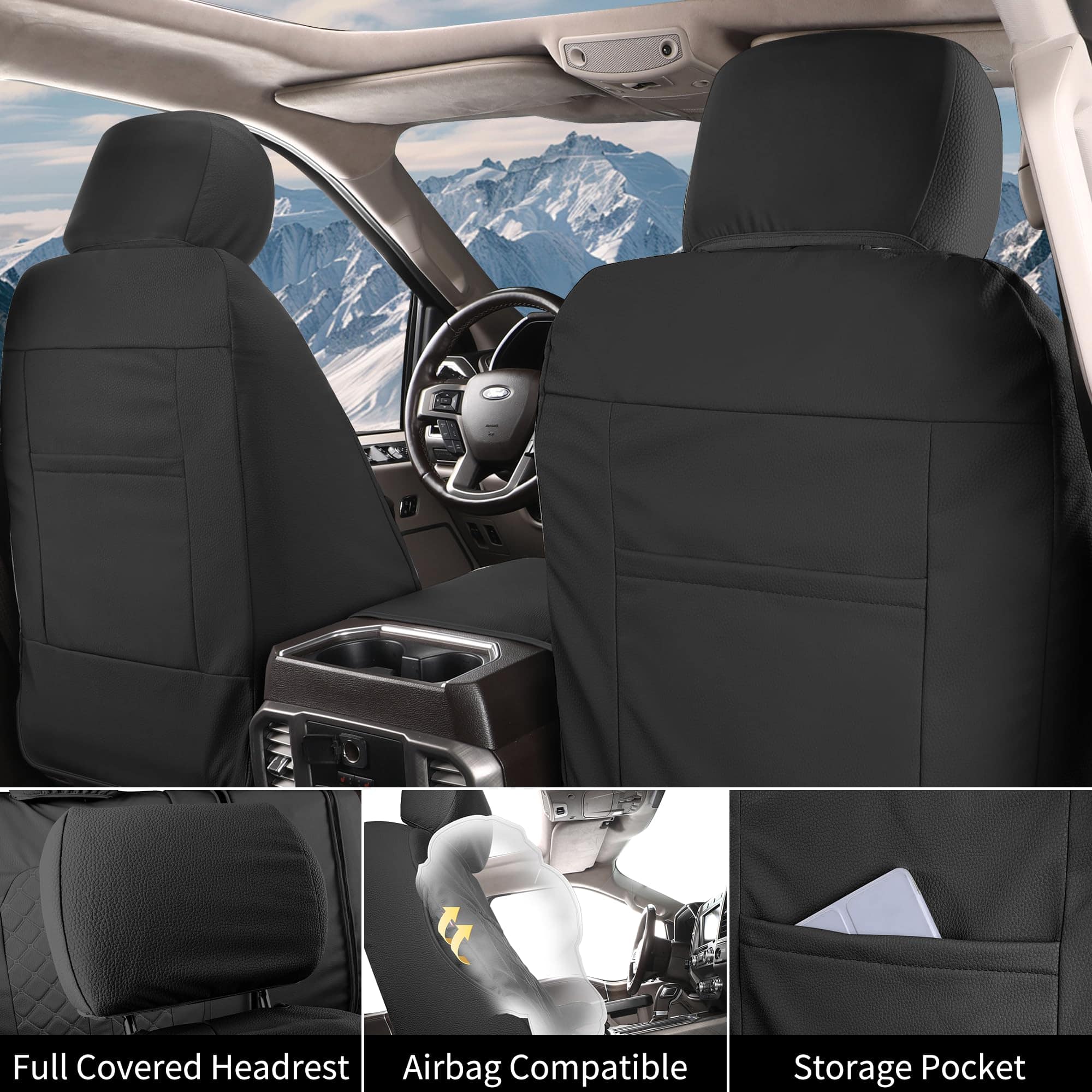 4. Material de cuero premium: Las fundas de asiento para F150 están hechas de cuero de alta calidad, garantizando una experiencia de conducción lujosa y cómoda. Es impermeable y resistente al desgaste, se siente más suave y cómodo. El cuero premium no solo agrega un toque de elegancia al interior de su automóvil, sino que también proporciona una excelente protección contra derrames, manchas, suciedad, polvo, arañazos y pelos de mascotas. Fácil de limpiar pasando un paño húmedo.