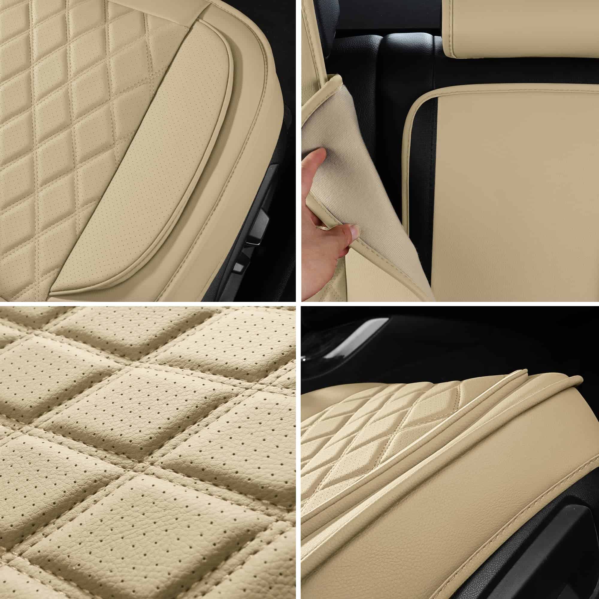 4. MATERIAL DE ALTA CALIDAD El material de la superficie está hecho de cuero falso de alta calidad que es suave, duradero e impermeable, las delicadas perforaciones ofrecen una experiencia de comodidad transpirable. La parte central utiliza una esponja de alta resiliencia para crear la máxima comodidad durante su conducción. Se utiliza una tela antideslizante en la capa inferior para mantener las fundas en su lugar para que pueda entrar y salir sin preocupaciones.