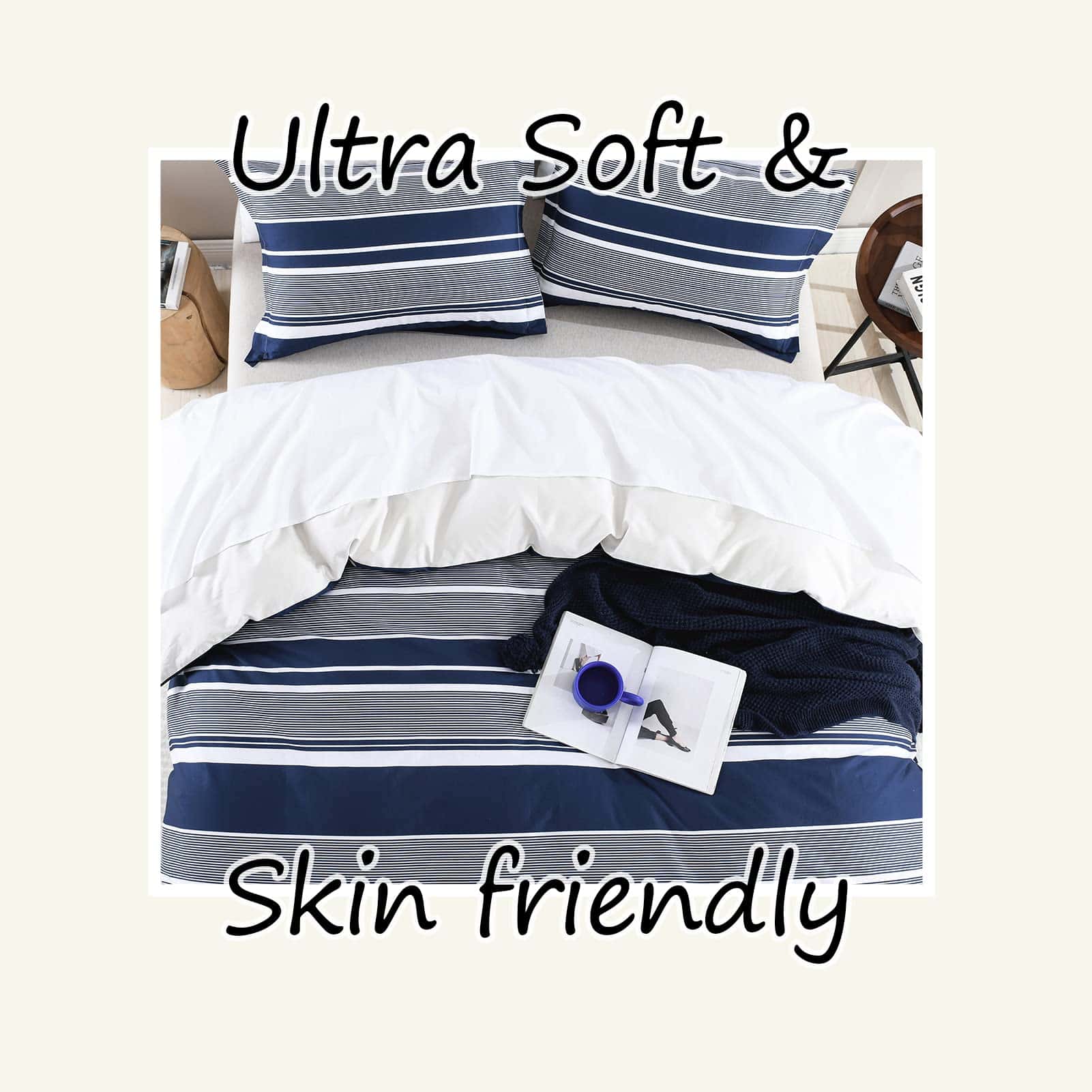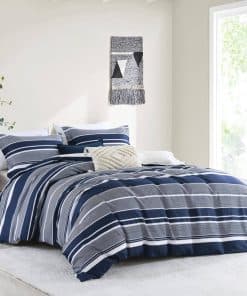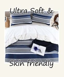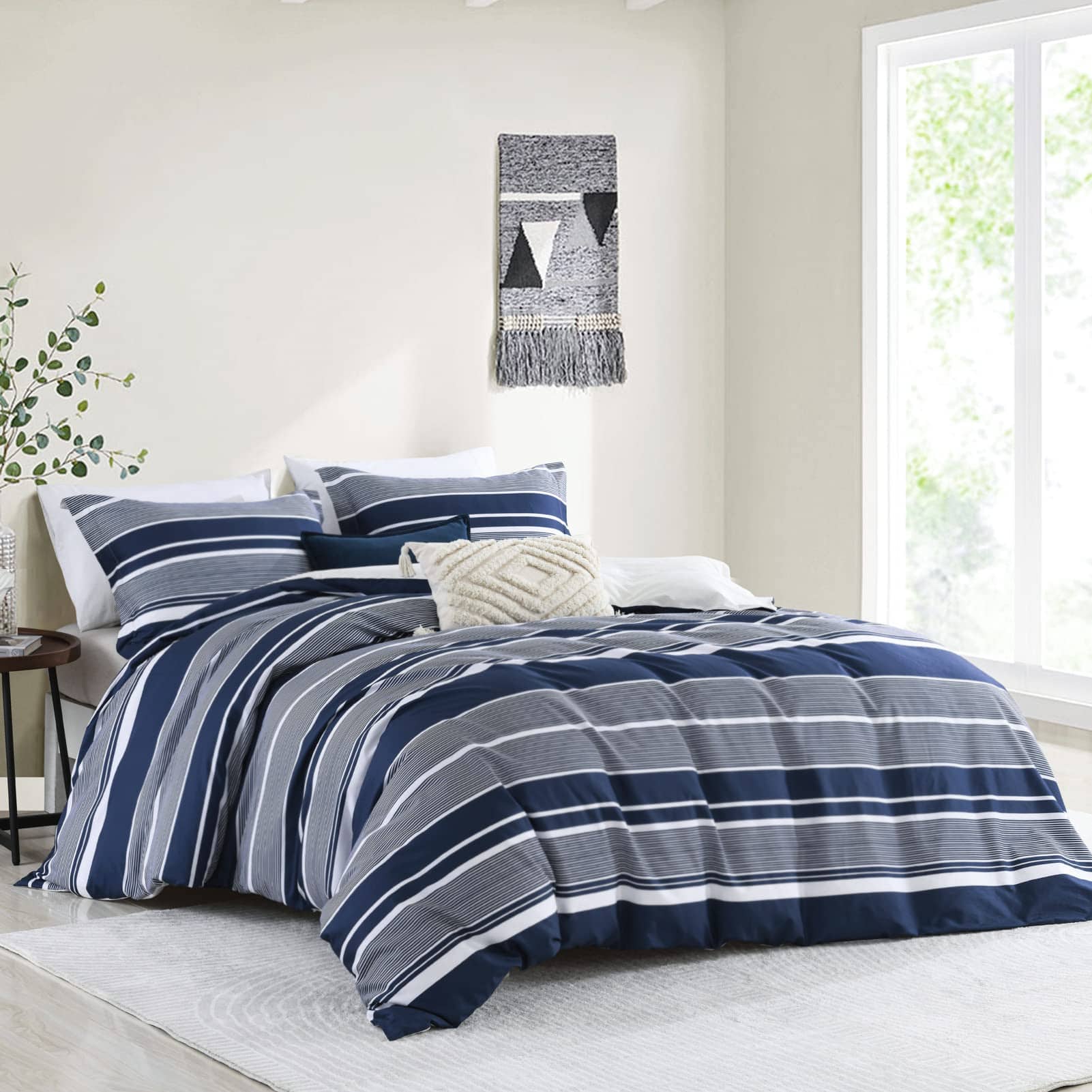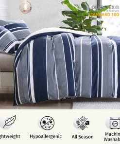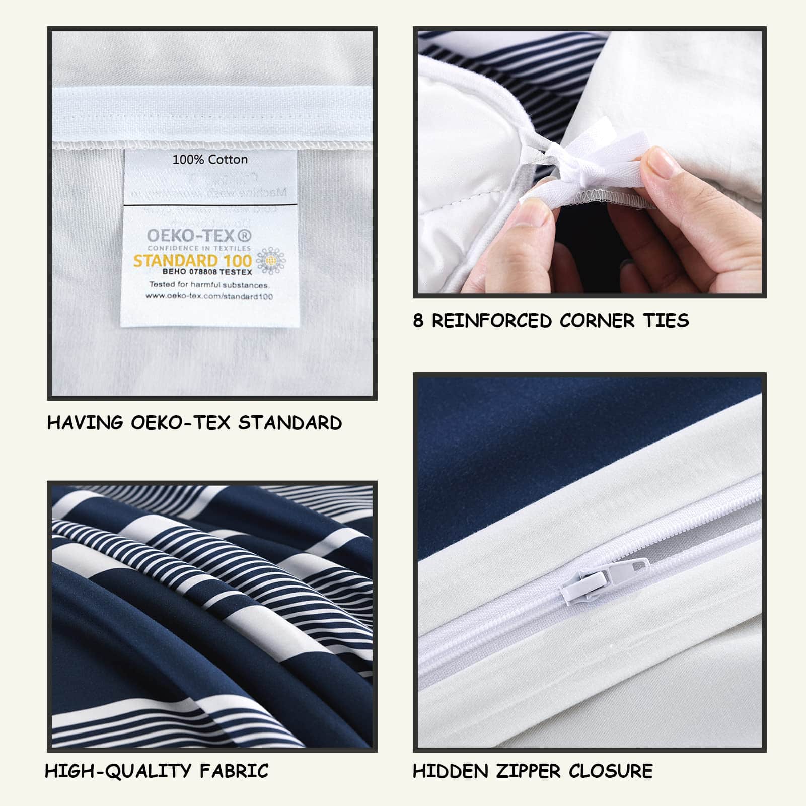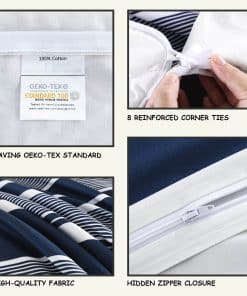 1. Funda de Edredón King de Algodón 100% La funda de edredón king a rayas está hecha de 100% algodón, suave, seguro y respetuoso con la piel de tu familia. El tejido lavado previamente hace que la tela sea suave, se irá volviendo cada vez más suave con cada lavado. Disfrutarás de un sueño más cómodo durante todo el año con el juego de funda de edredón king. 2. Funda de Edredón Azul Marino King El juego de funda de edredón king de minimalismo es reversible. Esta funda de edredón a rayas king size añadirá mucha moda al hogar y combinará con diferentes estilos de dormitorio. Los colores disponibles tienden a ser neutros y pueden llevar fácilmente un aspecto relajado y vivido a la decoración de cualquier habitación. 3. ESTÁNDAR 100 por OEKO-TEX Somos miembros orgullosos de la Iniciativa del Algodón Mejorado (BCI). El proceso de producción de la funda de edredón king cumple con los estándares internacionales, con una excelente sensación de seguridad, asegurando que los consumidores de todo el mundo puedan usarla con total tranquilidad. 4. Cierre de Cremallera y 8 Lazos en las Esquinas La funda de edredón king size cuenta con un cierre de cremallera oculto, es más conveniente que otros tipos de cierre. Fácil de poner y sacar tu edredón de esta funda, costuras con lazos en 8 esquinas dentro de tus fundas de edredón para asegurar que tu edredón se mantenga en su lugar y te mantenga cómodo toda la noche. 5. Juego de Fundas de Edredón Incluye El juego de funda de edredón con cierre de cremallera de 3 piezas incluye 1 funda de edredón king a rayas (104×90 pulgadas), 2 fundas de almohada (20×36 pulgadas). No incluye edredón ni relleno de edredón.