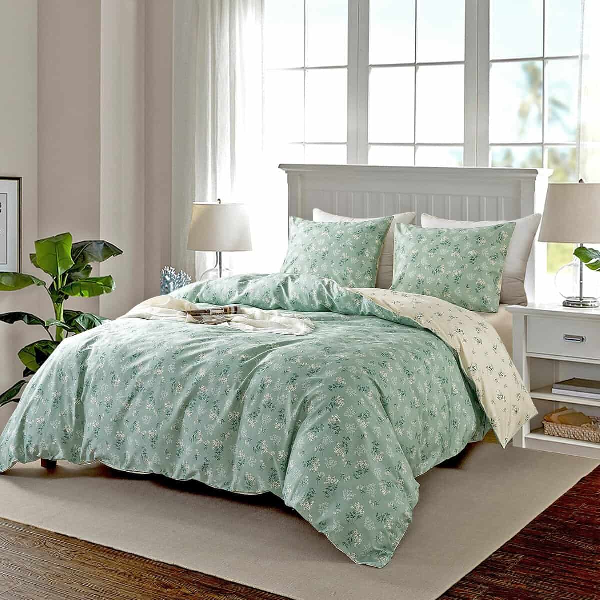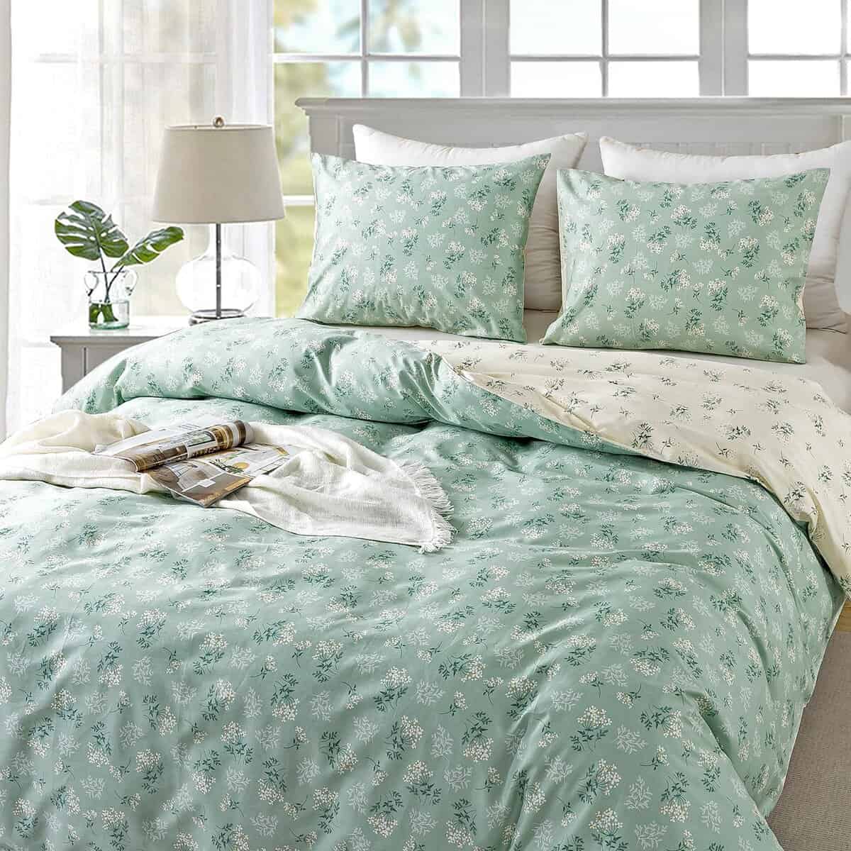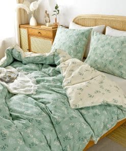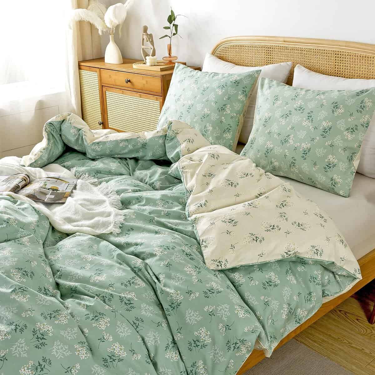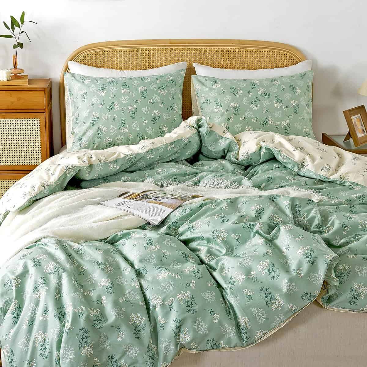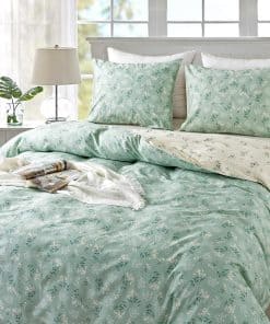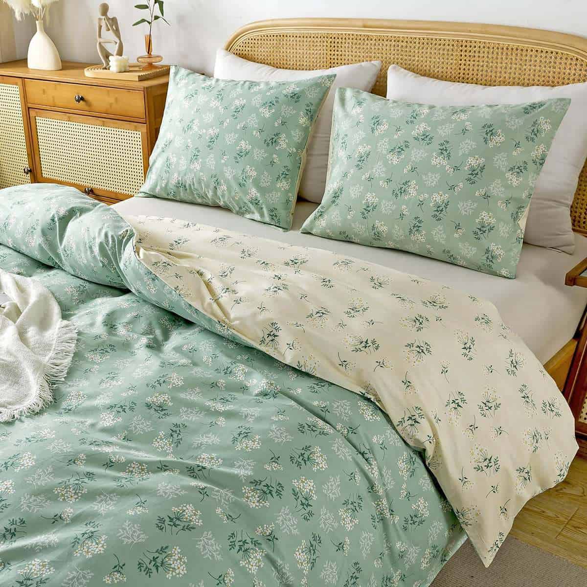 3. Diseño Único — Reversible, lado A con delicado estampado floral en verde lago fresco, lado B con delicado estampado floral en beige.