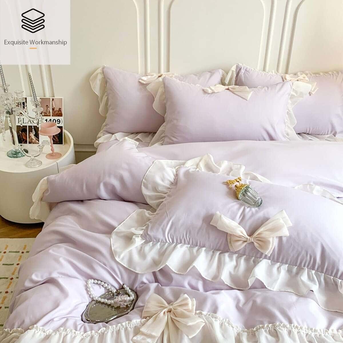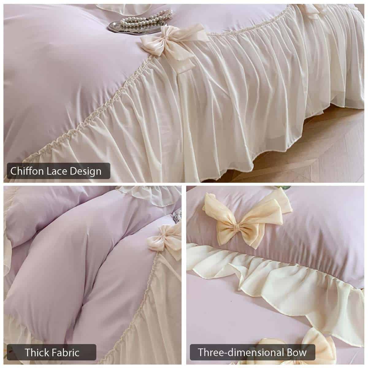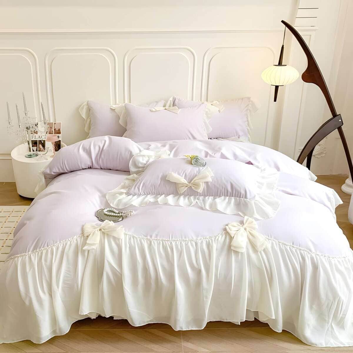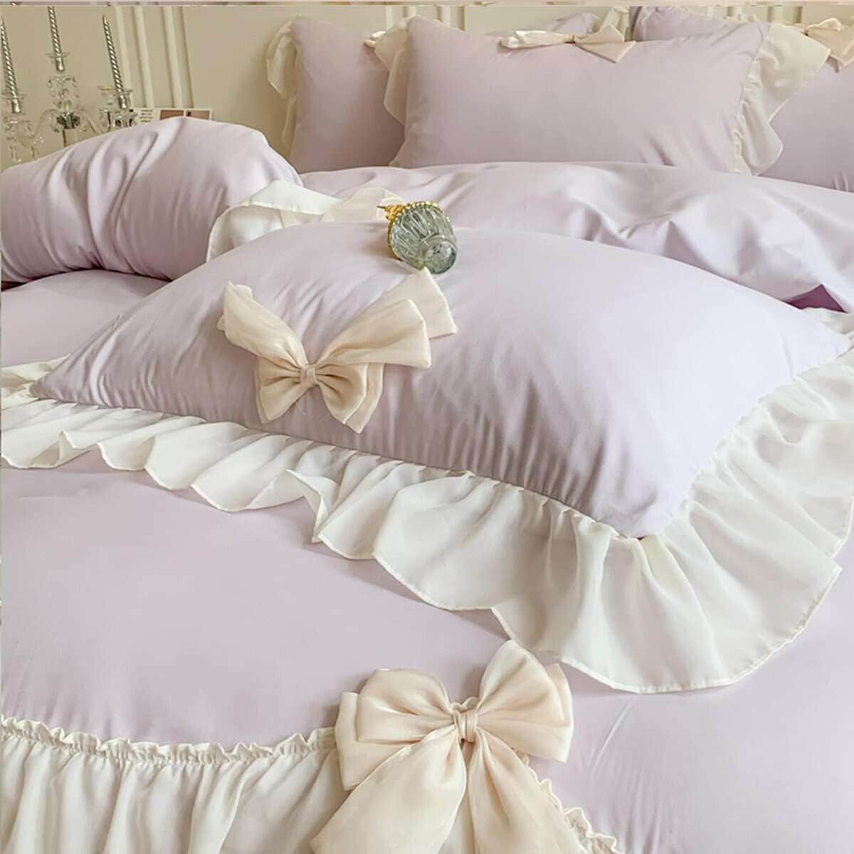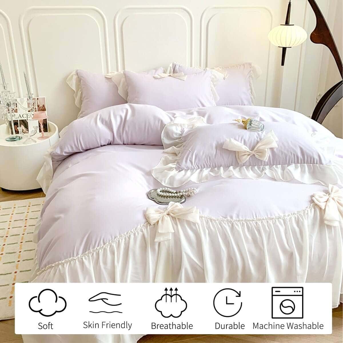 Fundas de Edredón Rvciby Morado para Cama Matrimonial de tamaño completo, hechas de microfibra suave y cómoda. El diseño romántico francés incluye encaje de chifón y lazos lindos que añaden un toque de diversión y elegancia a cualquier habitación. La funda de edredón está diseñada con lazos en las esquinas para mantener el edredón en su lugar y una cremallera que facilita la inserción y extracción del edredón. El patrón del edredón utiliza tecnología avanzada para garantizar que los colores sean vibrantes y no se desvanezcan con el tiempo. La funda de edredón es extremadamente duradera y resistente a las roturas, protegiendo contra cualquier encogimiento después de lavarla. Este juego de 3 piezas incluye una funda de edredón de tamaño completo y 2 fundas de almohada a juego. Fácil de cuidar, simplemente lavar a máquina en frío y secar a fuego lento. Añade un toque de romance y comodidad a tu habitación con estas hermosas fundas de edredón