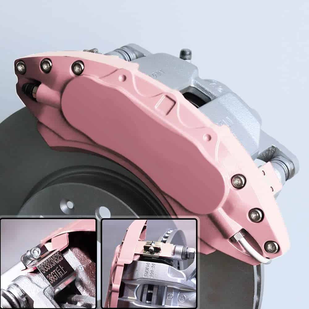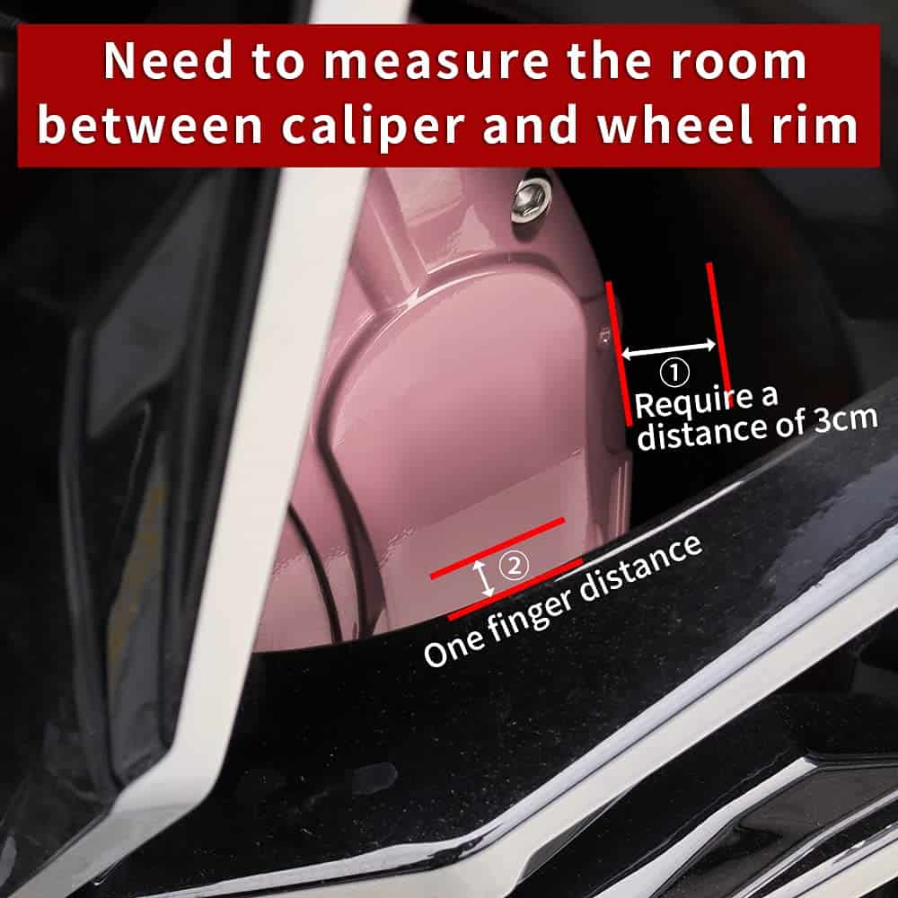 1. Actualice su automóvil con fundas premium para pinzas de freno de aluminio, diseñadas especialmente para vehículos con ruedas de 18″ o más grandes. Para ruedas personalizadas, asegúrese de al menos 3 mm de espacio libre entre la pinza y la superficie interna de la rueda.