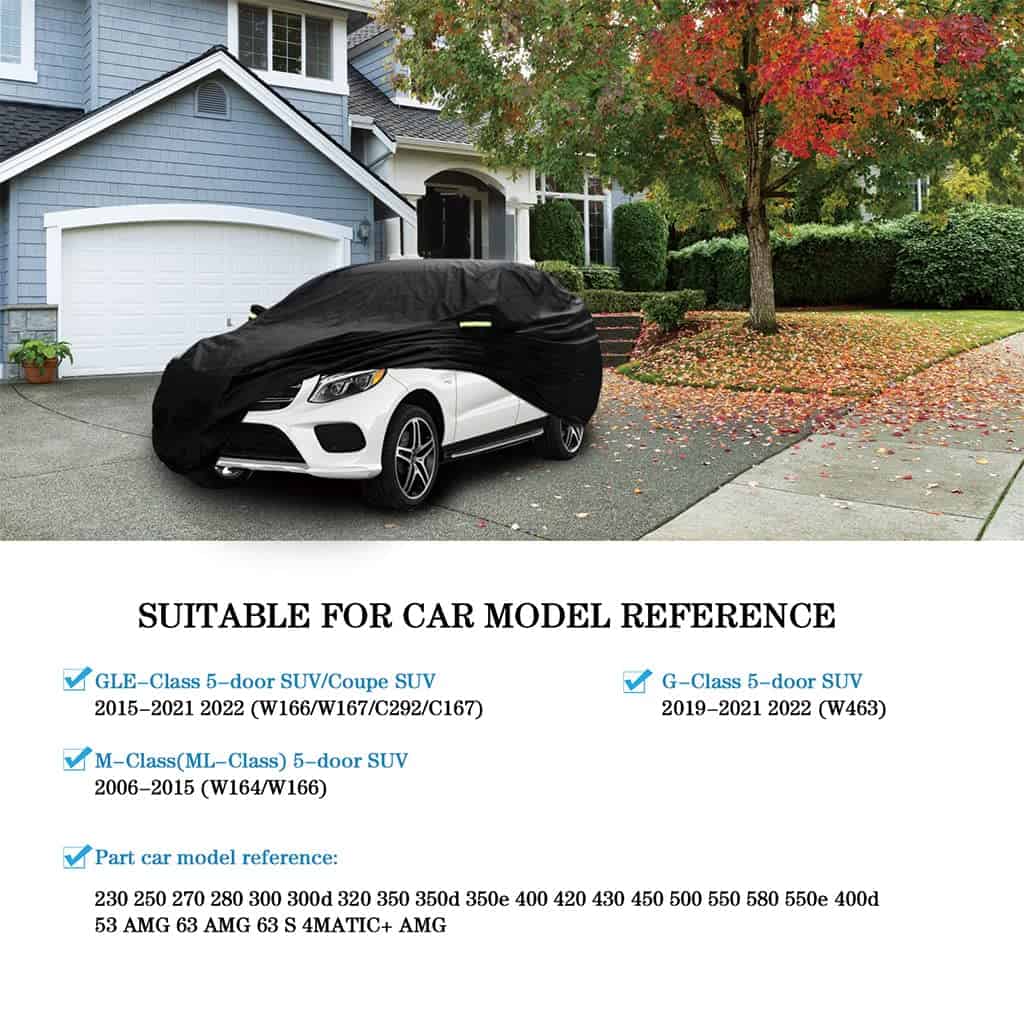 Funda para coche Abdeck compatible con Mercedes-Benz GLE Clase 2015-2023/ ML Clase 2006-2015 SUV. Esta funda para coche está diseñada para proteger su vehículo de manera completa y eficaz en todo tipo de condiciones climáticas adversas. Con un tamaño compatible con varios modelos de Mercedes-Benz, este producto es perfecto para aquellos propietarios que desean mantener su automóvil en condiciones óptimas en todo momento. La funda para coche Abdeck cuenta con una construcción duradera y resistente a las roturas, lo que garantiza una protección confiable a lo largo del tiempo. El material exterior de tela Oxford es transpirable y ayuda a mantener su coche libre de humedad y moho. Además, la capa interior de suave algodón evita arañazos en la pintura y los espejos. El diseño de la funda incluye tiras reflectantes para una mayor visibilidad nocturna y correas a prueba de viento para asegurar un ajuste perfecto. Proteja su automóvil de la lluvia, los rayos UV, la nieve, el polvo, los excrementos de pájaros y más con esta funda para coche de alta calidad. La funda para coche Abdeck es la solución ideal para mantener su vehículo protegido y en condiciones óptimas en todo momento.
