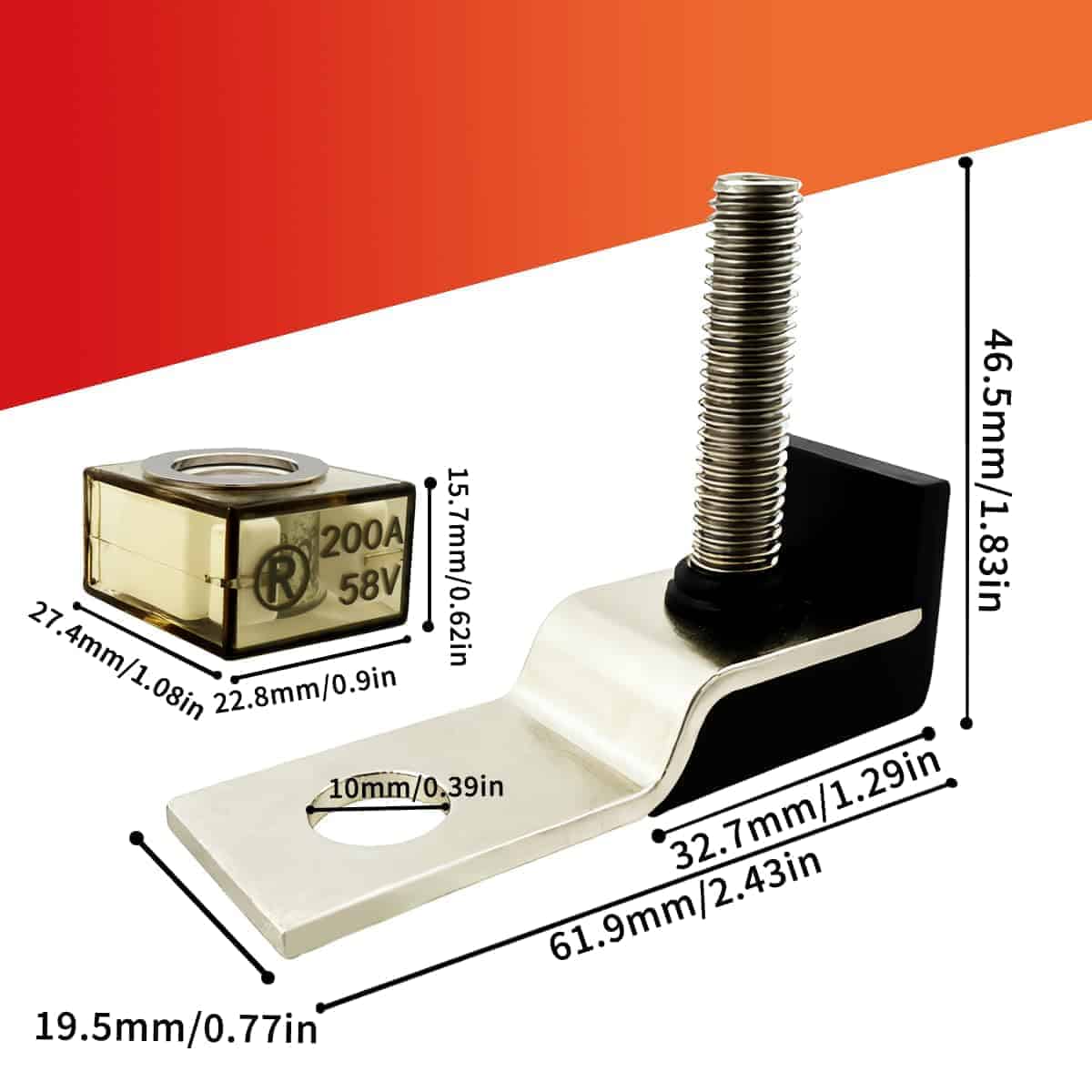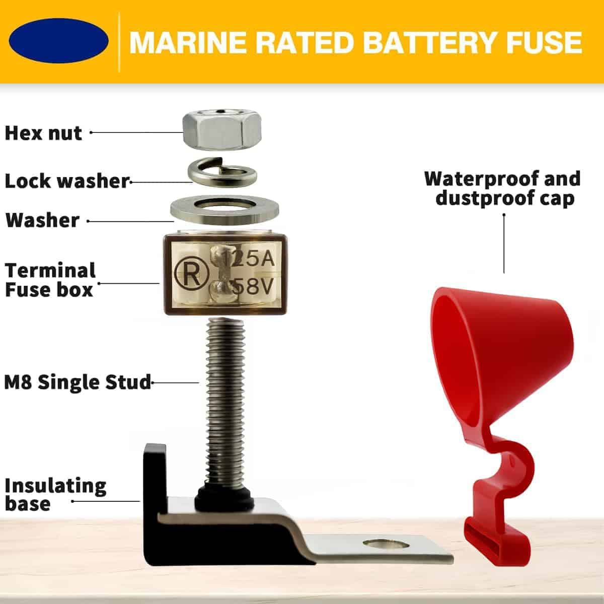 1. Parámetro del Fusible: Perno Individual 5/16″(M8); fusible portafusible de batería para vehículos y barcos; Voltaje Nominal: Máximo 58VDC; Corriente: 100A.