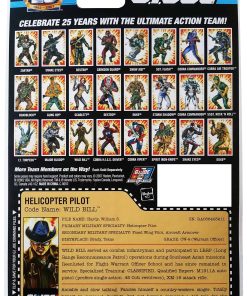 Wild Bill sirvió como infante de combate y participó en operaciones de patrulla de reconocimiento de largo alcance durante misiones en el sudeste asiático. Reingresó a la Escuela de Oficiales de Vuelo y desde entonces ha permanecido en servicio. A pesar de ser afable y hablar lentamente, este nativo de Texas se imagina a sí mismo como un cantante de música country-western. Totalmente honesto en sus tratos personales, pero no se le escapa contar una gran historia para divertir a sus camaradas. ¡Frusta a los adversarios de G.I. Joe o simplemente aumenta tu colección con esta figura de acción de piloto de helicóptero con sombrero de vaquero! Totalmente articulado, esta figura del 25º aniversario viene con 2 accesorios de pistola y soporte de exhibición.