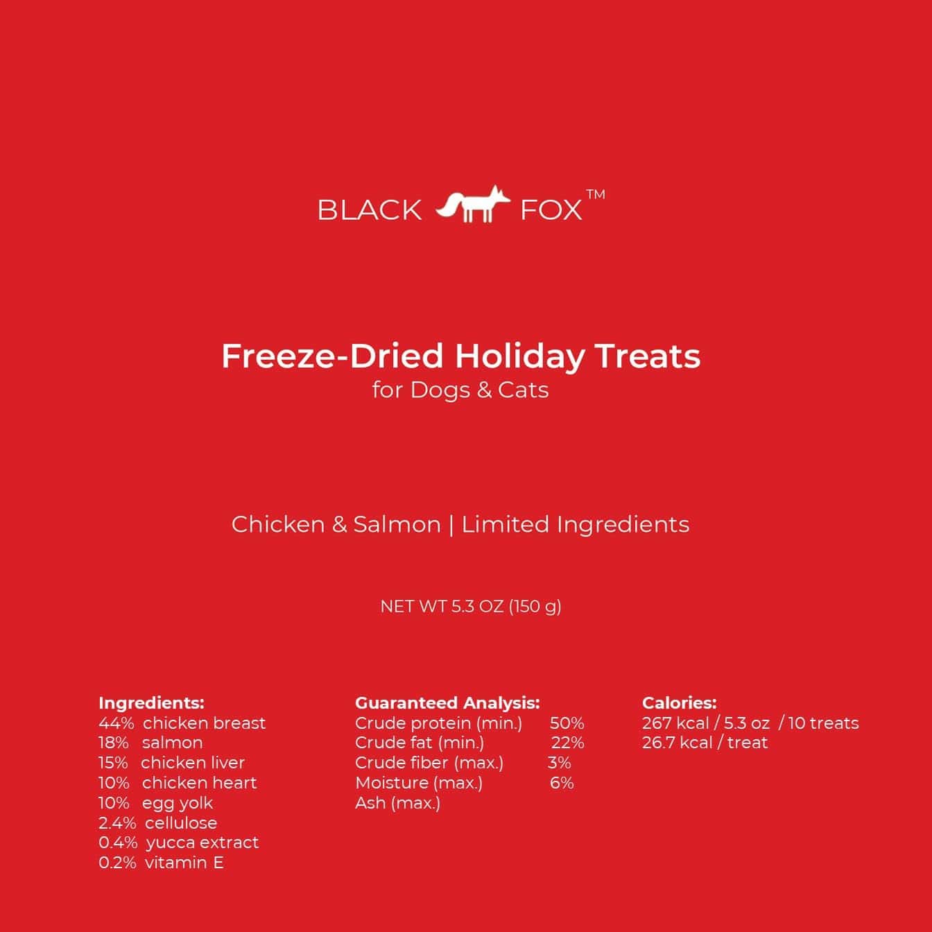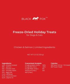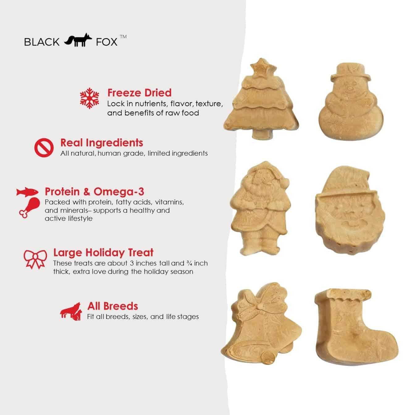Las golosinas deshidratadas sin gluten de BLACK FOX son ingredientes reales, altos en proteínas, divertidos y saludables. Las golosinas miden 3 pulgadas de alto y 1 pulgada de grosor, perfectas para darle a tus mascotas un poco de espíritu festivo. Son adecuadas para todas las razas, tamaños y edades.