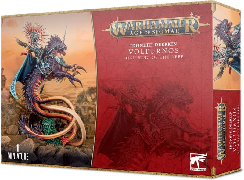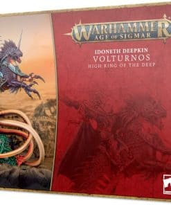 Este kit de plástico multiparte contiene los componentes necesarios para ensamblar a Volturnos, Rey Supremo de las Profundidades. Preparado para la guerra, lleva una brillante y pesada armadura de placas, destacando las protecciones de piernas y hombros que se extienden mucho más allá de sus hombros reales, proporcionando soporte para una enorme y ancha capa que ondea hacia afuera y hacia abajo, con símbolos de los Idoneth en los bordes. En su mano derecha con guanteletes sostiene el Astra Solus, una hoja dentada y malévola, y en la izquierda porta Cealith, el escudo del Rey Supremo. Sobre su cabeza afeitada (¡completa con parche en el ojo!) está el Cresta de los Reyes Supremos – una bandera alta y majestuosa con símbolos de metal tallados de los Idoneth y una joya grande destacando prominentemente. Su montura, Uasall, es un Deepmare de renombre – una criatura masiva y escamada cuyas patas delanteras terminan en enormes garras y cuya mitad trasera se divide en 3 colas poderosas, distinguible de otros Deepmares por su cuerno perforante más grande. Se incluye una waystone aelfica como un detalle atmosférico para la base.