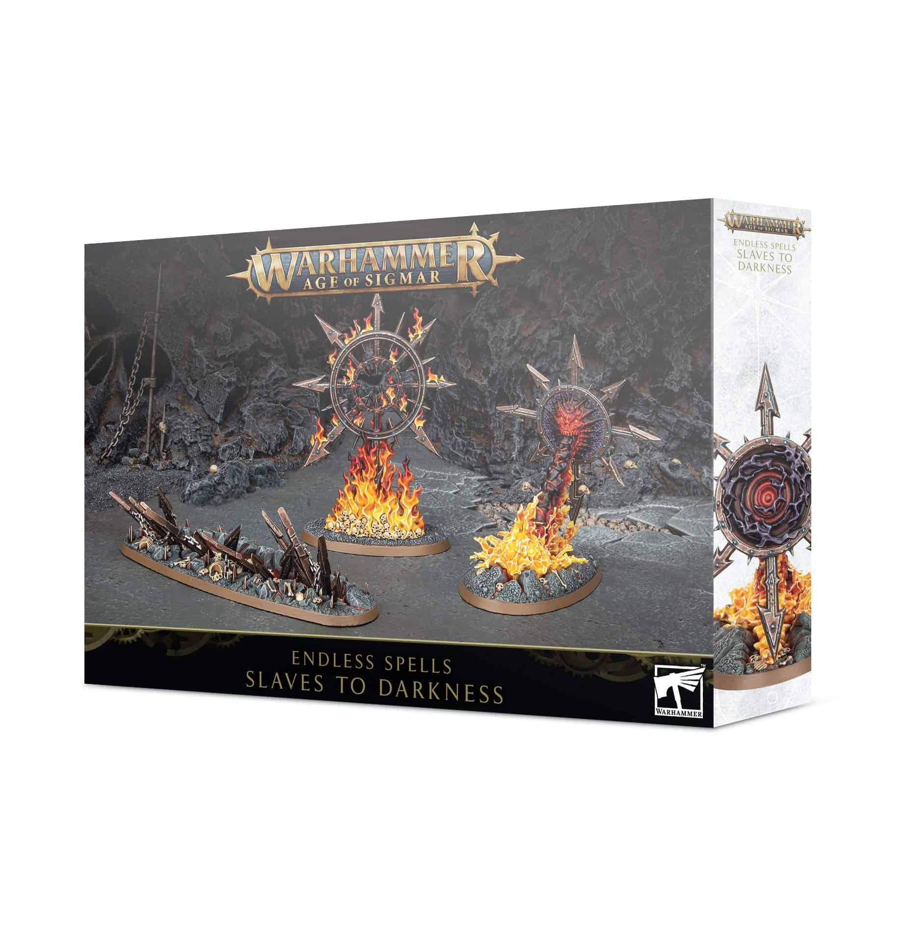Unleash the malevolent magics of the Slaves to Darkness with these extra-evil endless spells! Castable by any Slaves to Darkness sorcerer including Archaon, Everchosen himself these summoned sorceries add extra tactical depth to your army, giving you new ways to empower your dark legions or incinerate enemies. This set contains 3 plastic endless spells, consisting of: – The Eightfold Doom-Sigil, a blazing icon of Chaos that empowers nearby Slaves to Darkness units – The Darkfire Daemonrift, an eldritch portal which deals mortal wounds and gets even more powerful when close to other Endless Spells – The Realmscourge Rupture, a tide of ruin that damages enemies while slowing them down at the same time This set is supplied with 1x 75mm base (two of the Endless Spells have integrated bases!)