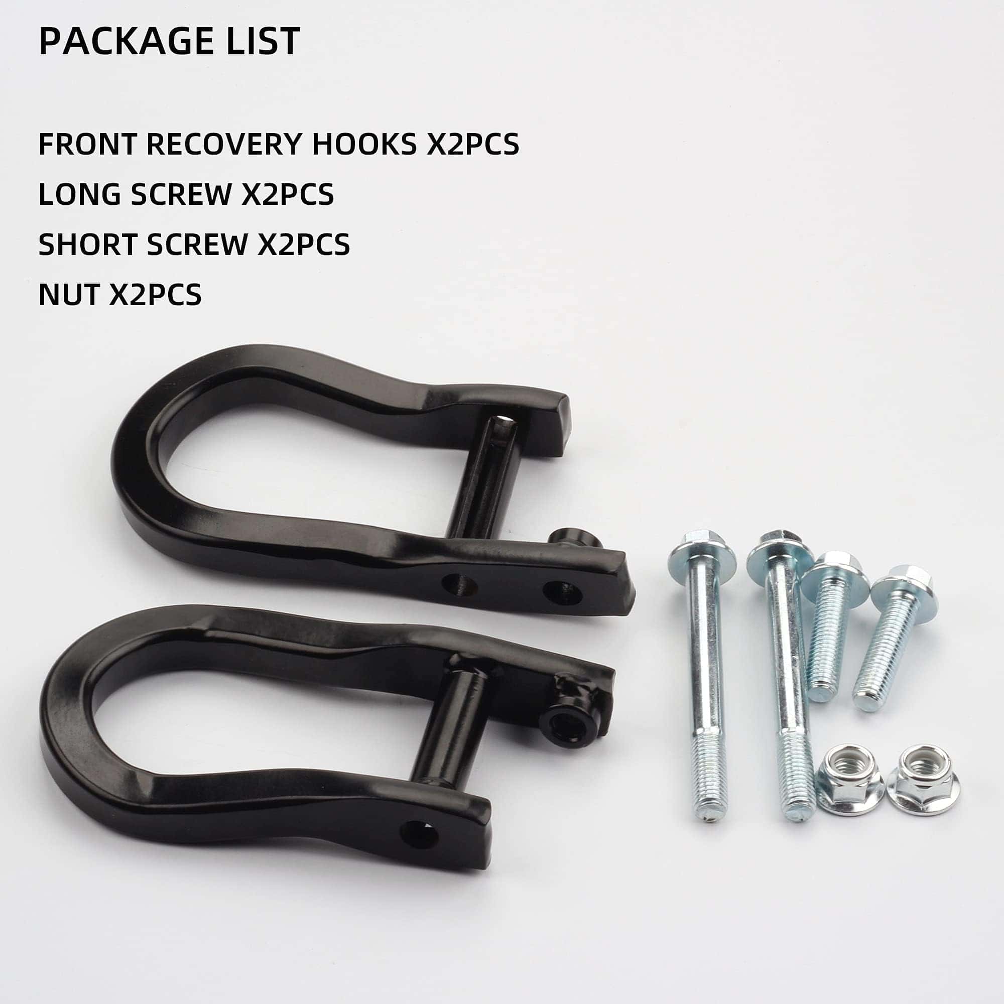 4. Lista de paquetes Ganchos de Recuperación delanteros x2pcs, Tornillo largo x2pcs, Tornillo corto x2pcs, Tuerca x2pcs.