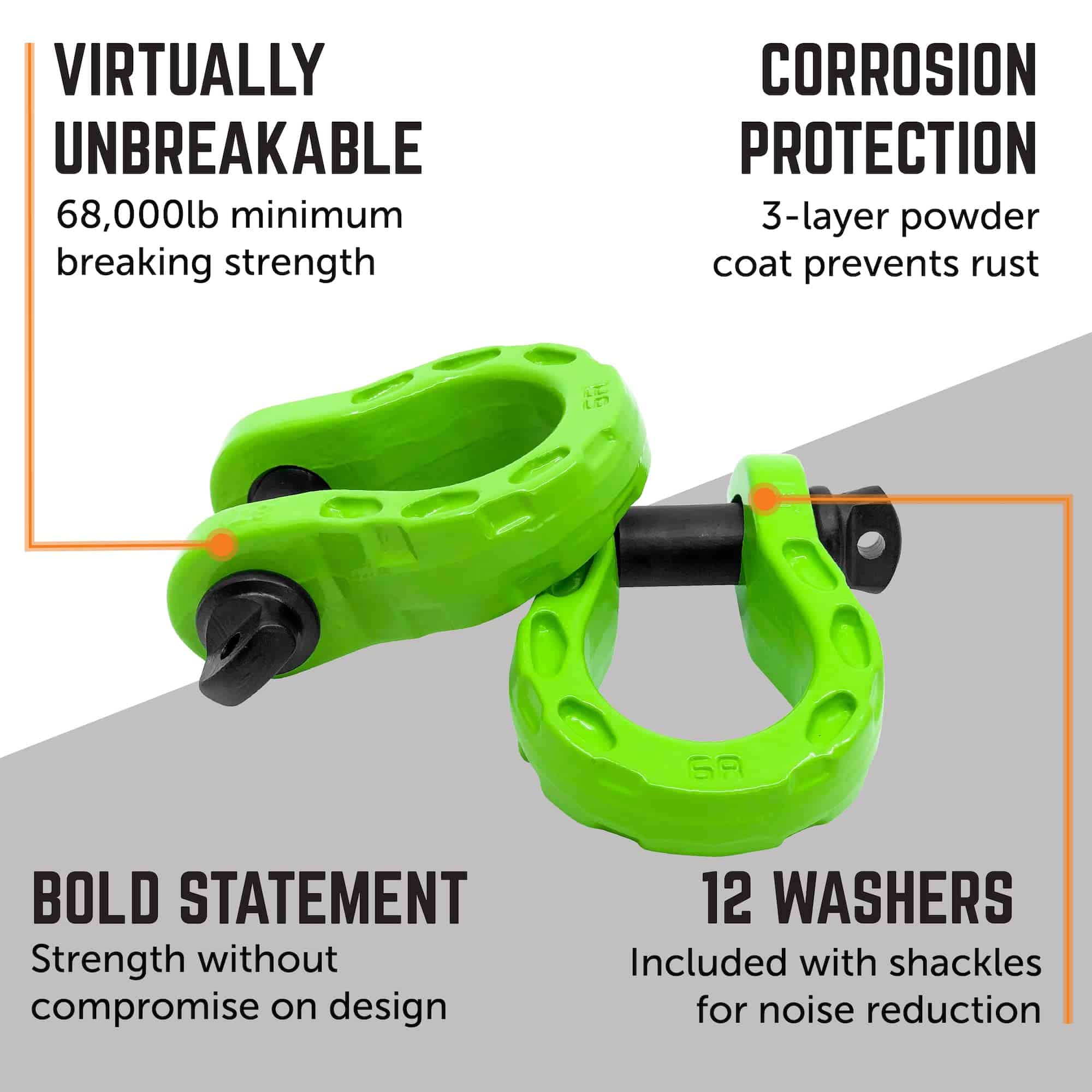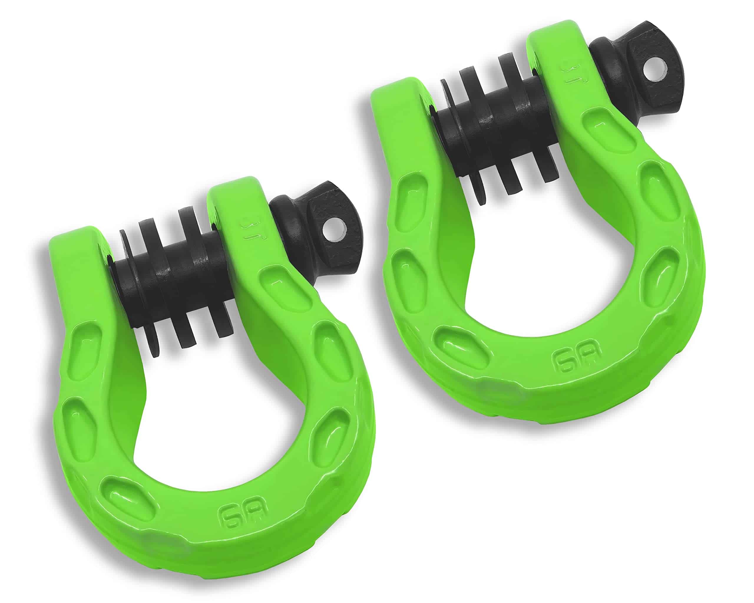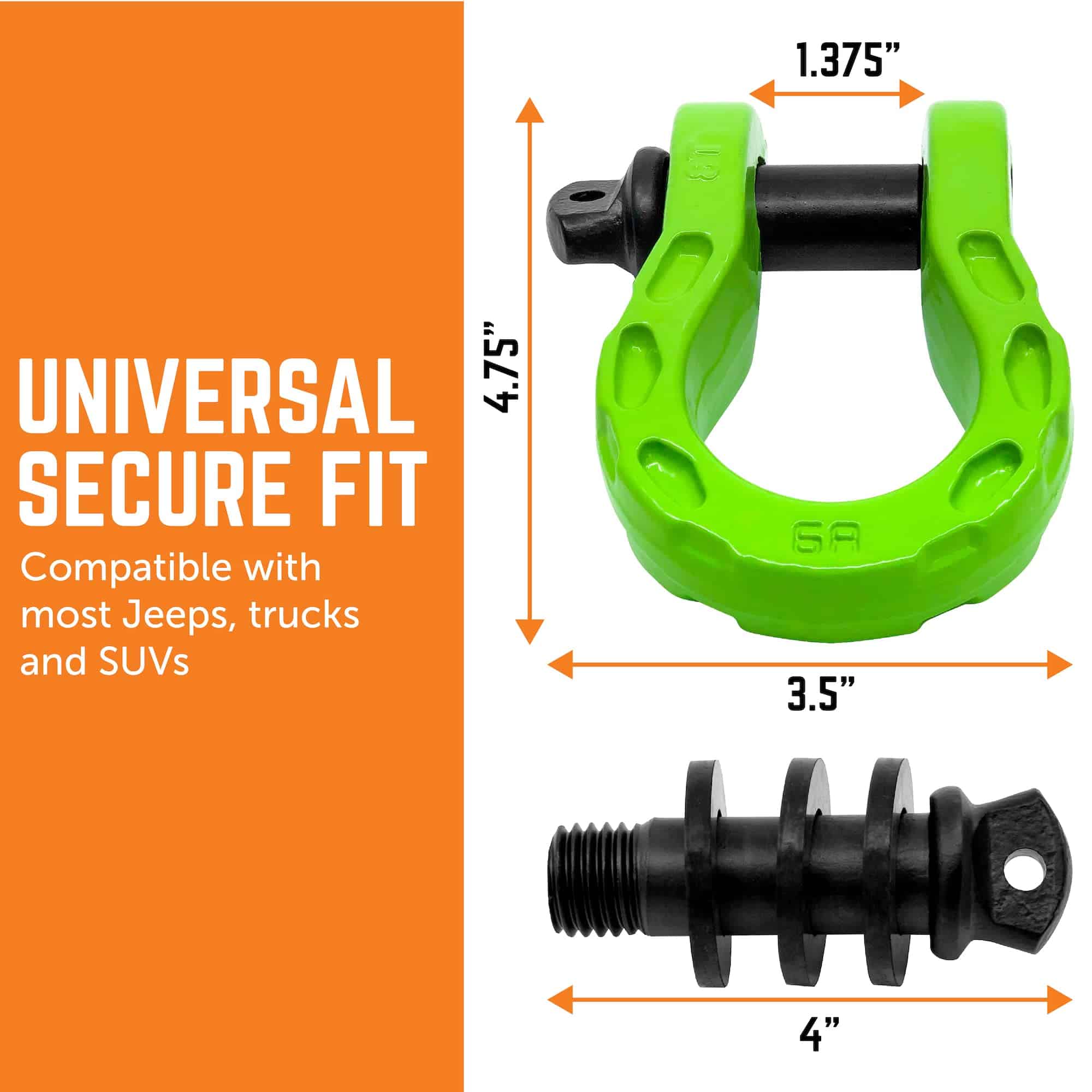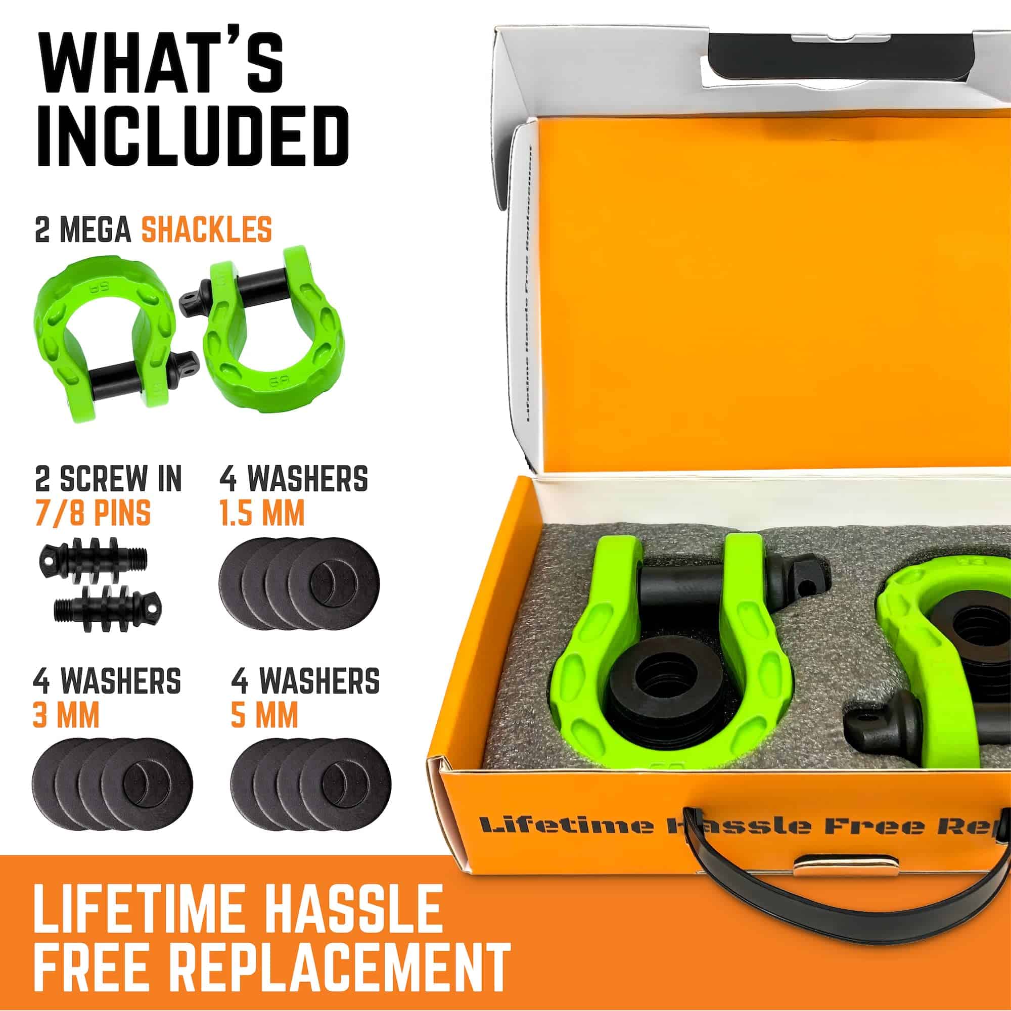CONJUNTO DE GANCHOS MEGA Los ganchos de arco de GearAmerica están diseñados para una durabilidad y longevidad extrema. Es por eso que ofrecemos orgullosamente nuestro programa de reemplazo gratuito de por vida en todos nuestros ganchos. Como bono gratuito – hemos incluido seis arandelas surtidas con cada Mega Ganchos que reduce en gran medida el ruido y protege contra los arañazos. Con una capacidad máxima de rotura de 68,000 LB y un límite de carga de trabajo de 17,000 LB (más del triple del peso de un Jeep Wrangler) puede remolcar o recuperar su 4×4 con confianza sin preocuparse nunca por el fallo del equipo. El conjunto de ganchos incluye: 2 piezas – Ganchos Mega D de 3/4» con pasador de 7/8″ atornillado 12 piezas – Arandelas surtidas para proteger sus ganchos y receptor de arañazos