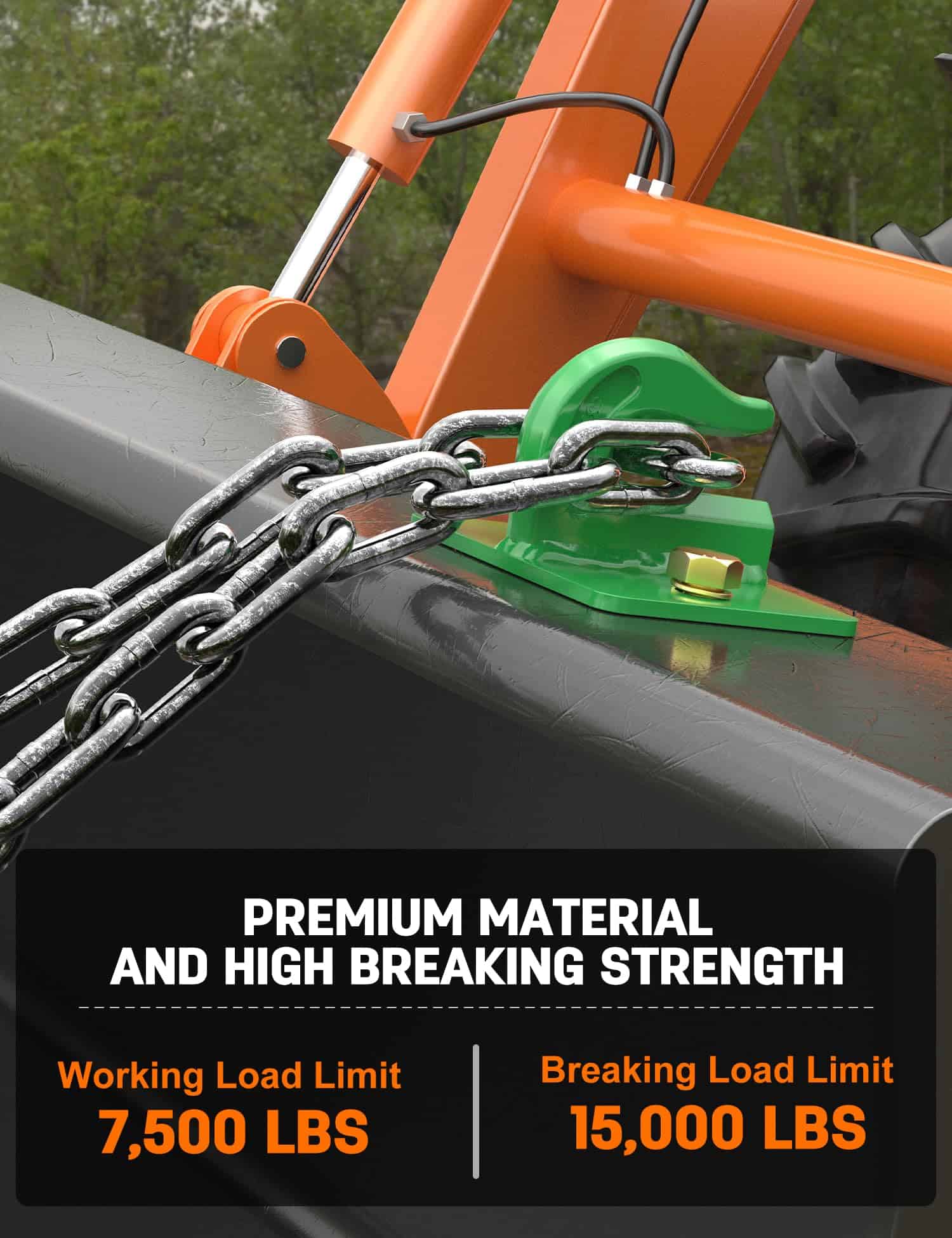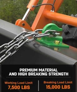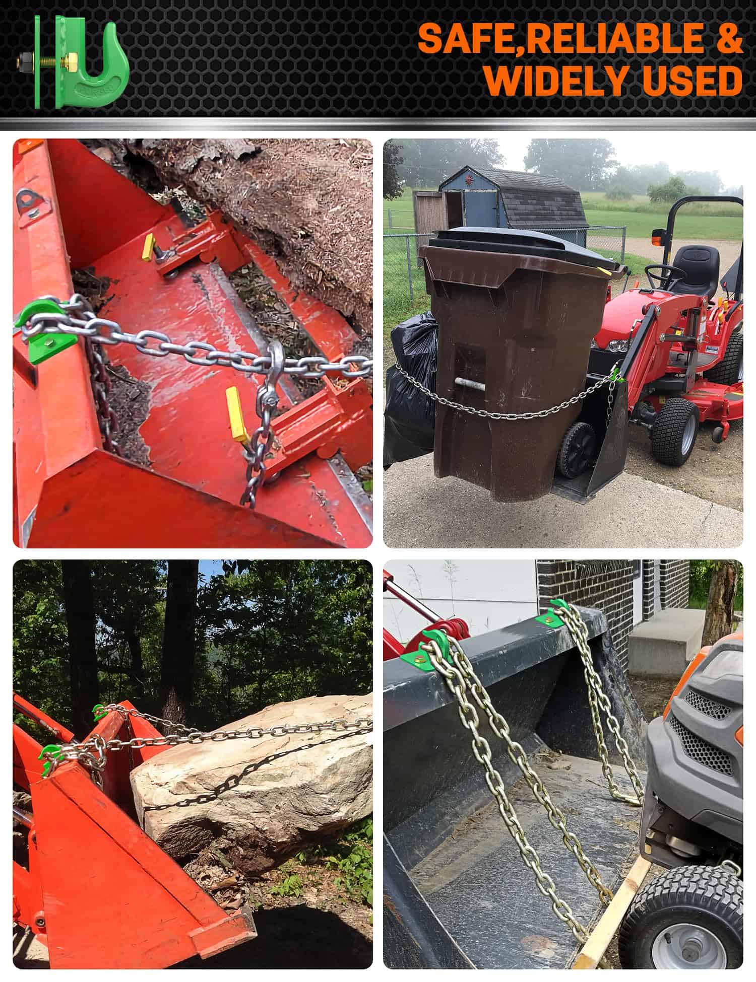3. Ganchos de remolque montados en el cubo, y utilizado con cadena para talar, levantar, arrastrar, mover, etc., también se utilizan como ganchos de remolque, es un buen accesorio para cubos de tractor y Skid Steer.