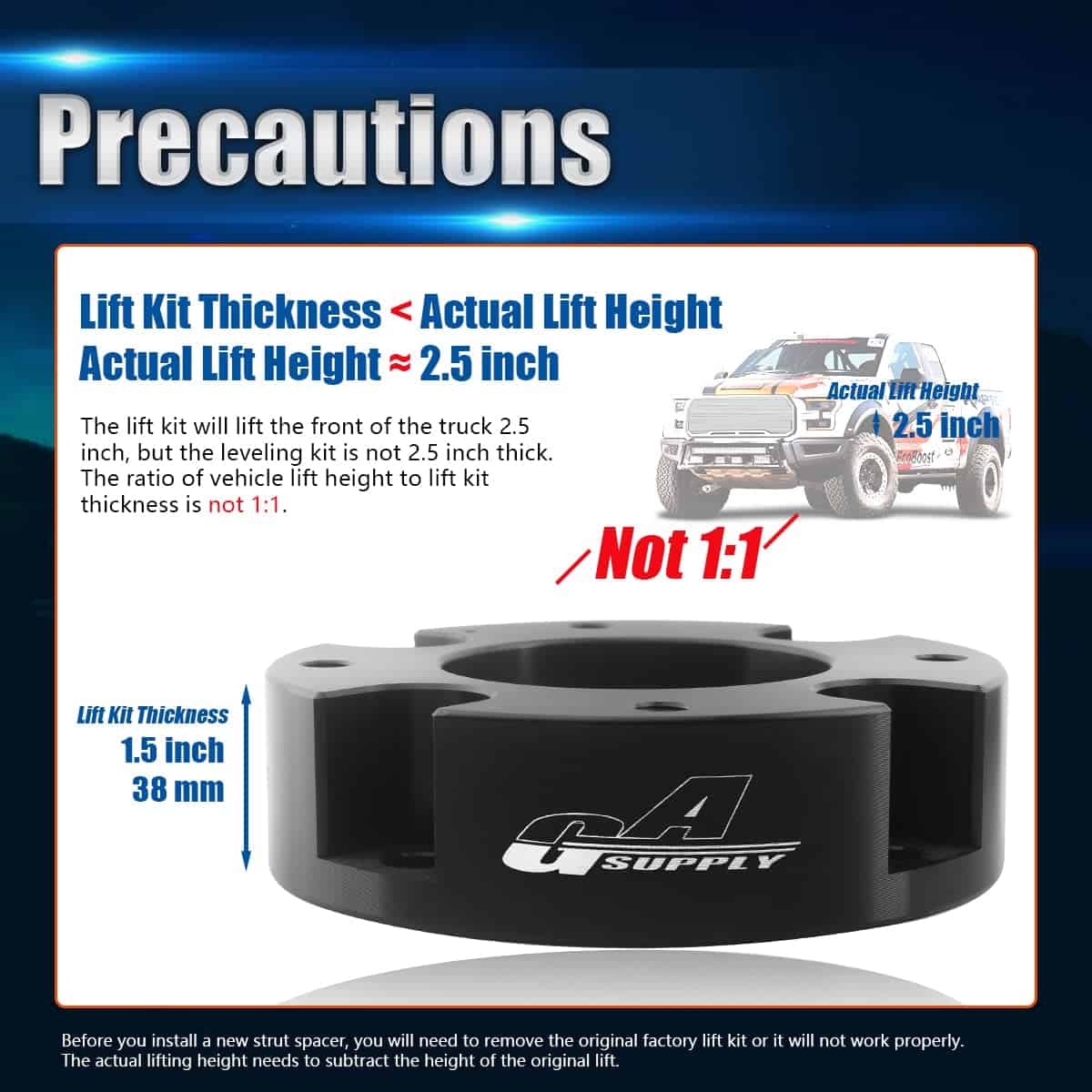 Paquete Incluido – 2 2.5 pulgadas (63.5mm) delanteros forjados Kits de Elevación Niveles Beneficios – Este espaciador de elevación del amortiguador puede expandir la brecha entre la rueda y el guardabarros, y ganar claridad adicional en el suelo para hacer que el vehículo se vea más agresivo. Puede instalar neumáticos/rines más grandes y anchos Material – Forjado de aluminio 6061 T6, con pernos 10.9, más sólido y confiable. La superficie es un recubrimiento negro único, que aporta una apariencia más destacada y no es fácil de oxidar y desvanecerse Nota – Debido a la geometría de la suspensión, la altura del kit de espaciadores del amortiguador y el grosor del kit no son 1:1, levantarán la camioneta delantera en 2.5», pero el espesor del kit delantero es inferior a 2.5» Instalación – Fijación con pernos, fácil de instalar, no se requiere modificación del vehículo. Se tarda aproximadamente 1-2 horas. Ahorre su tiempo y dinero