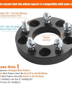 Confirme la compatibilidad con su vehículo antes de comprar. Compatible con 1979-1985 Buick Riviera 2004-2009 Cadillac XLR 1979-1985 Cadillac Eldorado 1976-1980 Cadillac Seville 1985-2013 Chevrolet Corvette 1982-2004 Chevrolet S10 1982-2002 Chevrolet Camaro 1983-1994 Chevrolet S10 Blazer 1982-1987 Chevrolet El Camino 1990-2005 GMC Jimmy 1991-2004 GMC Sonoma 1982-1990 GMC S15 1982-2000 Pontiac Firebird 1980-1984 Pontiac Phoenix 1964-1973 Pontiac GTO El vehículo DEBE tener un patrón de pernos de 5×4.75 (5×120.65mm) Las ruedas DEBEN tener un patrón de pernos de 5×4.5 (5×114.3mm) El vehículo DEBE tener pernos/tuercas de rueda de 12×1.5 ¡SOLO FUNCIONA con RUEDAS de 5x 4.5! NO FUNCIONA con RUEDAS de 5x 4.75 Beneficios – Amplíe la base de ruedas de su vehículo, aumentando la estabilidad y la resistencia a la volcadura lateral. – Proporcione un control adicional para los pilotos experimentados y brinde un margen de seguridad adicional para los pilotos más jóvenes o inexpertos. – Apariencia agresiva, con la base de pista ensanchada, su vehículo favorito obtendrá un aspecto más elegante. Características – Sometido a un proceso de anodización para prevenir la corrosión y el óxido en la superficie. color duradero y no se desvanecerá fácilmente. – Hecho de aluminio billet 6061 T6, y preinstalado con pernos de grado 10.9, lo que lo hace más fuerte y más ligero. Nota Por favor, confirme la compatibilidad con su vehículo antes de comprar. Se recomienda la instalación profesional. Evite el uso de una llave de impacto Si el perno de la rueda sobrepasa la superficie de los separadores de 25 mm. Puede recortar la tuerca o reemplazarla con una tuerca más corta Si tiene alguna pregunta sobre los adaptadores de rueda, por favor contáctenos y le daremos una solución.