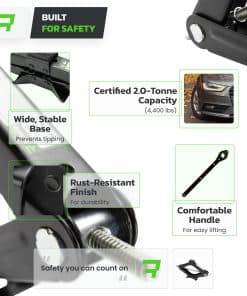 1. CAPACIDAD DE CARGA Rango de Elevación de Automóvil de 3.9″ (100mm) a 15.2″(385mm). Peso Máximo de Carga: 2.0 Toneladas (4,409 lbs). Peso Neto del Gato de Coche 4.84 lbs (2.2kg).