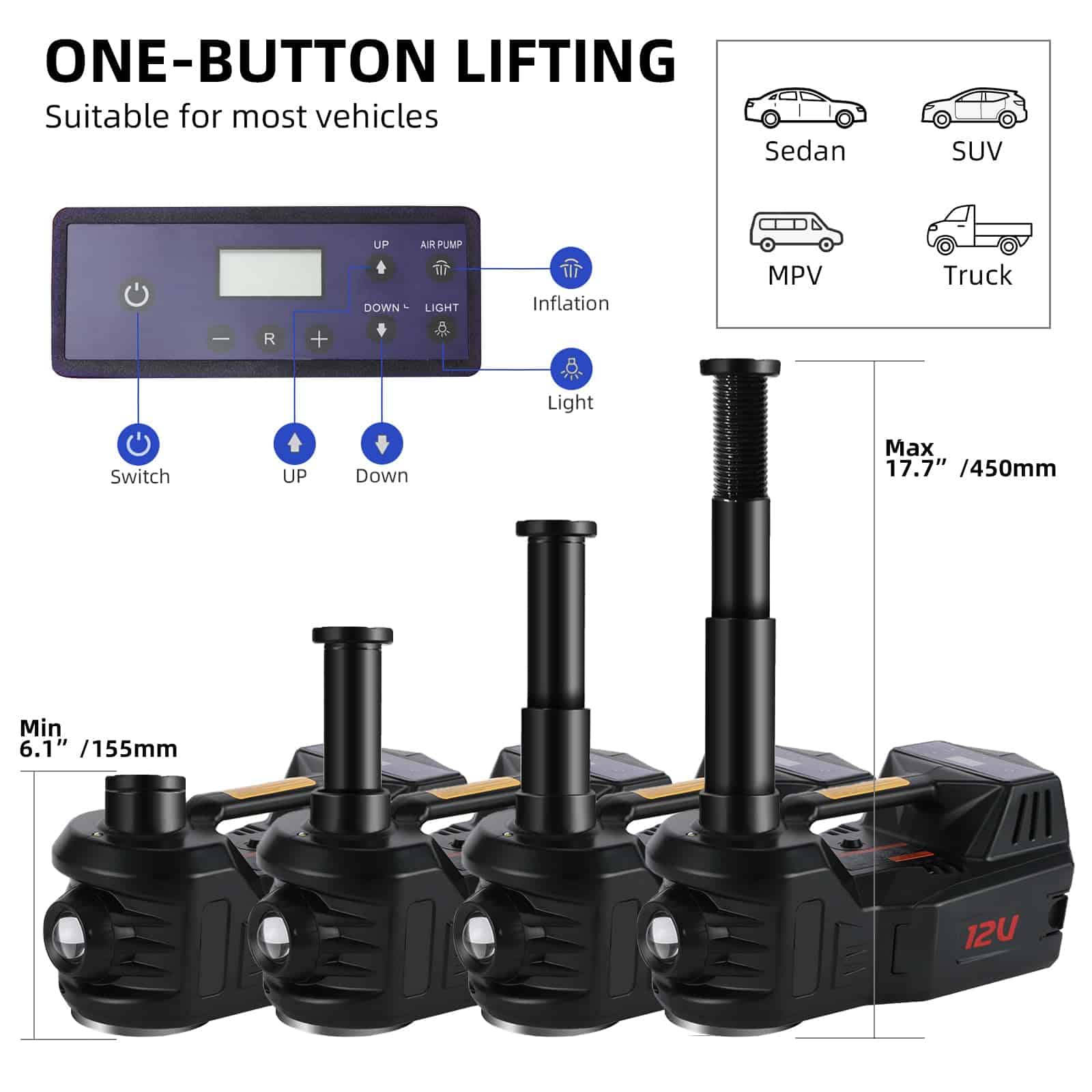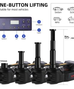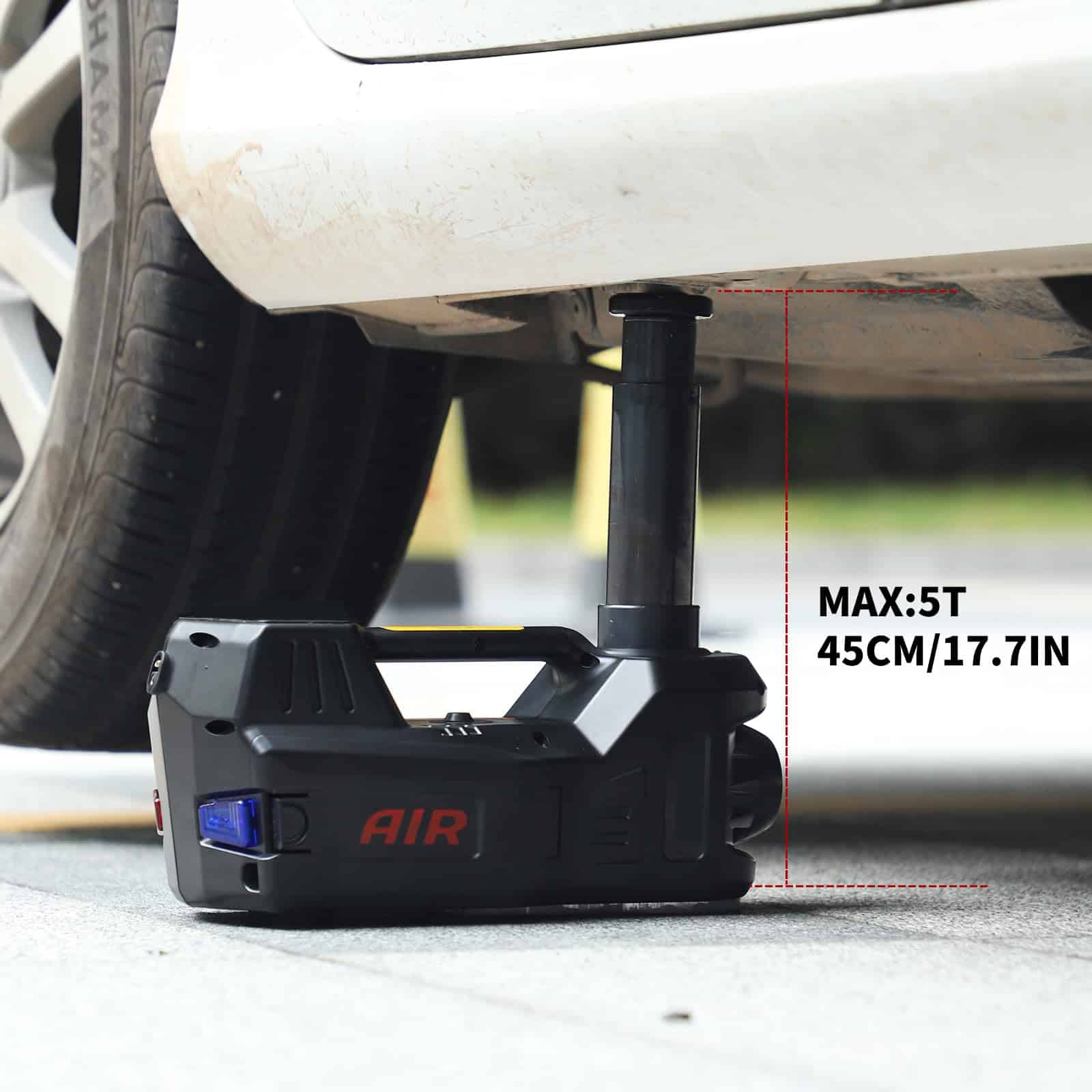2. RENDIMIENTO DEL PRODUCTO: Nuestro gato eléctrico para automóvil funciona con sistema hidráulico. Después de estar conectado, puede elevar vehículos de hasta 5 toneladas en menos de 2 minutos a su máx. (rango de altura de elevación de 6 a 17.7 pulgadas). El potente gato hidráulico es casi compatible con todos los autos, sedanes, SUV, MPV, camiones y camionetas, más competitivo que otros gatos de coche.