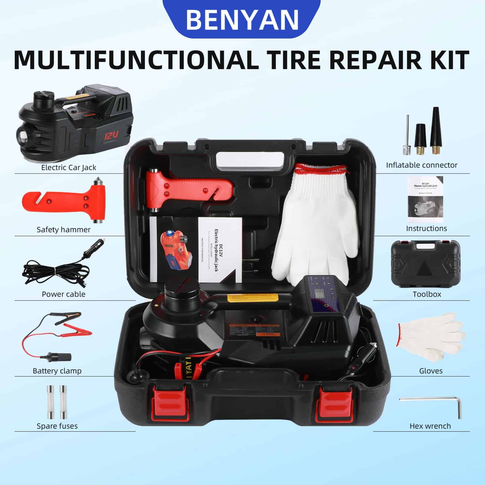 1. EL PAQUETE DEL PRODUCTO INCLUYE: gato eléctrico para automóvil; llave de impacto eléctrica; estuche de plástico; cable de alimentación de 3.5m; Pinza de batería con cable; Par de guantes; Manual de usuario, etc. Este kit incluye todo lo que necesita para emergencias en carretera y resulta muy conveniente para uso en casa.