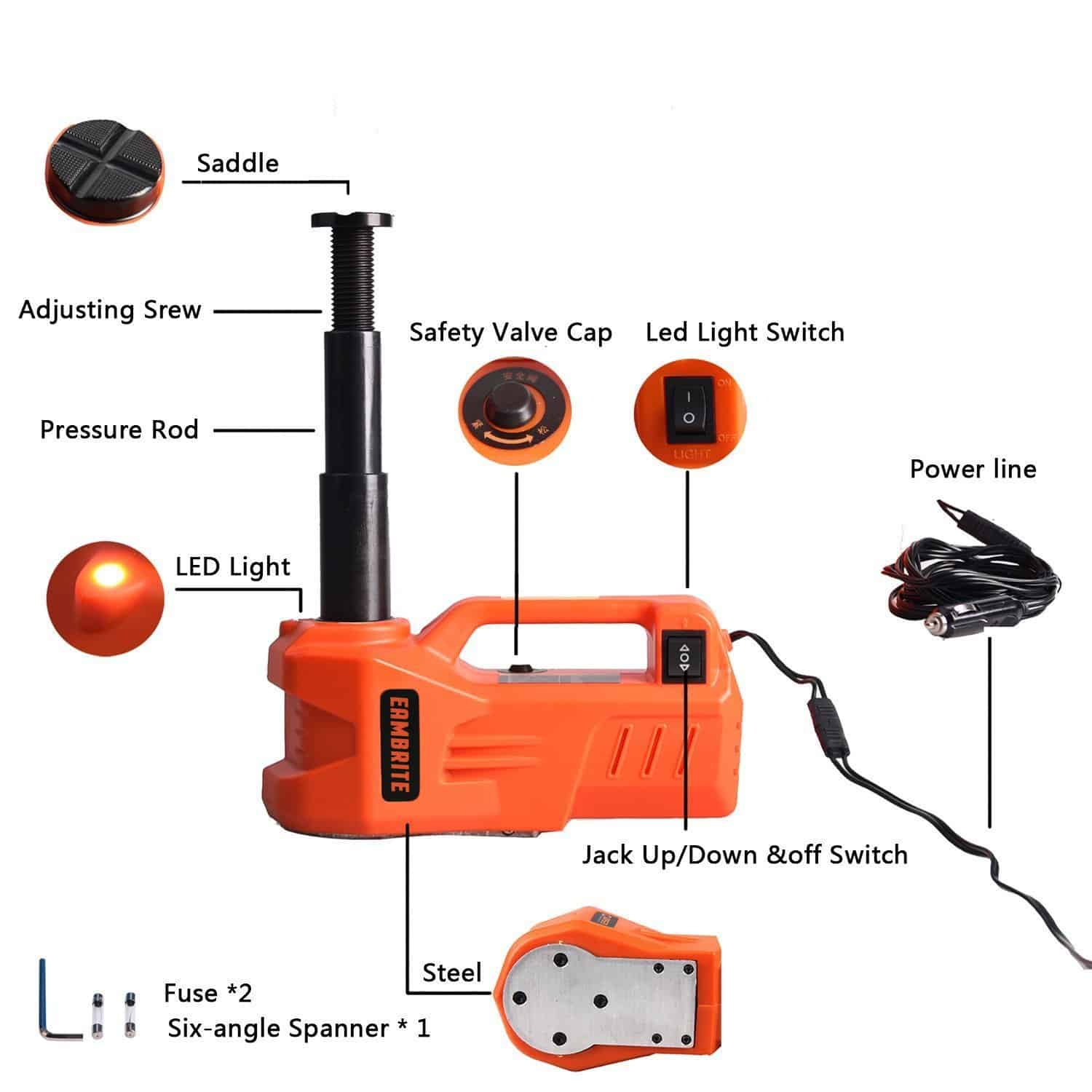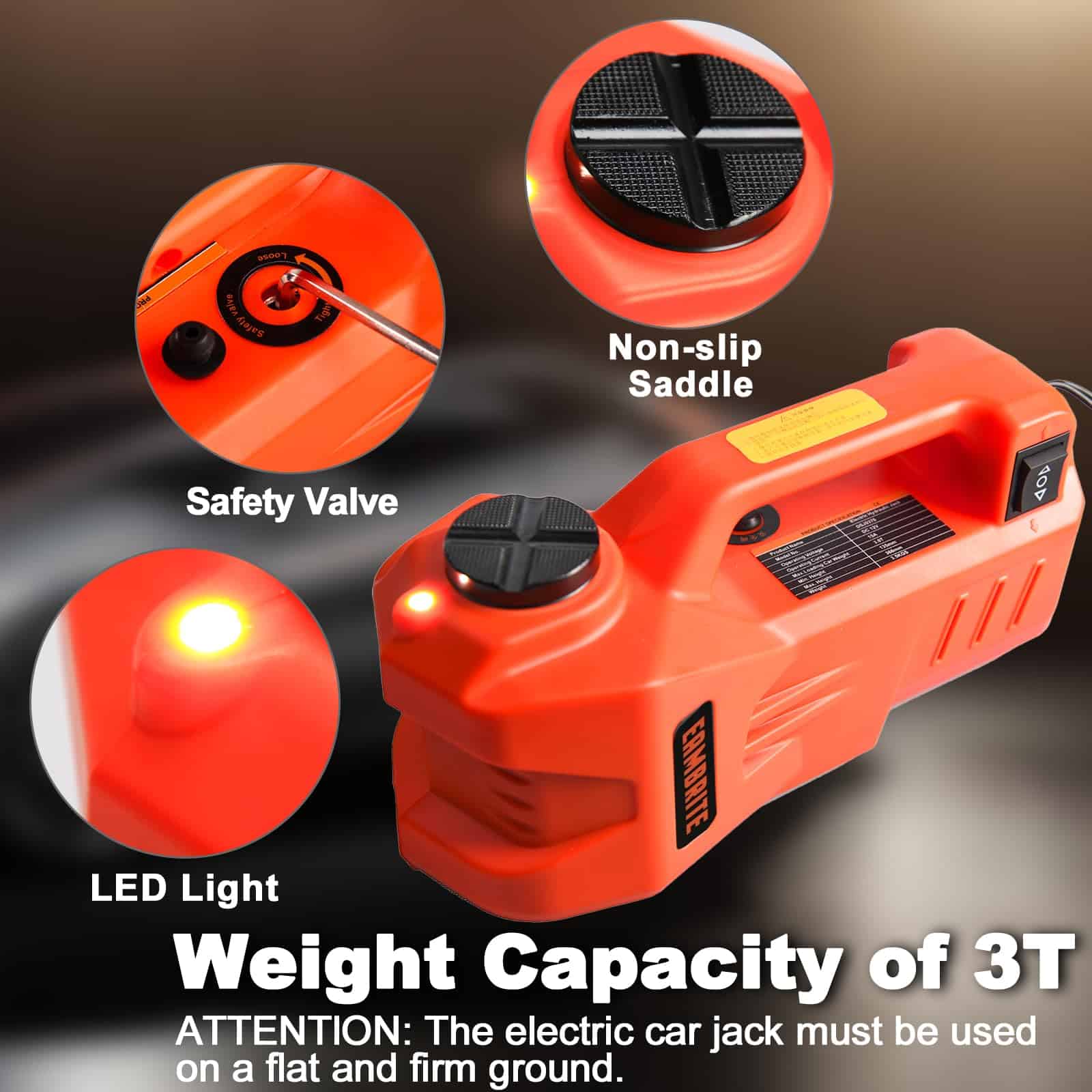 Eleva tu automóvil con facilidad y seguridad con el gato eléctrico hidráulico EAMBRITE de 3 toneladas. Con una capacidad nominal de 3 toneladas (6600 libras) y un rango de elevación de 5.3 pulgadas a 13.9 pulgadas, este gato es perfecto para automóviles, SUV, camiones y más. Equipado con una válvula de seguridad incorporada, el gato puede mantener la altura actual incluso si se queda sin energía repentinamente.