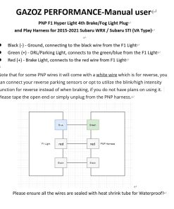 Este set es para la Luz de Freno F1 Hyper 4ta. con Arnés Plug and Play Para Subaru WRX STI 15-21 Carcasa Roja/Lente Clara JDM. DISEÑO FUNCIONAL: Dale a tu auto un nuevo aspecto. Actualiza la apariencia de tu Subie con esta deportiva luz de freno 3ra 4ta, Freno F1 Hyper intermitente en tu difusor trasero. Destacado con 15 LED’s Super Brillantes Cuando la luz intermitente F1 Hyper – 15 destellos cada vez que se pisa el pedal del freno. Función de Luz de Circulación Diurna (DRL) con Barra LED Blanca que se ilumina en Color Rojo. El kit completo incluye luz trasera de niebla LED, arnés de cableado, soporte de montaje trasero, tapas y tornillos. Incluye una tapa anodizada negra, pernos y arandelas allen de acero inoxidable, racor de drenaje de latón y manguera de silicona de alta calidad para una instalación limpia y sencilla. Puede utilizar su hardware y arneses de cableado existentes. Ahorre tiempo y dinero con este arnés de ajuste directo Plug and Play en lugar de comprar algo de mala calidad de Vinstar China. Gazoz Performance ofrece garantía para estas piezas de automóvil que incluye todo, desde la instalación hasta el soporte técnico de por vida. La empresa se esfuerza por producir accesorios de automóvil de calidad estampando sus diseños de marca en cada artículo. Especificación del Producto: Hecho en Taiwán – Nuestros productos son más confiables que los de Vinstar China que venden calidad deficiente más cara – Evite el apoyo a China. Certificación E-Mark y SAE – Producto legal en carretera. Instalación Plug and Play. Soporte de Montaje OEM de Subaru. Hardware de Montaje. Instalación: Instalación Plug and Play según colores de cableado. Compatible con Subaru WRX 2015-2021. Subaru STI 2015-2021. Subaru Impreza WRX STI Sedan GRB 2011-2014. Subaru Impreza WRX 2011-2014.