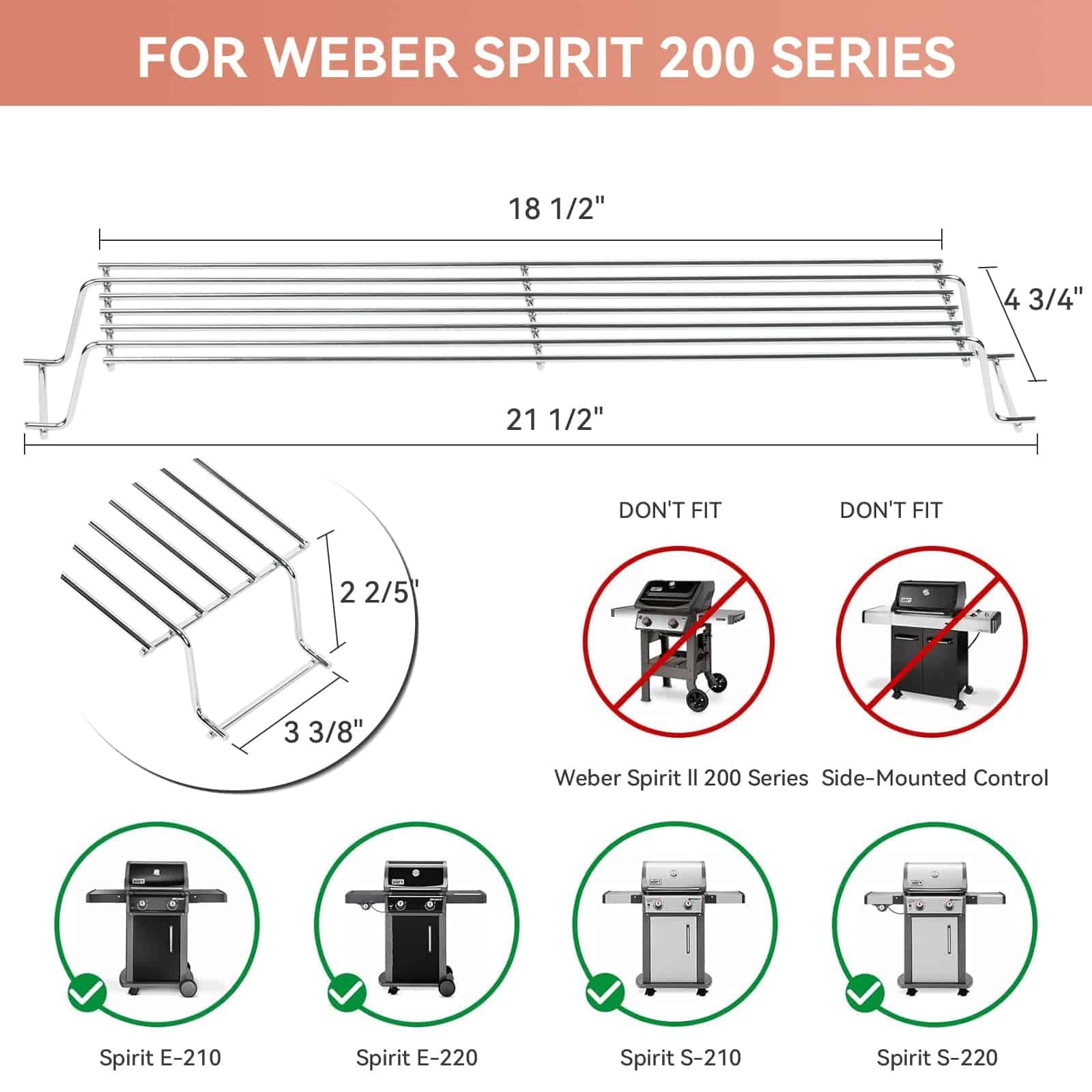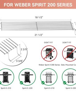 1. Para las parrillas Weber Spirit 200 Series, Weber Spirit I & II 200 Series Grills (2013 en adelante), Weber Spirit I E210, Spirit E220, Spirit S210, Spirit S220; Se adapta a las Weber GS4 Spirit II E210, E220, S210, S220; Para algunas parrillas Weber: 44000001, 44010001, 44020001, 44030001, 44060001; 44070001, 48000001, 48010001, 48070001. También se ajusta a la serie Spirit II 200, spirit ii e-210 e-220 spirit ii s-210 spirit s-220 Número de pieza de repuesto: Weber 69866, 7640, 67026.