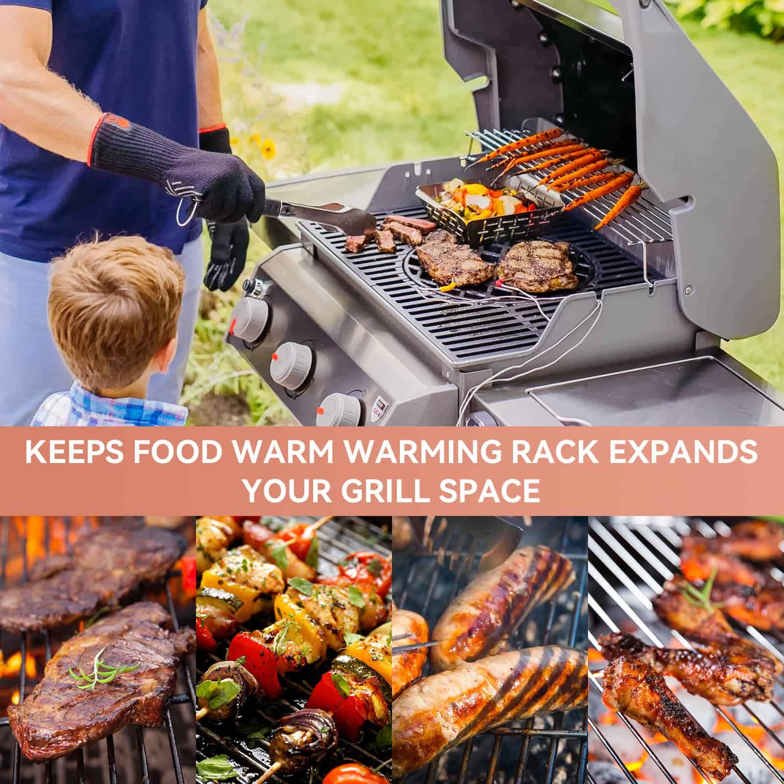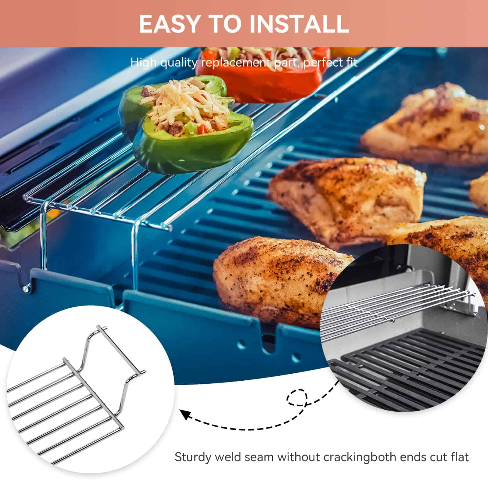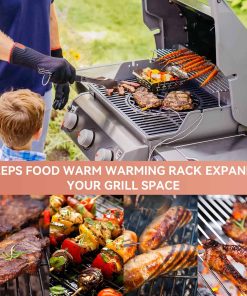 4. Aumenta las Áreas de Cocción Simplemente aumenta tu espacio para asar agregando esta rejilla de la parrilla al interior de tu parrilla. Elección perfecta cuando se necesita espacio adicional. Como extensión, la rejilla de calentamiento amplía el espacio de cocción, mejorando tu experiencia de barbacoa. Fácil de instalar La instalación de la parrilla de calentamiento de la parrilla solo lleva unos minutos, lo cual es muy simple. Basta con un poco de presión en el lado para colocarlo en la parrilla de manera apretada.