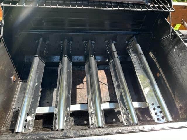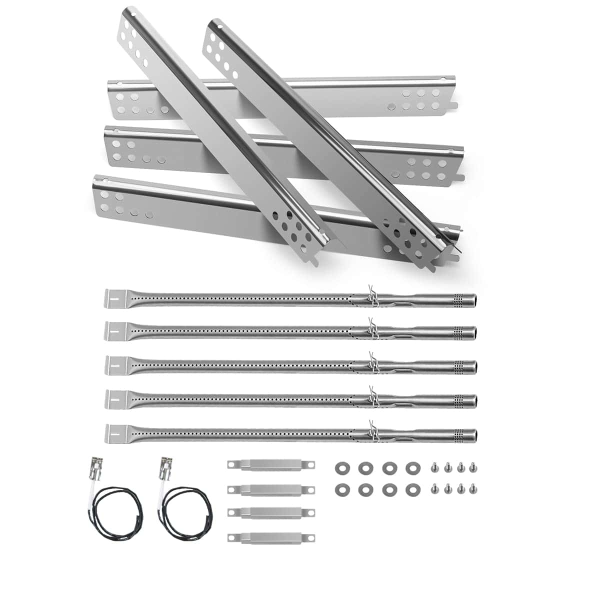 3. DIMENSIONES: Quemador de acero inoxidable para parrilla 17-3/4″ x 3/5″; Número original de las piezas: G470-5200-W1, G321-4C00-W1; La dimensión de las placas de calor de acero inoxidable es 16 15/16″ X 2 1/12″; Número original de las piezas: G470-0004-W1, G470-0004-W1A; El tubo de entrecruzamiento ajustable se puede ajustar de 5 a 8 pulgadas, lo suficientemente largo para adaptarse a su parrilla. Número original de las piezas: G432-001D-W1
