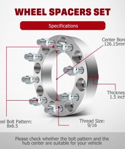 Estos separadores de rueda aumentarán la base de la rueda de tu vehículo, aumentando la estabilidad y resistencia al vuelco lateral. Estos separadores de rueda aumentan el espacio de la llanta al chasis para permitir la instalación de kits de elevación / descenso y llantas más anchas / grandes de alta tracción. Fácil de instalar, simplemente atornilla el separador de rueda a tu eje, luego atornilla la llanta al separador. Especificaciones — Espesor: 1.5″/38mm — Patrón de Birlos del Vehículo: 8×6.5/8×165.1 — Patrón de Birlos de la Llanta: 8×6.5/8×165.1 — Tamaño de la Rosca: 9/16″ — Agujero Central: 4.97″/126.15mm Vehículos Compatibles de Referencia 1975-1997 – para – F250 F350 (Solo con rosca de 9/16″) 2007-2014 – para – E150 (Solo con rosca de 9/16″) 1992-2014 – para – E250 E350 (Solo con rosca de 9/16″) 1975-1986 – para K20 K30 C20 C30 1975-1988 – para J20 Si no estás seguro de si este artículo es compatible contigo, mándanos un mensaje con el año, marca y modelo de tu vehículo, encontraremos el artículo que necesitas. Notas Importantes — Verifica que el conteo de birlos, el diámetro del círculo de birlos, el agujero central y el tamaño del birlo coincidan con tu vehículo antes de ordenar. — Este kit incluye todas las tuercas de birlo utilizadas para montar los adaptadores. Debes usar tus birlos de stock para montar las llantas. — No se aceptan devoluciones o cambios una vez instalados. Recomendamos de manera enfática no instalar las tuercas con una llave de impacto, es mejor con una llave manual.