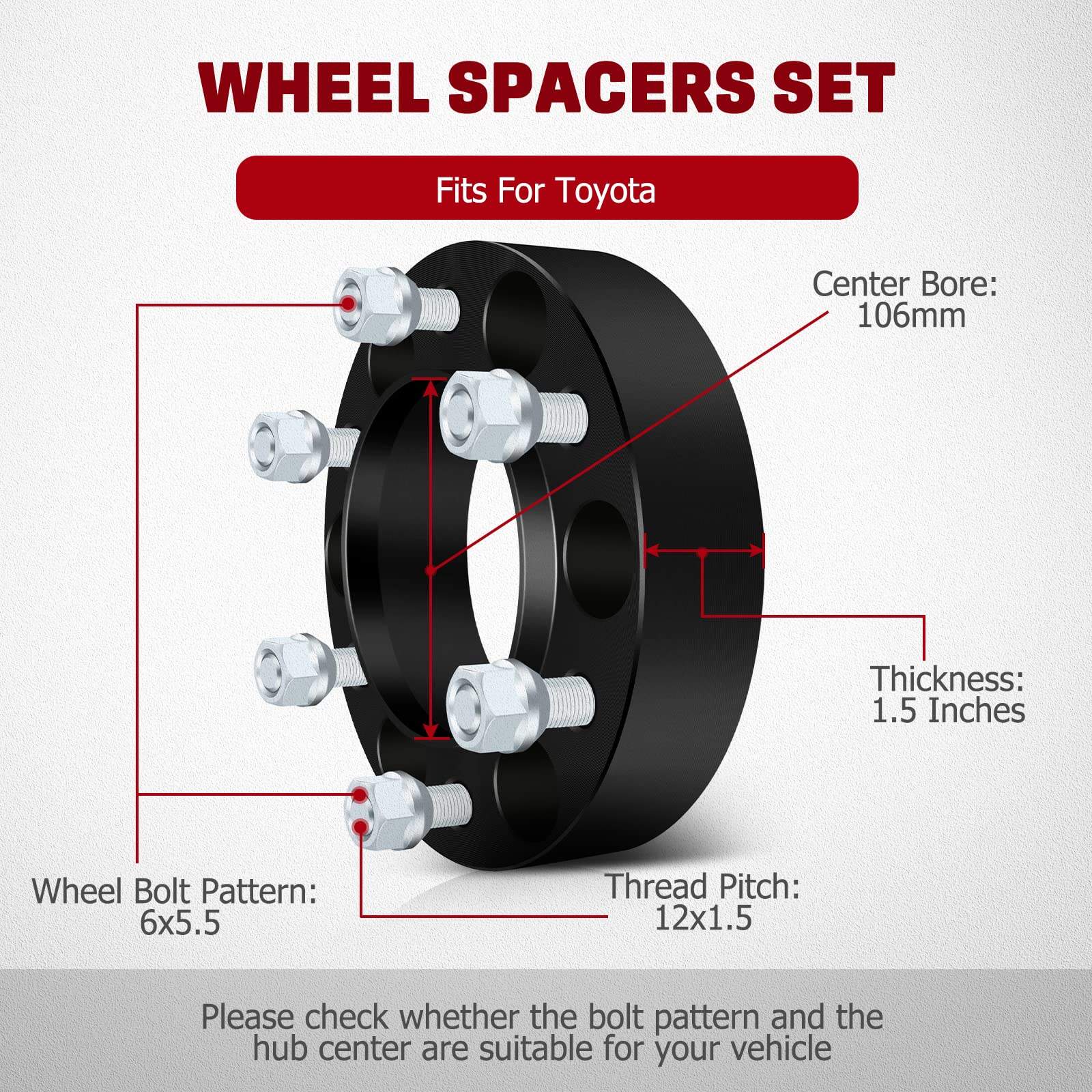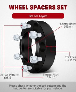 2. Parámetro de separadores de rueda – Grosor: 1.5 pulgadas / 38.1mm, Patrón de perno del vehículo: 6×5.5, Patrón de perno de la rueda: 6×5.5, Paso de rosca del perno: 12×1.5, Centro del cubo: 106mm.